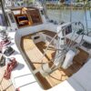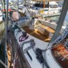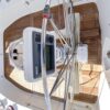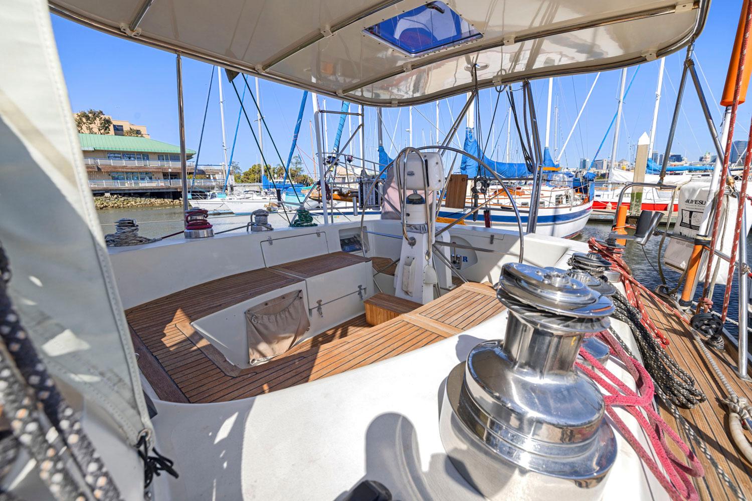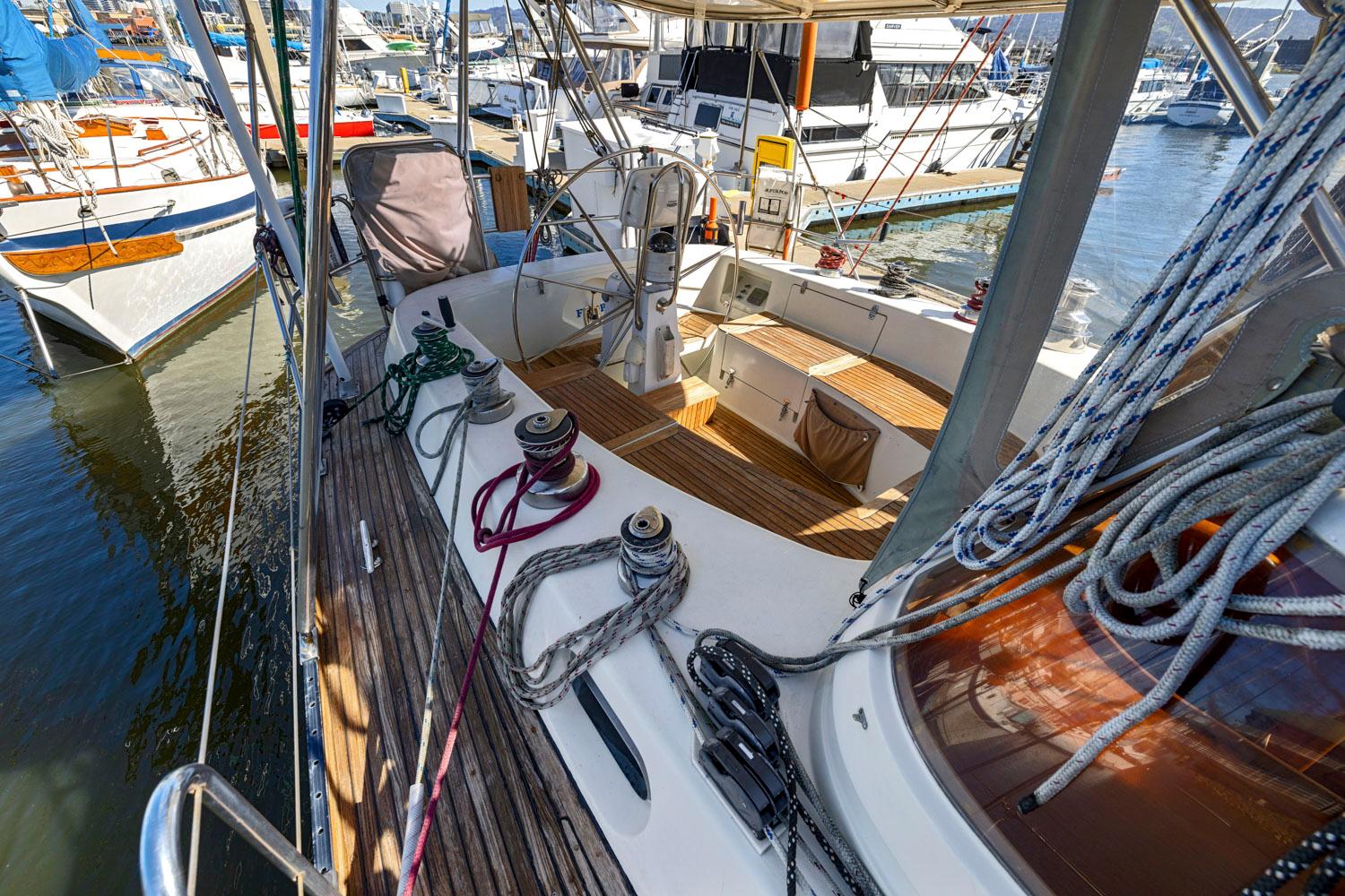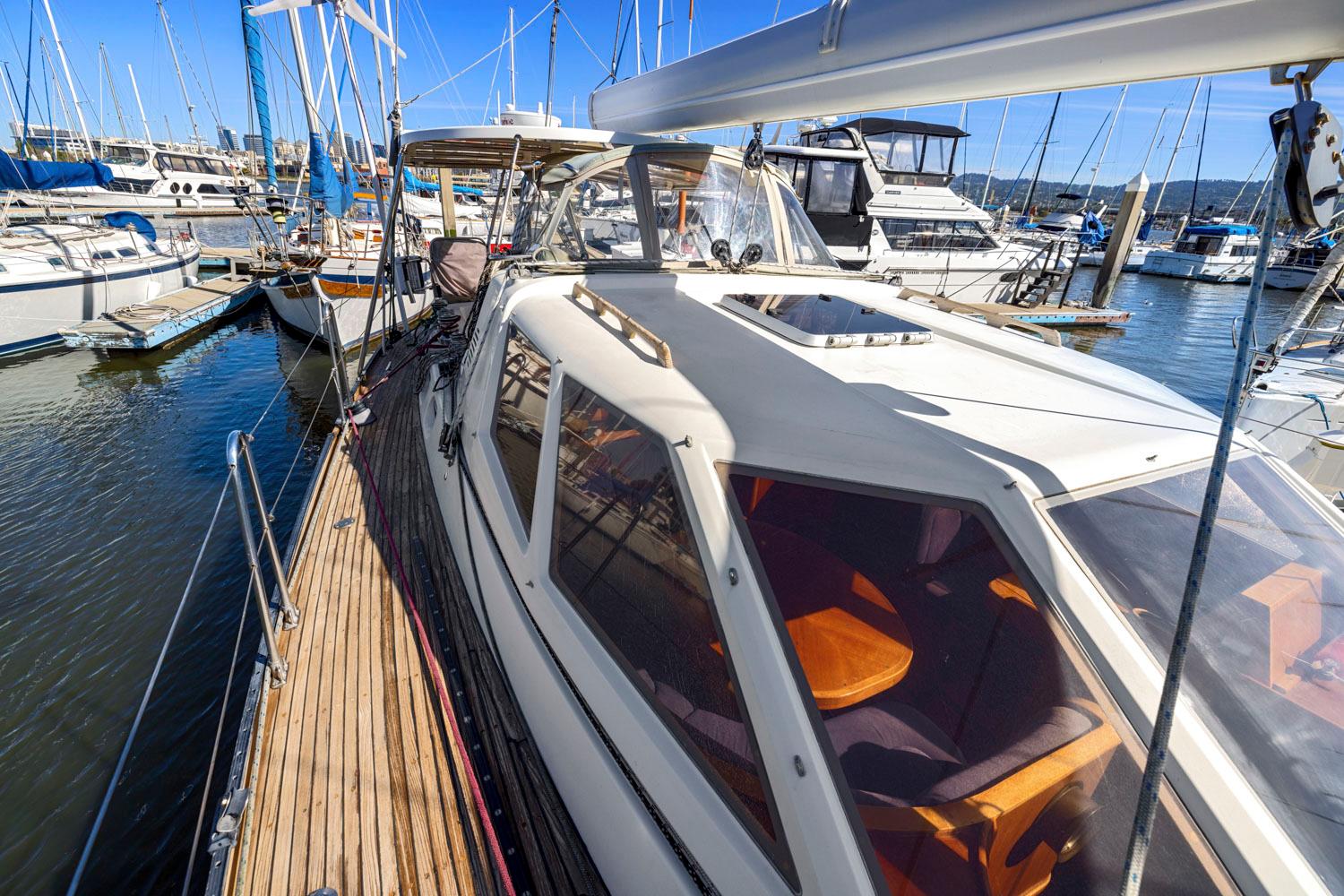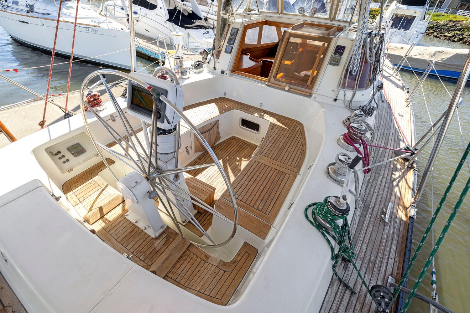 From the step-up stern, enter the aft cockpit with 58 inch stainless steel racing wheel, electronics on binnacle, FRP hard-top with Sunbrella canvas dodger and traditional companionway entrance.