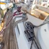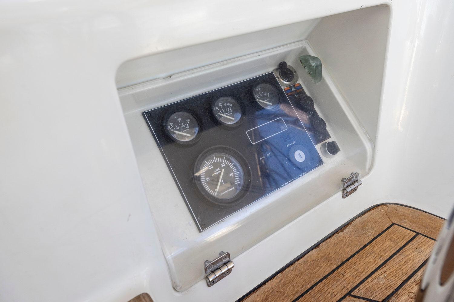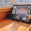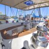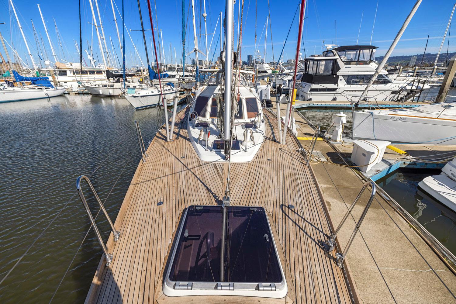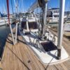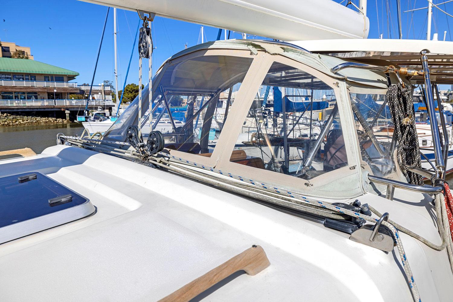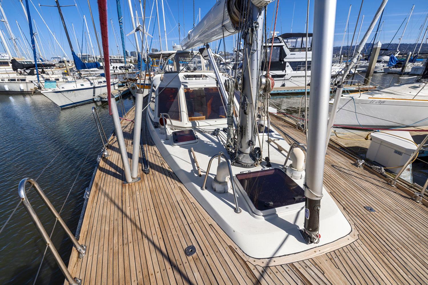 From the step-up stern, enter the aft cockpit with 58 inch stainless steel racing wheel, electronics on binnacle, FRP hard-top with Sunbrella canvas dodger and traditional companionway entrance.