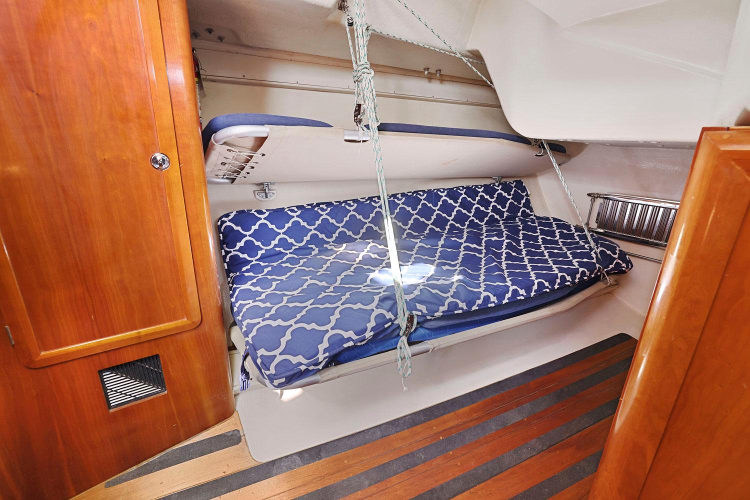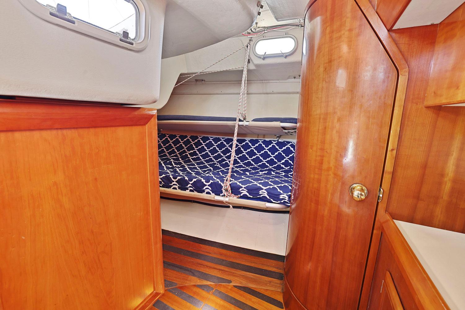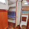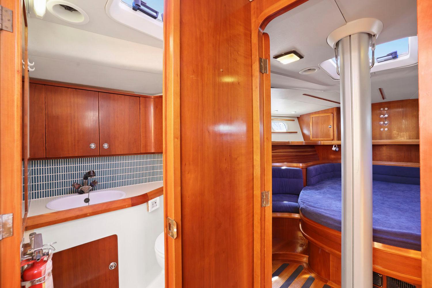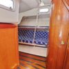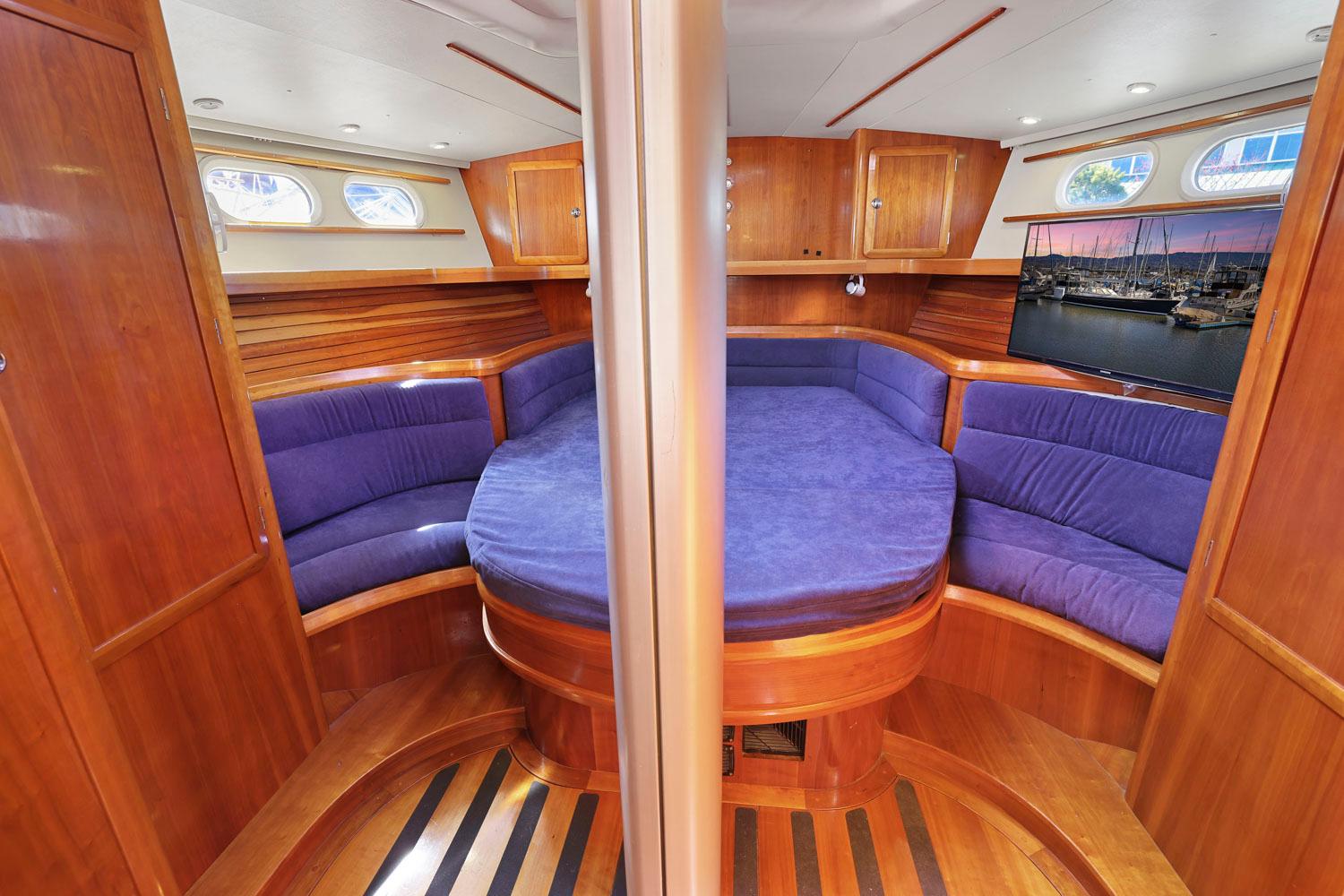 Accommodations include two double cabins and two heads. Behind the forward chain locker watertight bulkhead is the forward master cabin. This cabin has an center-line raised island queen bed with storage compartments under wood liner and shelves on the side. Port and starboard fixed side port lights and overhead hatch provide natural light. Port and starboard single settees and hanging lockers are fitted. A full bulkhead with doorway separates the master cabin from an enclosed head compartment fitted to port