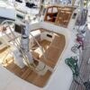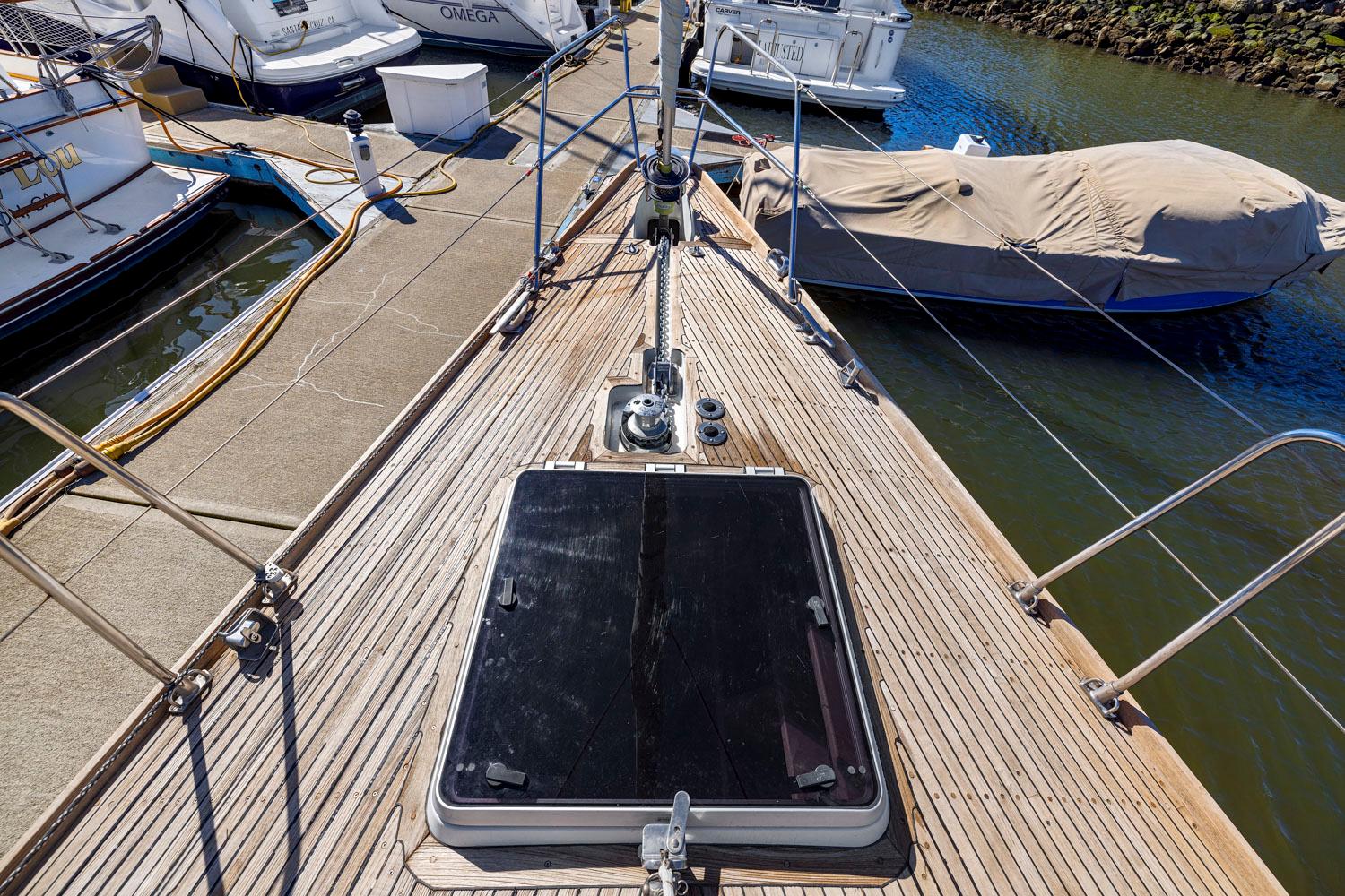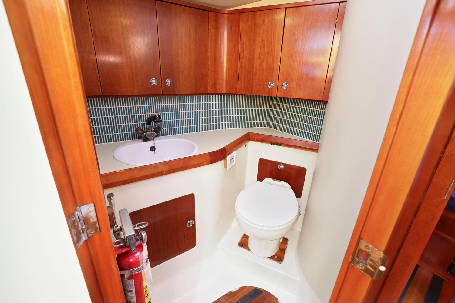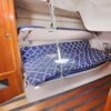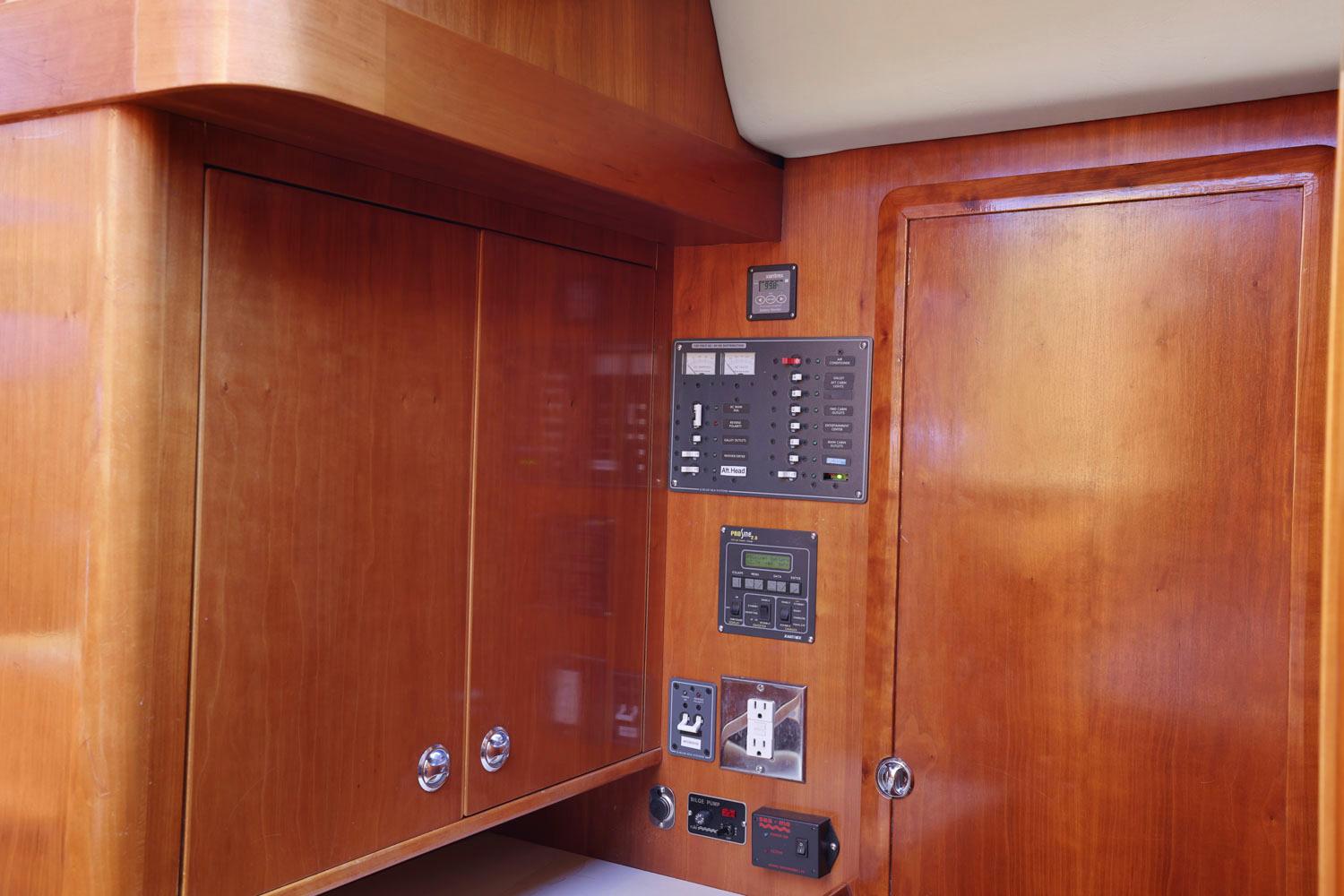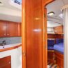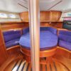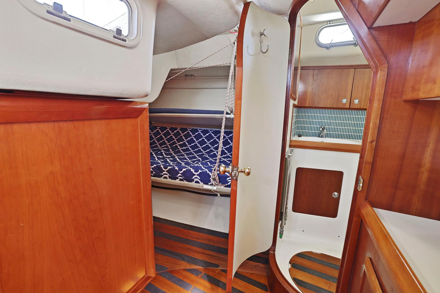 Accommodations include two double cabins and two heads. Behind the forward chain locker watertight bulkhead is the forward master cabin. This cabin has an center-line raised island queen bed with storage compartments under wood liner and shelves on the side. Port and starboard fixed side port lights and overhead hatch provide natural light. Port and starboard single settees and hanging lockers are fitted. A full bulkhead with doorway separates the master cabin from an enclosed head compartment fitted to port