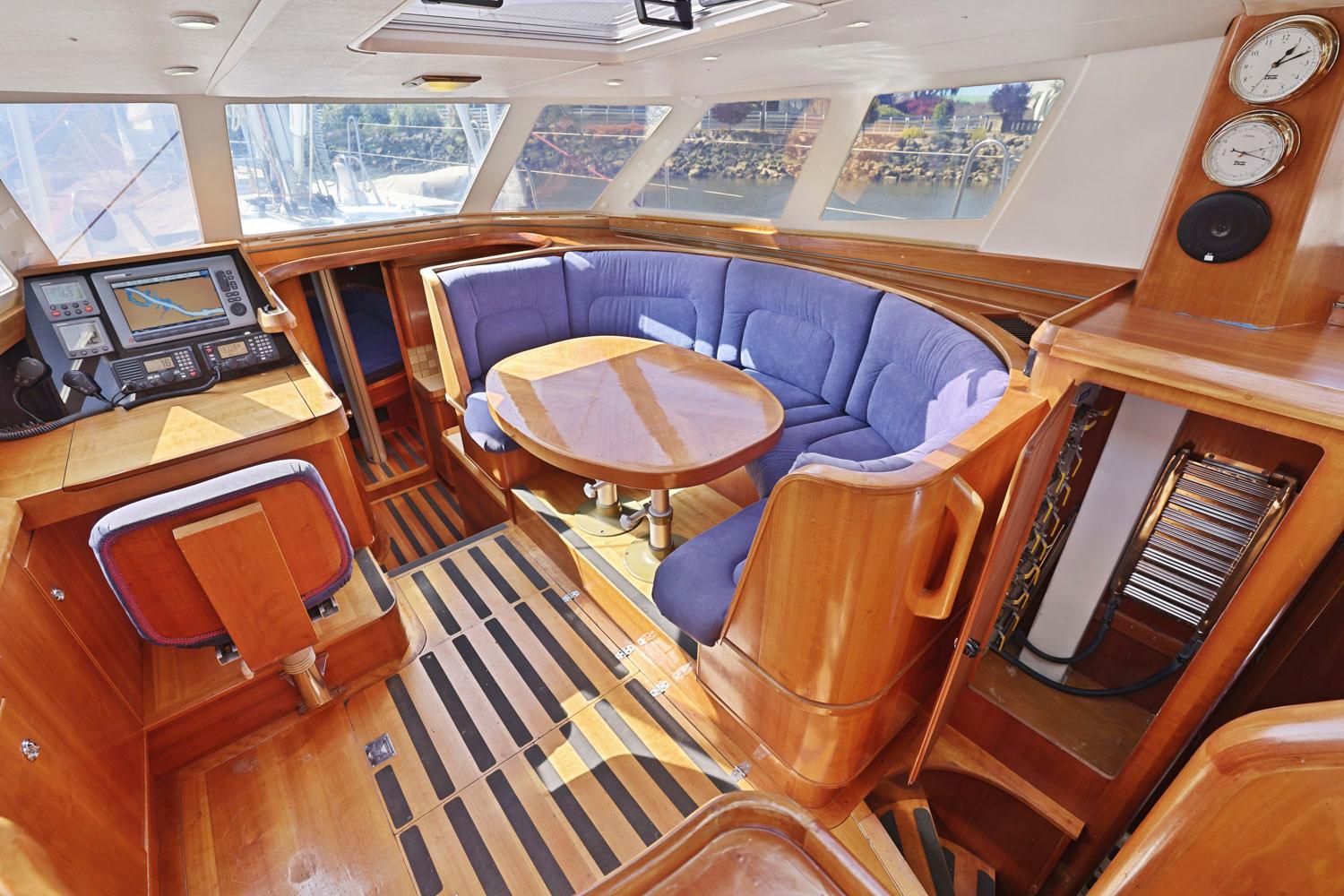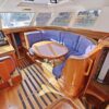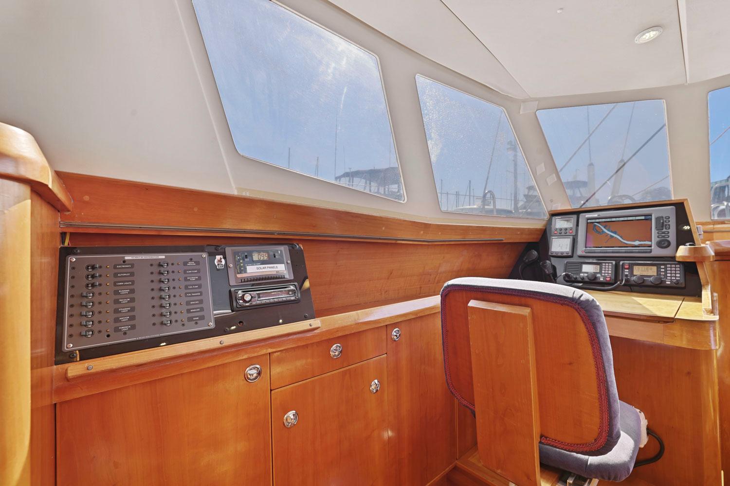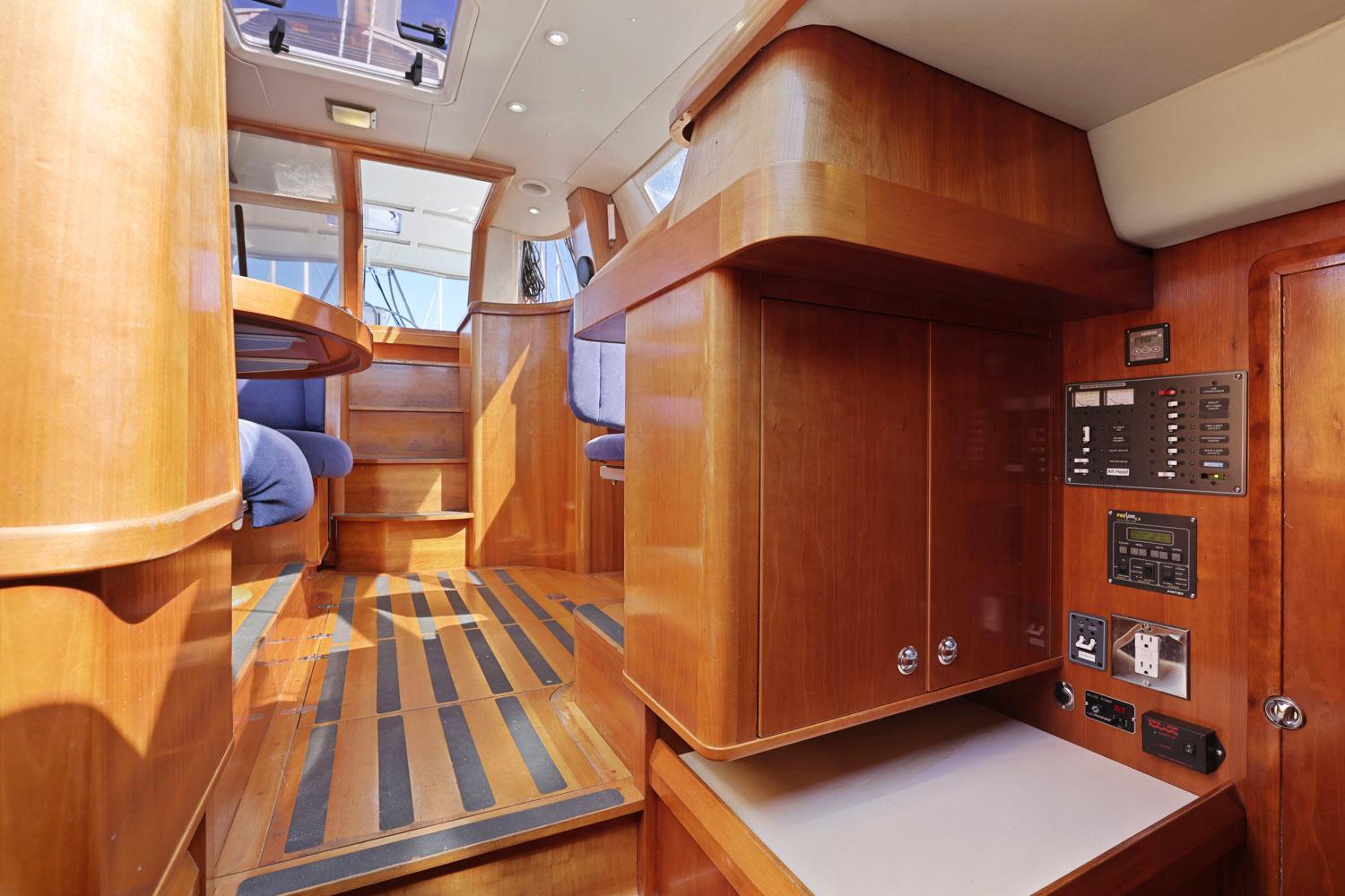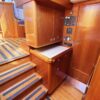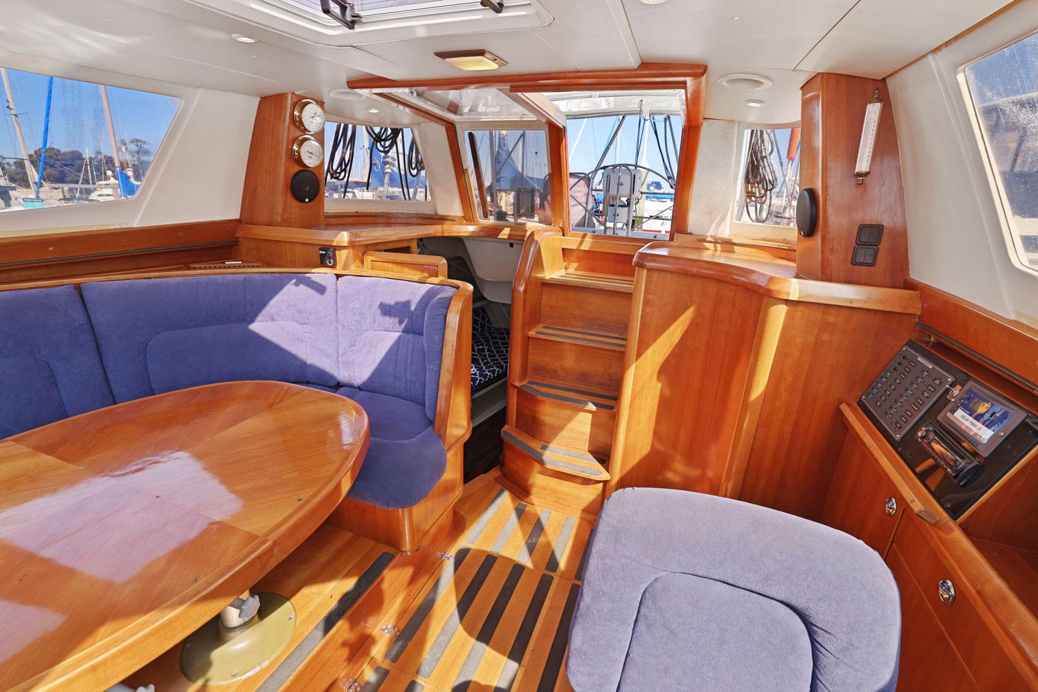 Heading up four removable steps (with house batteries under) one enters the central main salon. A raised U-shaped dinette arrangement is placed to starboard with comfortable seating for four and a high/low table mounted on double pedestals. Across the way is a forward-facing, sit-down navigation station of reasonable size with side storage lockers and drawers behind. The head room in the main salon is over 6 ft.