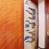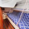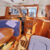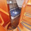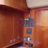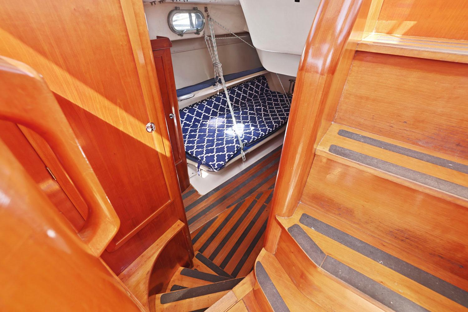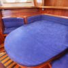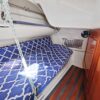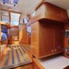Heading aft down and after to a starboard rounded stairwell is the aft crew compartment fitted with port and starboard pipe berths and separated by a central box housing a washer and dryer and space for a generator. Hanging locker and enclosed head locker separated by a bureau are fitted. The interior has cherry wood cabinetry and trim, white vinyl overhead with halogen cabin lighting and royal blue velour cushions