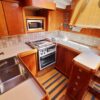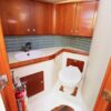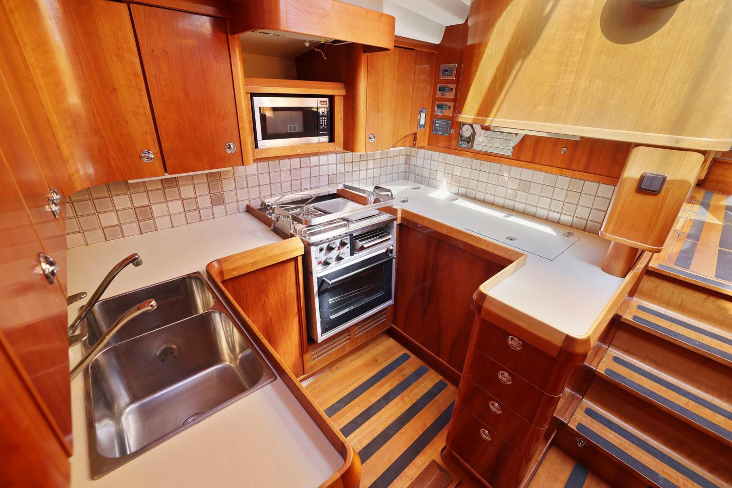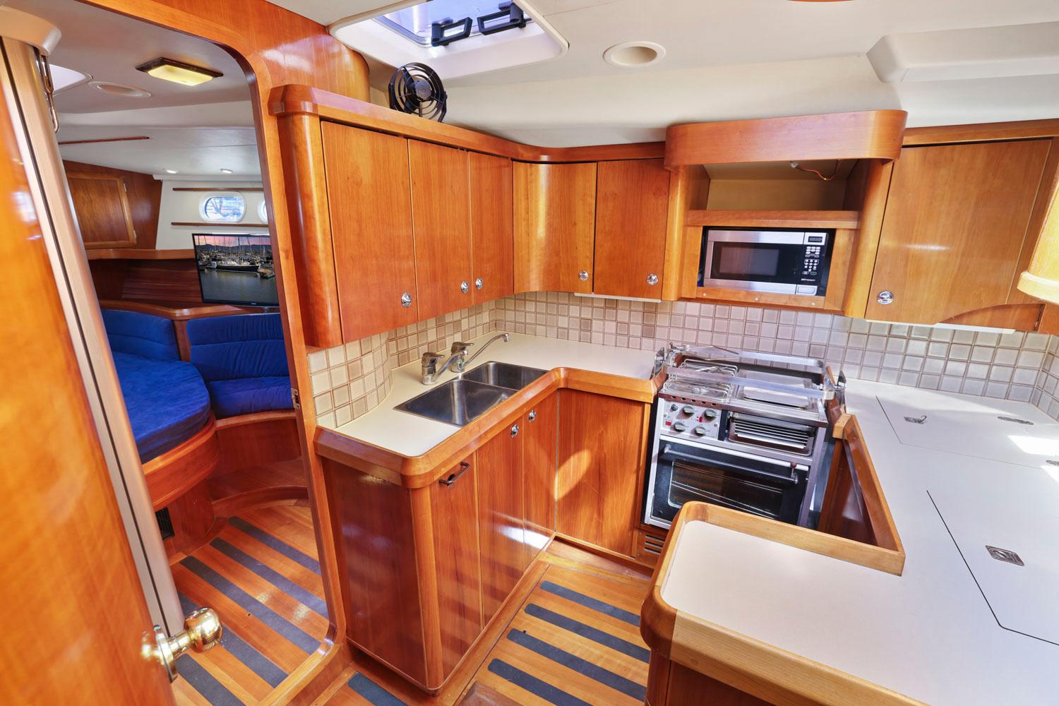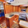 The galley is forward of the salon to starboard with exceptional counter space, storage area and freezer & refrigeration capacity. Countertops are white Corian.