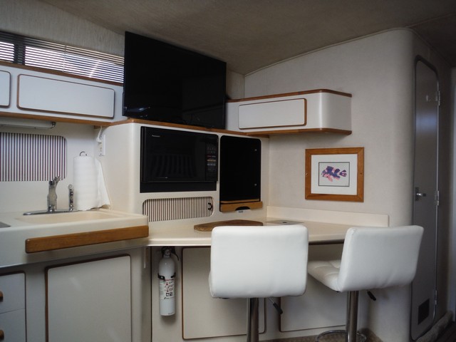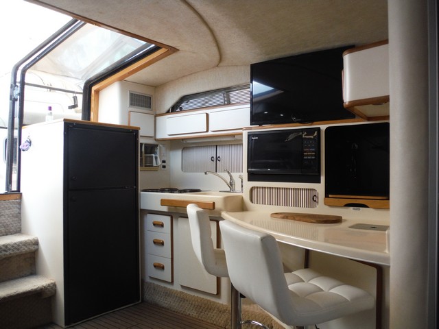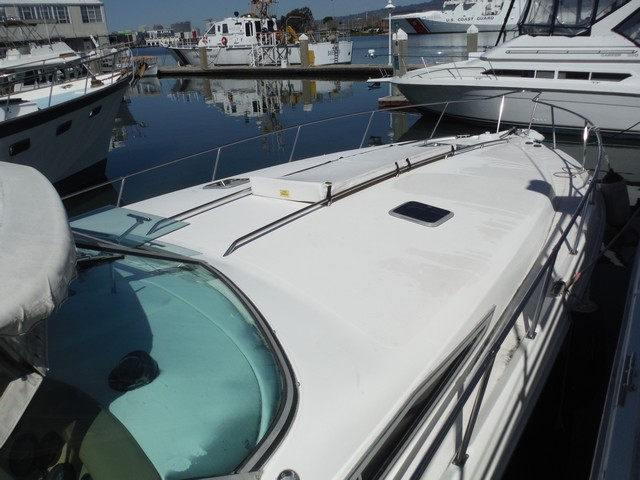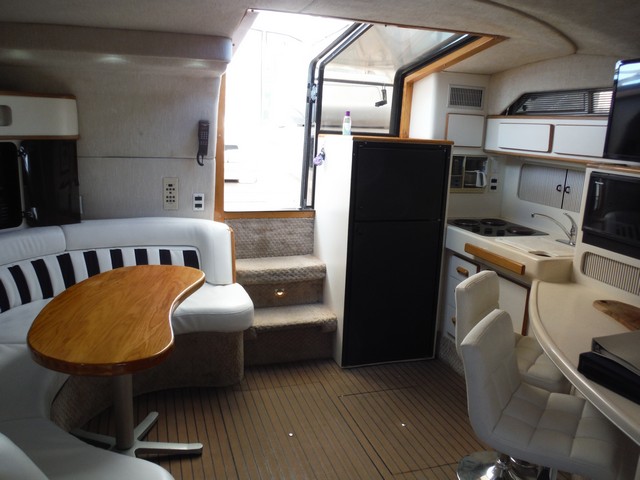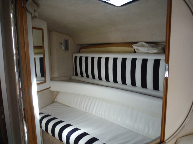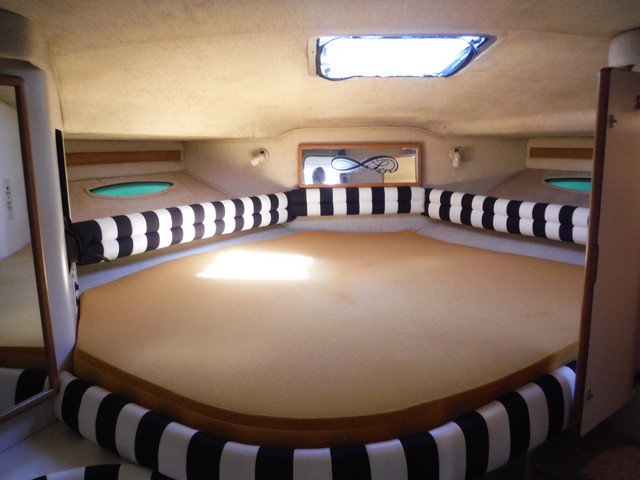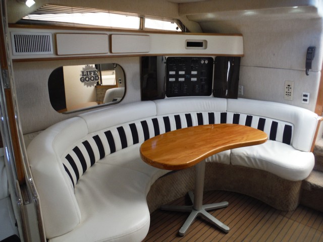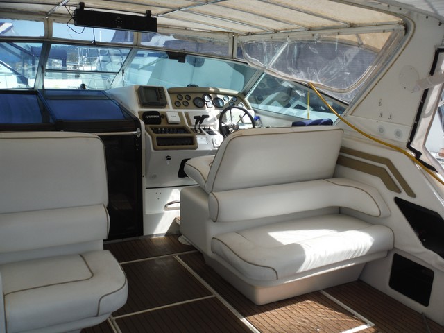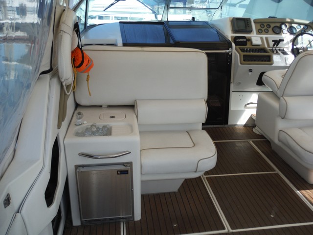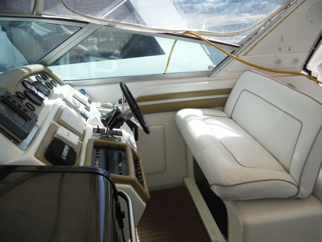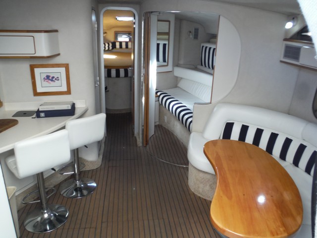 This Sea Ray Express 400 not only has a fast planning hull with twin Caterpillar diesel engines, the living quarters inside the cabin are spacious, comfortable and elegant.