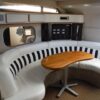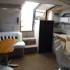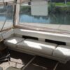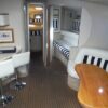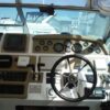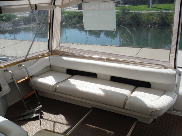 Enter the cockpit built for socializing with wet-bar, table, bench seating and canvas bimini set on stainless steel stanchions and FRP radar arch. Helm station with array of gages and electronics is to starboard.
