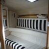 Four steps down leads into the main salon, to port: full galley, enclosed head with shower, master stateroom. To starboard: arced bench settee/dinette that converts to a double, second settee converts to bunk-berth singles, enter master stateroom with queen sized berth.