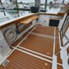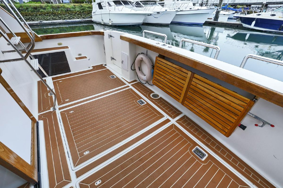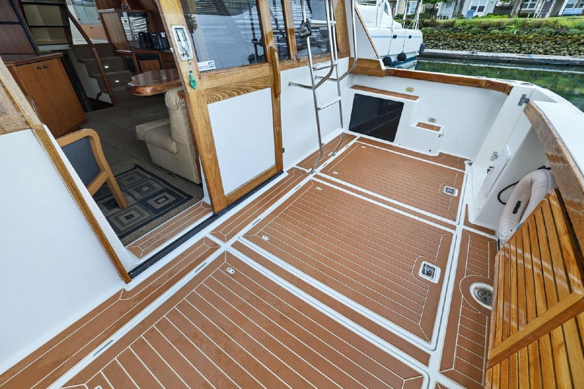 - Lots of factory teak and added teak paneling in lower hall, and around inside salon and outside back deck.