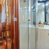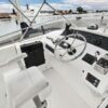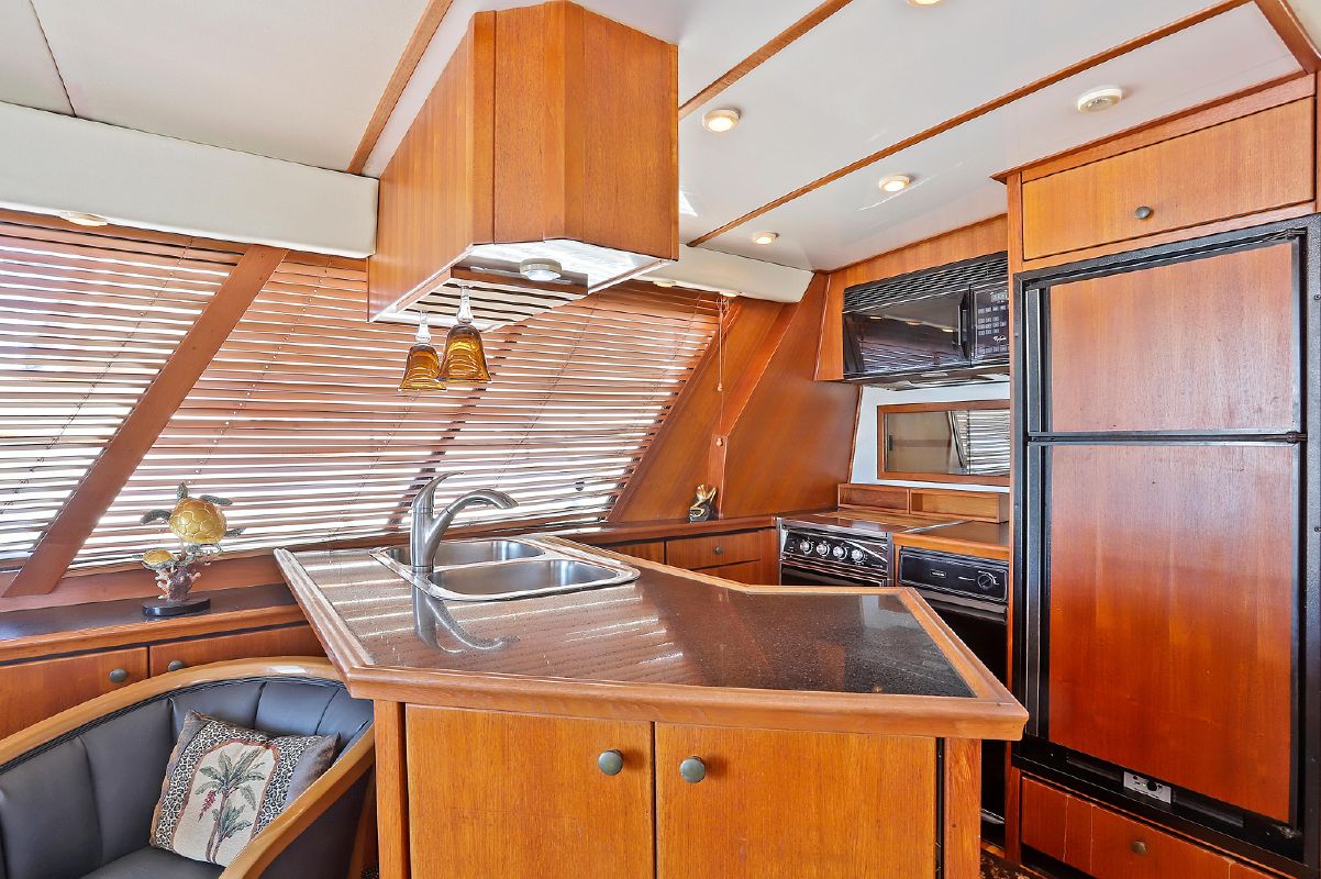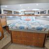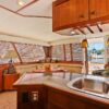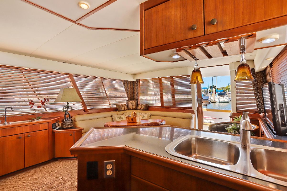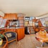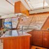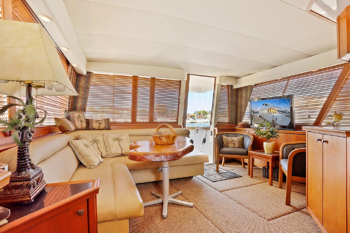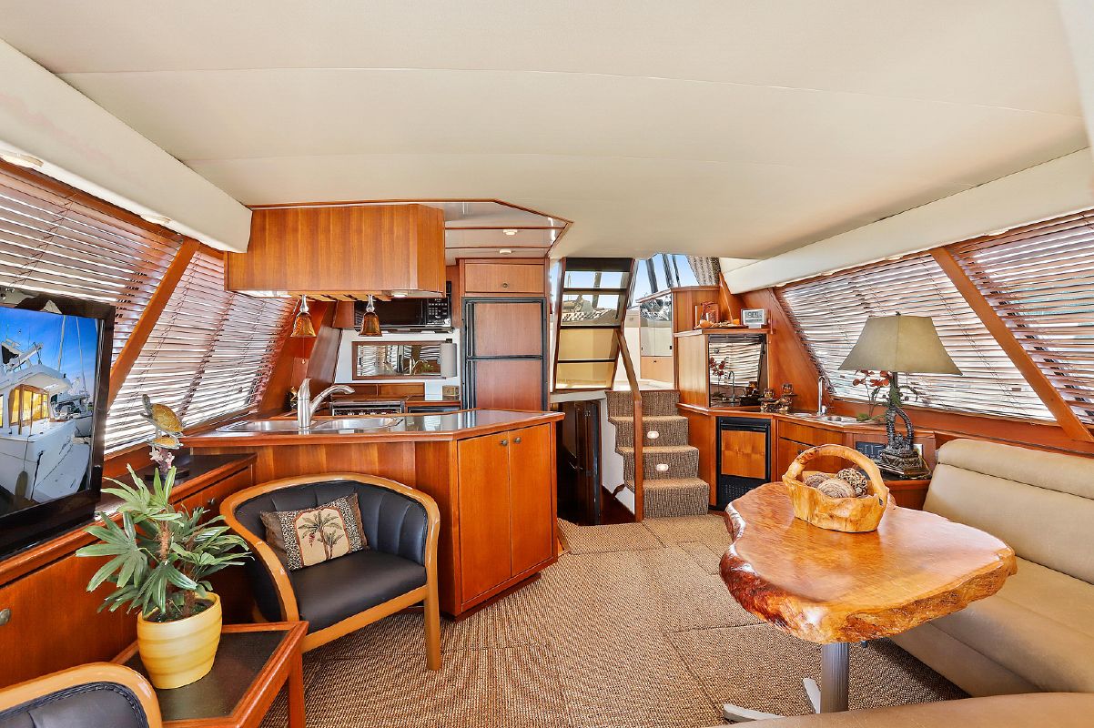 Entering the salon through the teak & glass sliding door from the covered aft-deck, you will find wrap-around seating and a custom burl wood table starboard aft, 2 lounge chairs and a table to port, galley port forward, wet bar starboard forward, stairs down to the guest companionway forward and stairs to the raised pilothouse starboard forward.