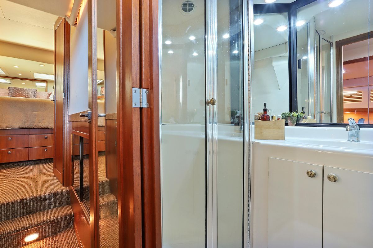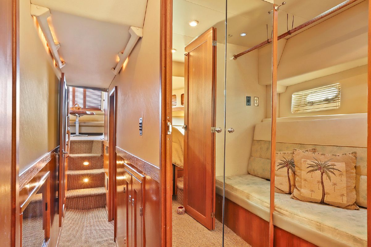 Step down into the guest companionway and guest head and enclosed shower to starboard, guest stateroom to port, a guest stateroom that has been converted into a hanging closet port forward and the master stateroom forward with ensuite head and enclosed shower.