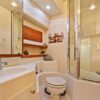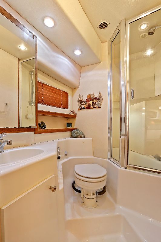 - Fresh water Vacuflush toilet in aft head and saltwater toilet in forward head (no need to use fresh water for sea trips).