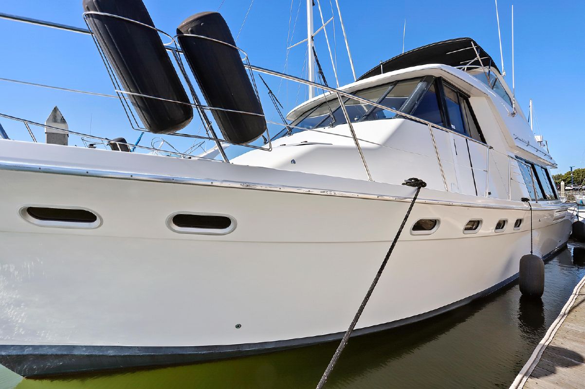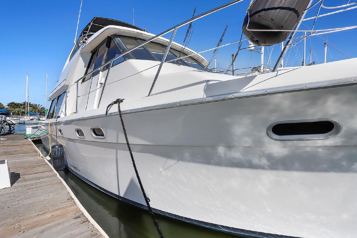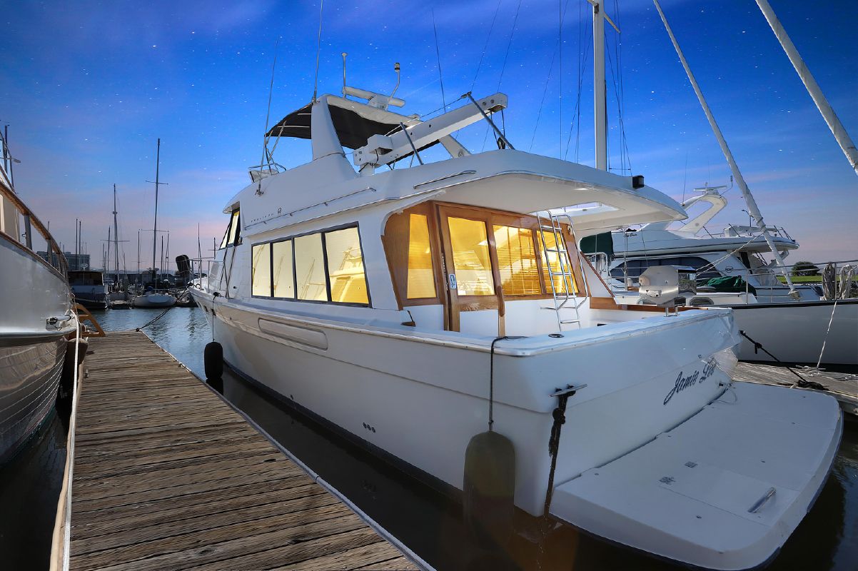 ODIE is a classic 47′ Bayliner 4788 raised pilot-houe motoryacht with 3 staterooms, 2 heads, fuel efficient, low hour Hino 310 hp main engines and low hour Westerbeke generator.