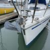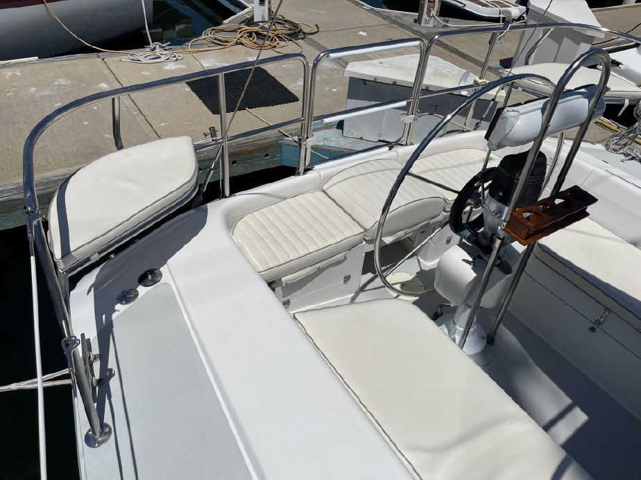 - Stainless steel stanchions with double lifelines, stainless steel bow pulpit and split stern rail with built-in “best seats in the house”.