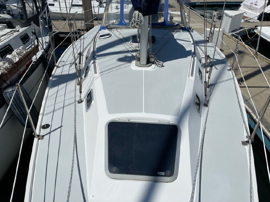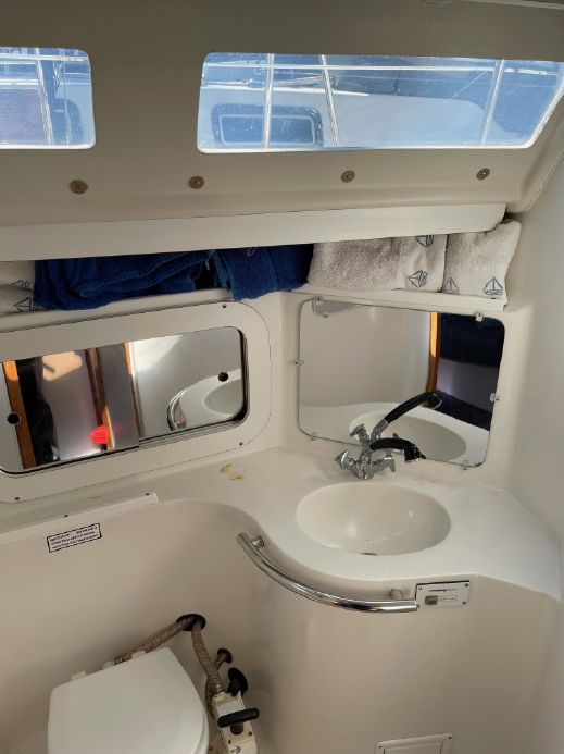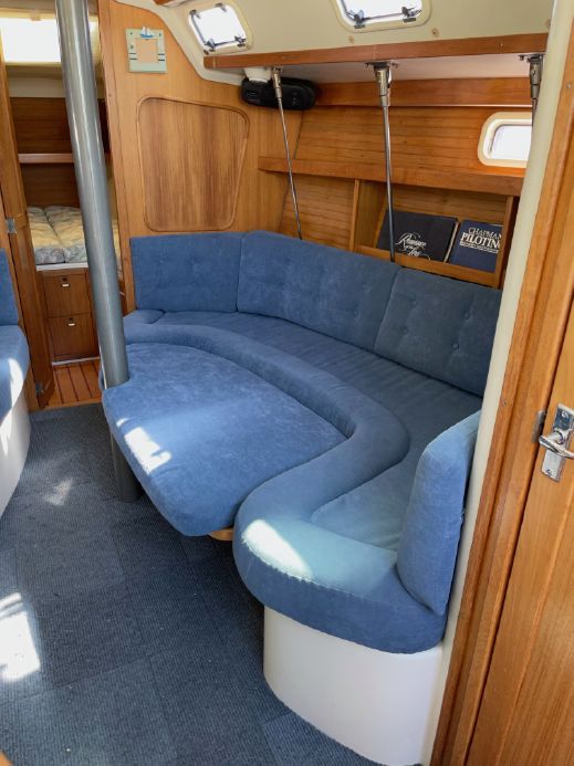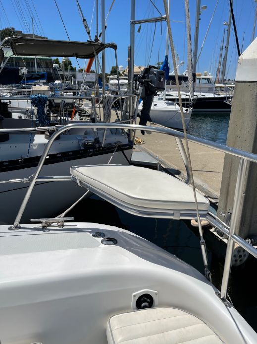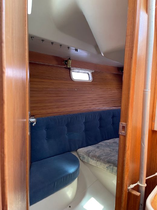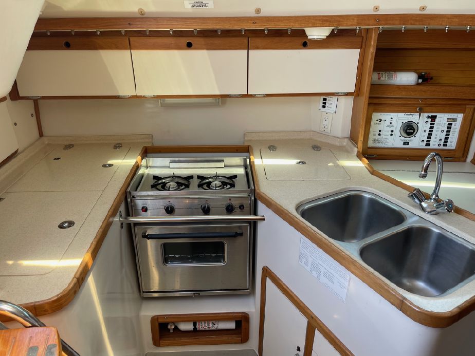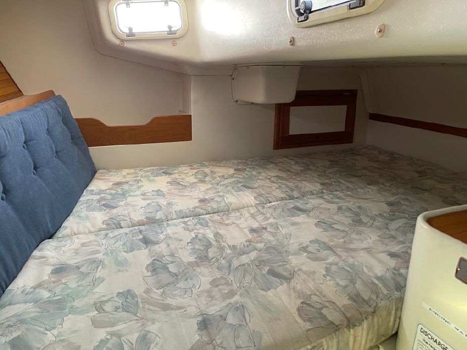 What a sleeper! AMANDA ROSE is a fast boat with plenty of comfort or a cruiser with a surprising turn of speed. When Catalina redesigned their 32 footer they added beam in the stern. This makes for a very comfortable open cockpit with everything at hand. It also makes room for a very large transverse berth in the aft cabin. They also improved the rig and foils which adds up to a fast, maneuverable, sailor. On deck there is a plow anchor on a roller with a large deck locker for chain and rode. You will also find a backup Danforth anchor in a fitted slot in the locker. There is a 90% jib on a roller furler. Moving aft is the mast with double spreaders and inboard shrouds. The boom is managed by a solid vang/kicker and the main sail features dutchman flaking. The traveller is forward of the dodger/ companionway hatch. All halyards, sheets, and reefs are led aft and are well served by four two-speed, self-tailing, Lewmar winches on the cabin top and cockpit coaming. The cockpit features a large stainless steel wheel with all engine controls, instruments, and compass on the binnacle. There are also drink holders and a folding teak table attached to the binnacle. There is plenty of room for six or more adults in the nicely cushioned cockpit and the best seats in the house are the two attached to the stern rail. The decks are surrounded by double lifelines and there is a nicely sized swim platform with a ladder that forms a central gate from the cockpit. There is also a hot/cold pressurized shower adjacent to the swim platform. Going below; the galley is to port and features plenty of counter space and storage. There is a large top loading refrigerator and two burner propane stove/oven. The double sink has pressurized hot and cold water. To starboard is access to the aft berth. Just forward is the head with marine toilet, vanity sink and hand held shower. Forward of the galley is the nav desk that cleverly uses the end of the port single settee/berth as a seat. Opposite is a c-shaped settee that converts to a double berth when the central table is lowered and the included cushion is in place. All the way forward is the V-berth with storage beneath. Pass-throughs give a an open feeling to the salon but in-place make the v-berth a quiet and private place. With the speed and space of a larger boat AMANDA ROSE is a great sailing boat and at this price; a true bargain.