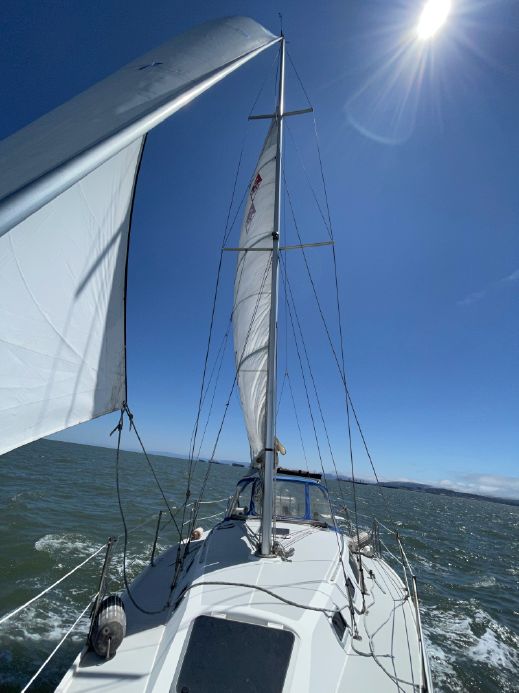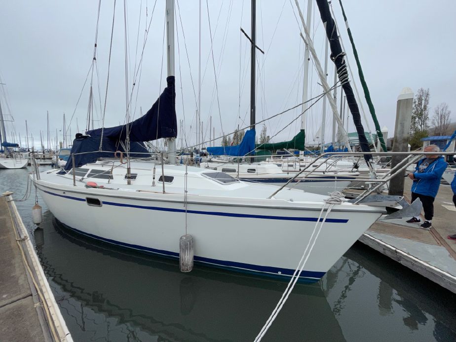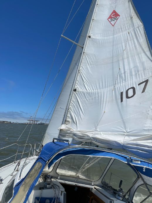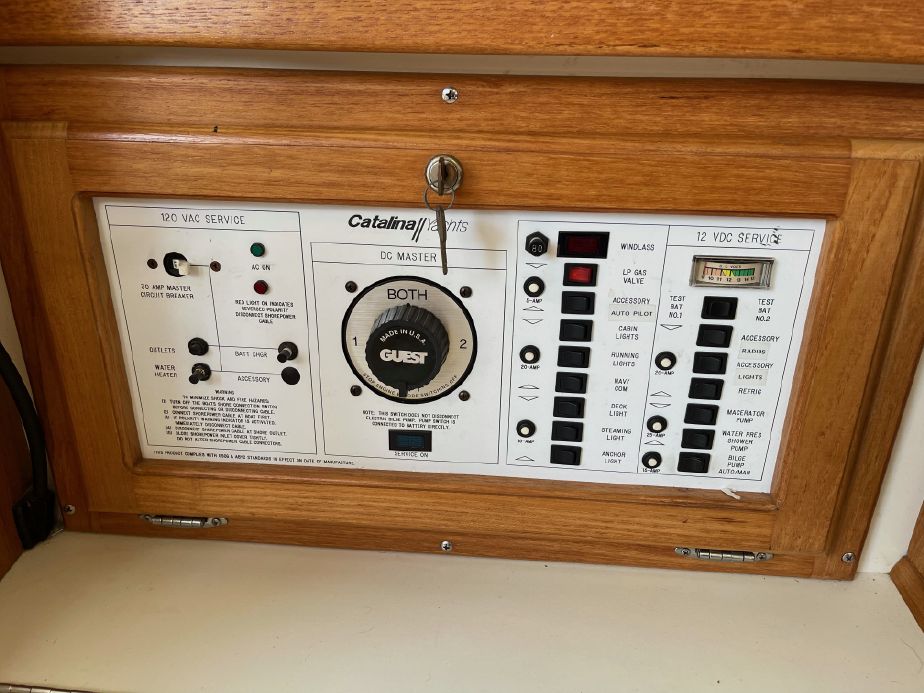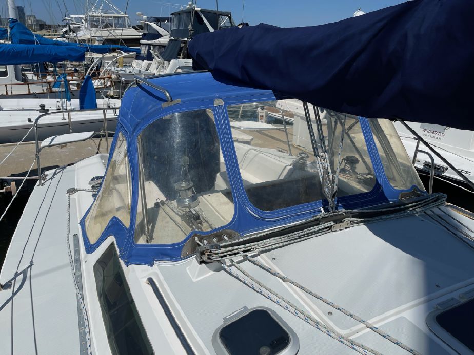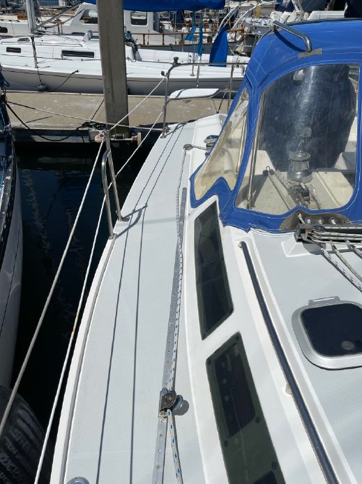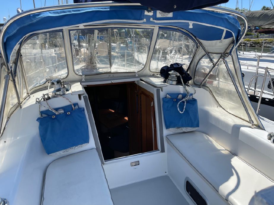 What a sleeper! AMANDA ROSE is a fast boat with plenty of comfort or a cruiser with a surprising turn of speed. When Catalina redesigned their 32 footer they added beam in the stern. This makes for a very comfortable open cockpit with everything at hand. It also makes room for a very large transverse berth in the aft cabin. They also improved the rig and foils which adds up to a fast, maneuverable, sailor. On deck there is a plow anchor on a roller with a large deck locker for chain and rode. You will also find a backup Danforth anchor in a fitted slot in the locker. There is a 90% jib on a roller furler. Moving aft is the mast with double spreaders and inboard shrouds. The boom is managed by a solid vang/kicker and the main sail features dutchman flaking. The traveller is forward of the dodger/ companionway hatch. All halyards, sheets, and reefs are led aft and are well served by four two-speed, self-tailing, Lewmar winches on the cabin top and cockpit coaming. The cockpit features a large stainless steel wheel with all engine controls, instruments, and compass on the binnacle. There are also drink holders and a folding teak table attached to the binnacle. There is plenty of room for six or more adults in the nicely cushioned cockpit and the best seats in the house are the two attached to the stern rail. The decks are surrounded by double lifelines and there is a nicely sized swim platform with a ladder that forms a central gate from the cockpit. There is also a hot/cold pressurized shower adjacent to the swim platform. Going below; the galley is to port and features plenty of counter space and storage. There is a large top loading refrigerator and two burner propane stove/oven. The double sink has pressurized hot and cold water. To starboard is access to the aft berth. Just forward is the head with marine toilet, vanity sink and hand held shower. Forward of the galley is the nav desk that cleverly uses the end of the port single settee/berth as a seat. Opposite is a c-shaped settee that converts to a double berth when the central table is lowered and the included cushion is in place. All the way forward is the V-berth with storage beneath. Pass-throughs give a an open feeling to the salon but in-place make the v-berth a quiet and private place. With the speed and space of a larger boat AMANDA ROSE is a great sailing boat and at this price; a true bargain.