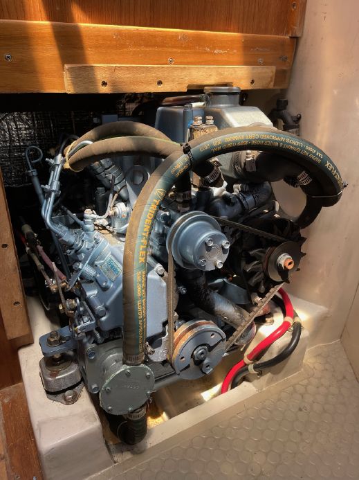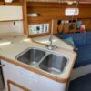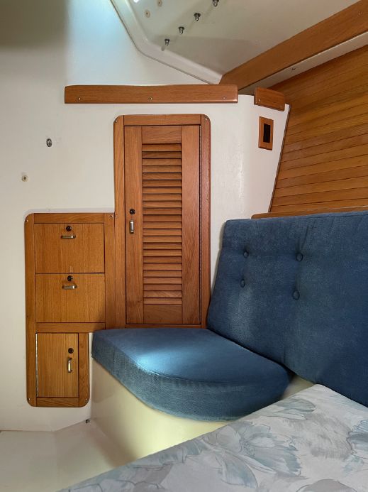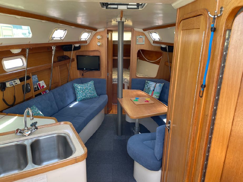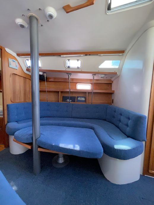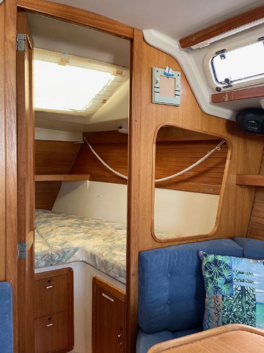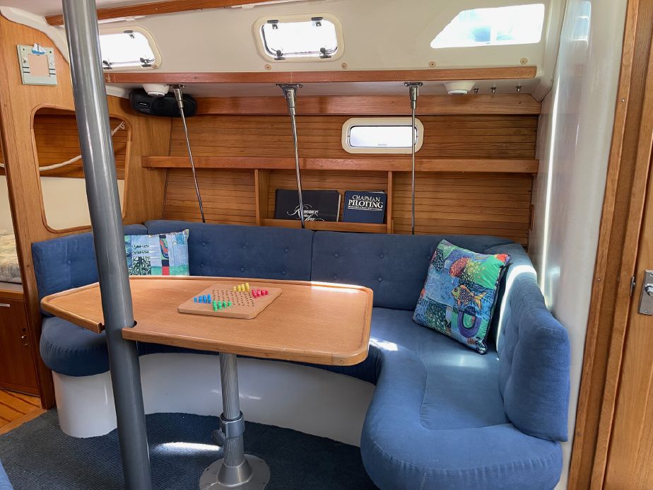 - Starboard dinette: table lowers and converts to berth with custom insert, sleeps 2
