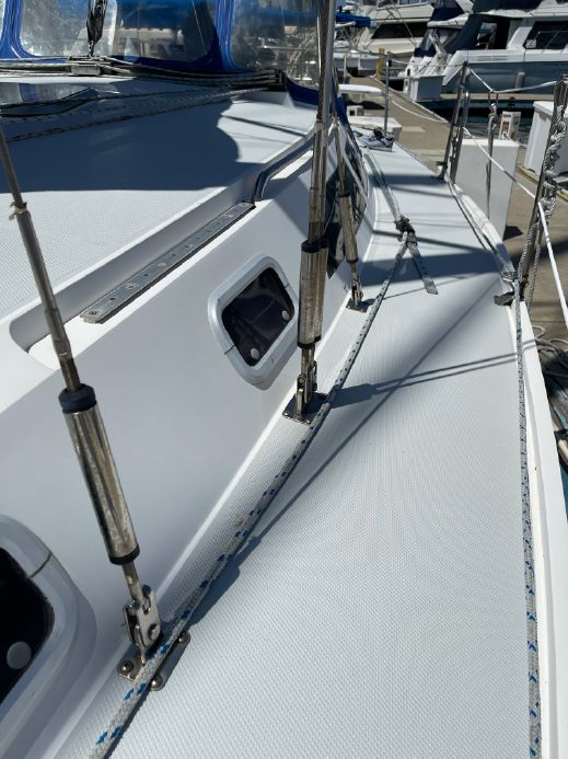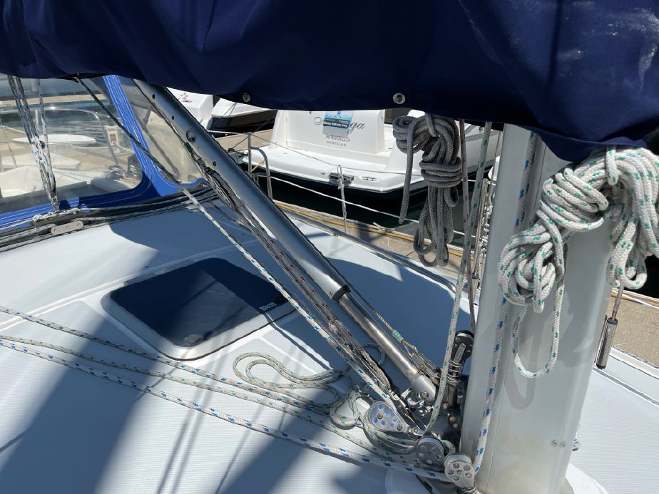 - Line management: all lines lead aft to cockpit through five rope clutches and one clam cleat for mainsheet.