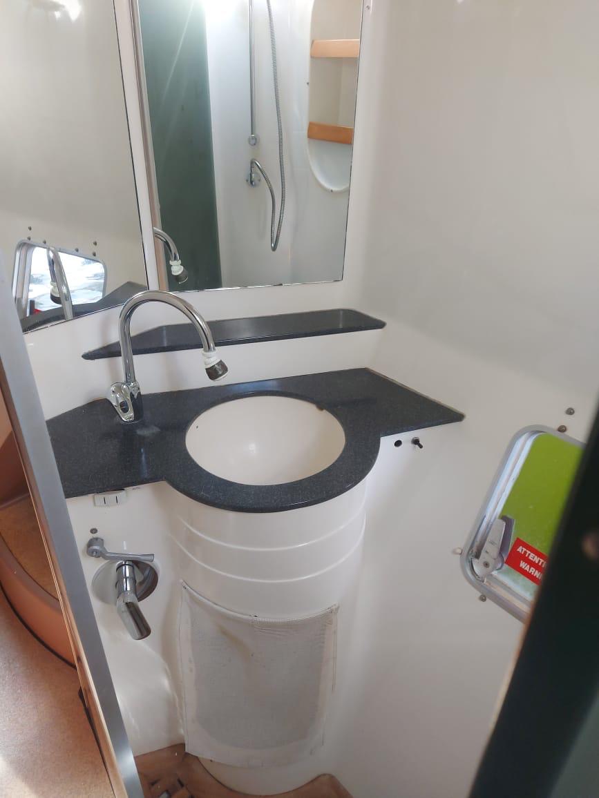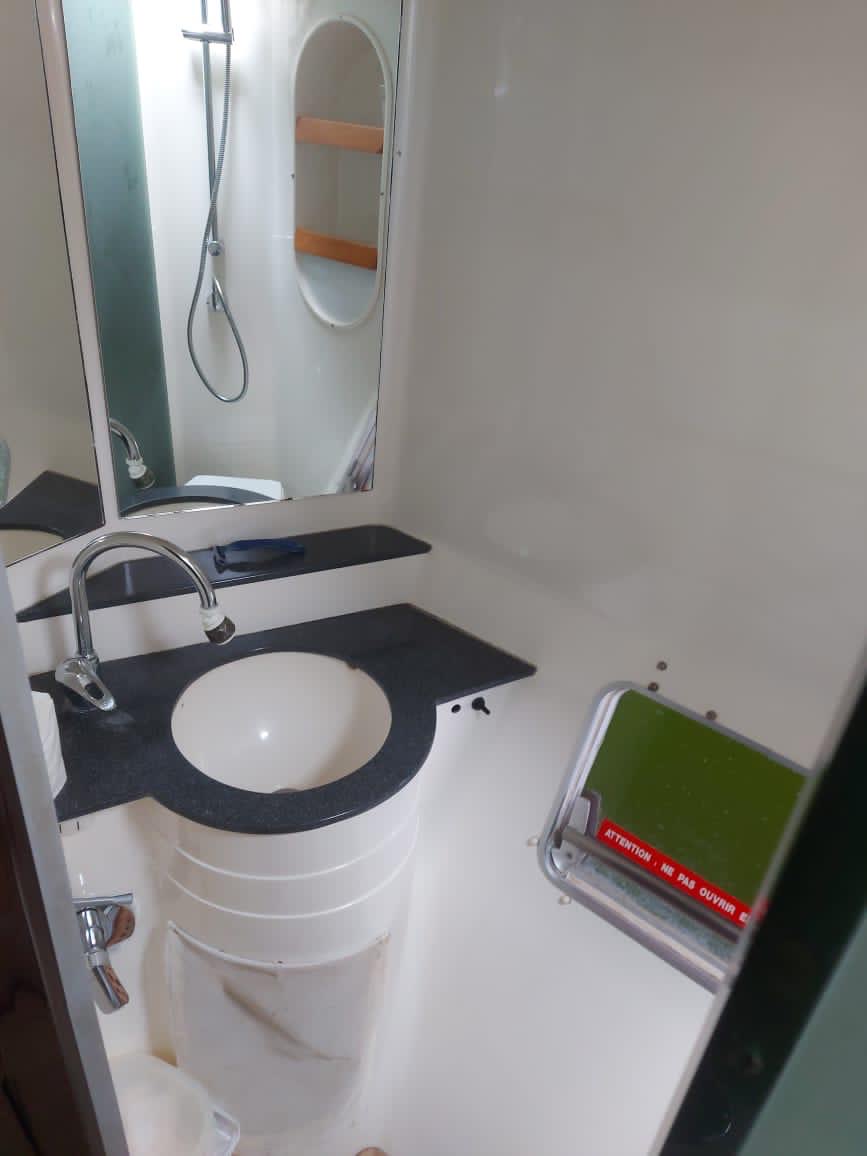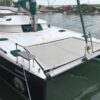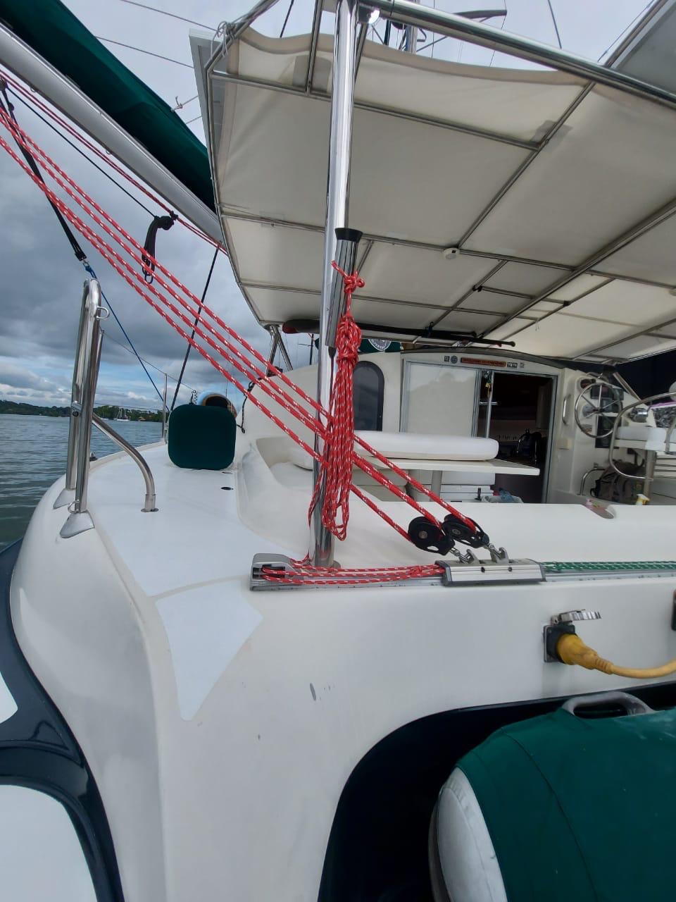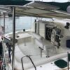 The hulls are identical, with 2 double cabins, in the forepeak a single berth and a bathroom. The galley has a large refrigerator, a well-equipped galley and a table for 6 people with a separate chart table. In the cockpit, a table for 8 people is sheltered by a removable bimini. The furling genoa, a fully battened mainsail with lazy jacks and a dinghy on davits.