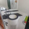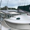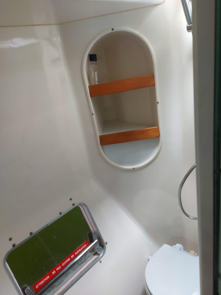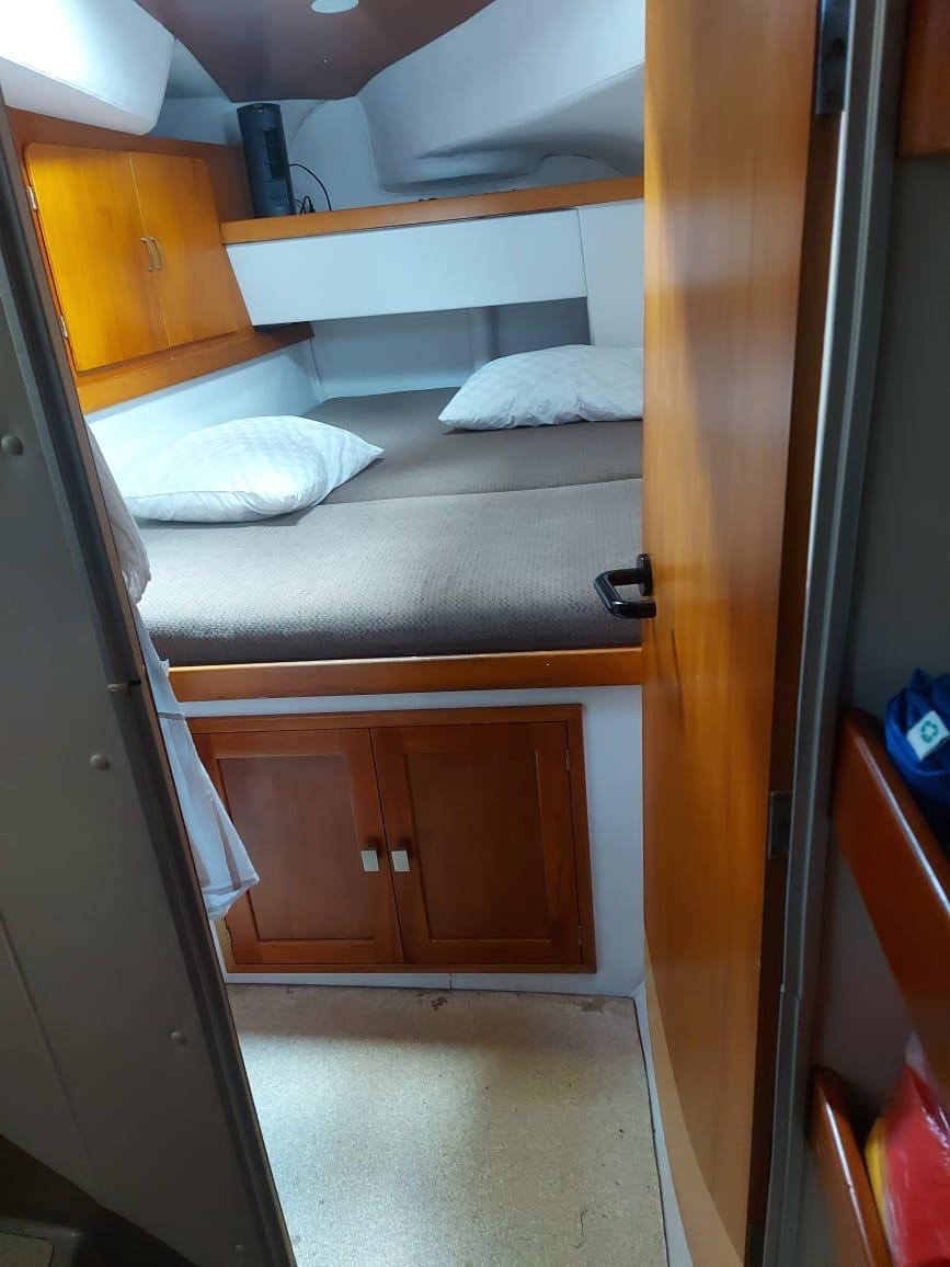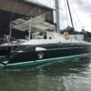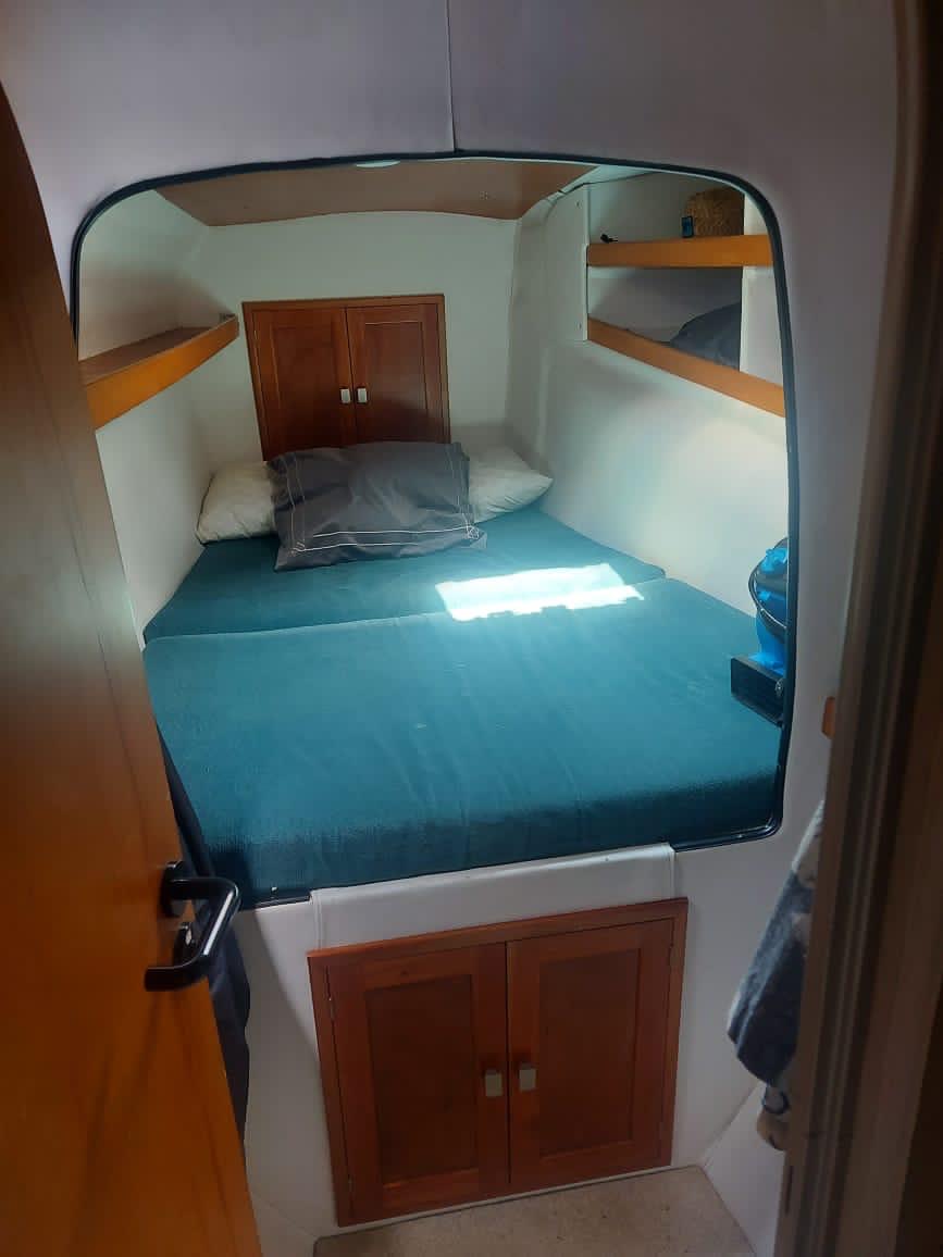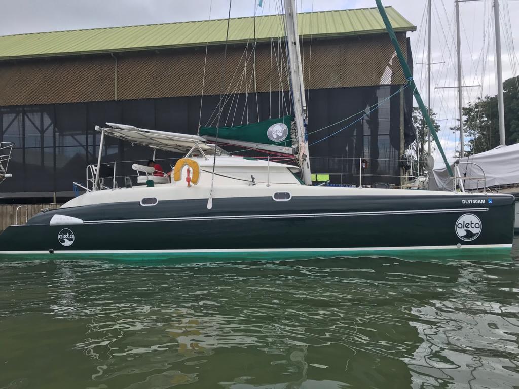 The hulls are identical, with 2 double cabins, in the forepeak a single berth and a bathroom. The galley has a large refrigerator, a well-equipped galley and a table for 6 people with a separate chart table. In the cockpit, a table for 8 people is sheltered by a removable bimini. The furling genoa, a fully battened mainsail with lazy jacks and a dinghy on davits.