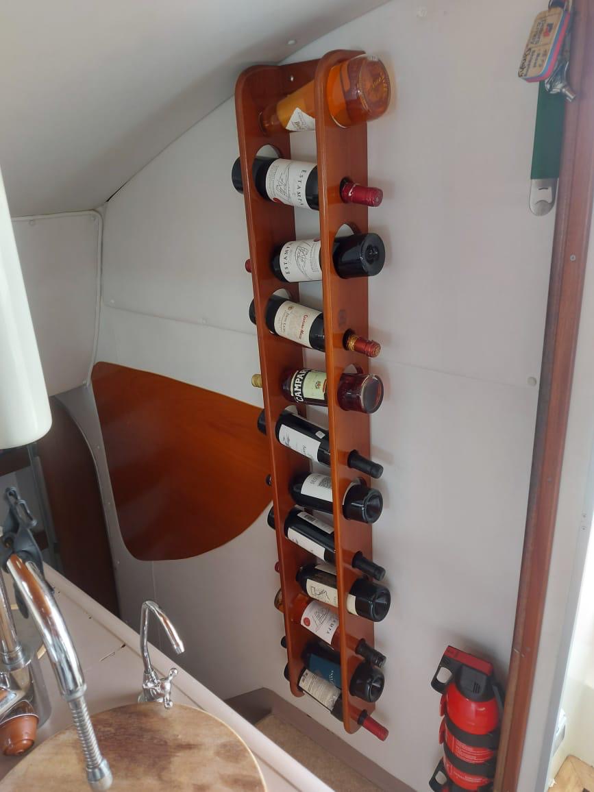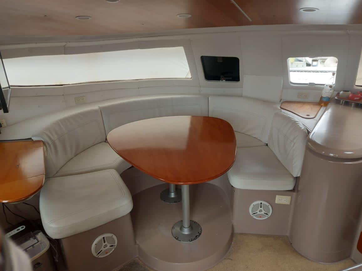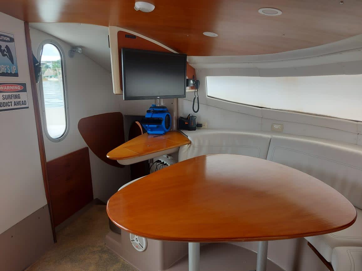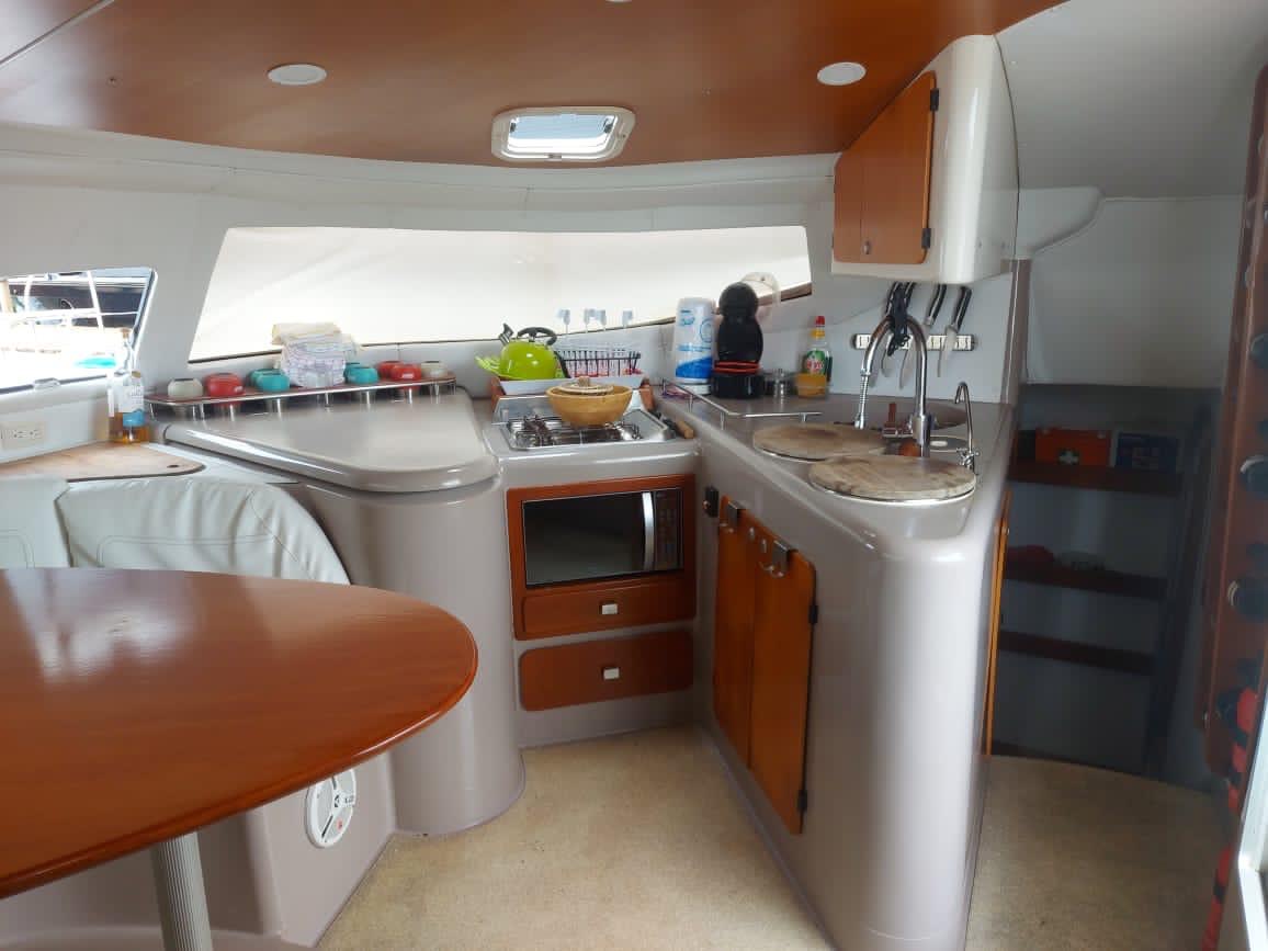- Comfortable galley up, refrigerator, freezer, 3 burner stove, microwave, 2 sinks with fresh water and raw (saltwater faucets)