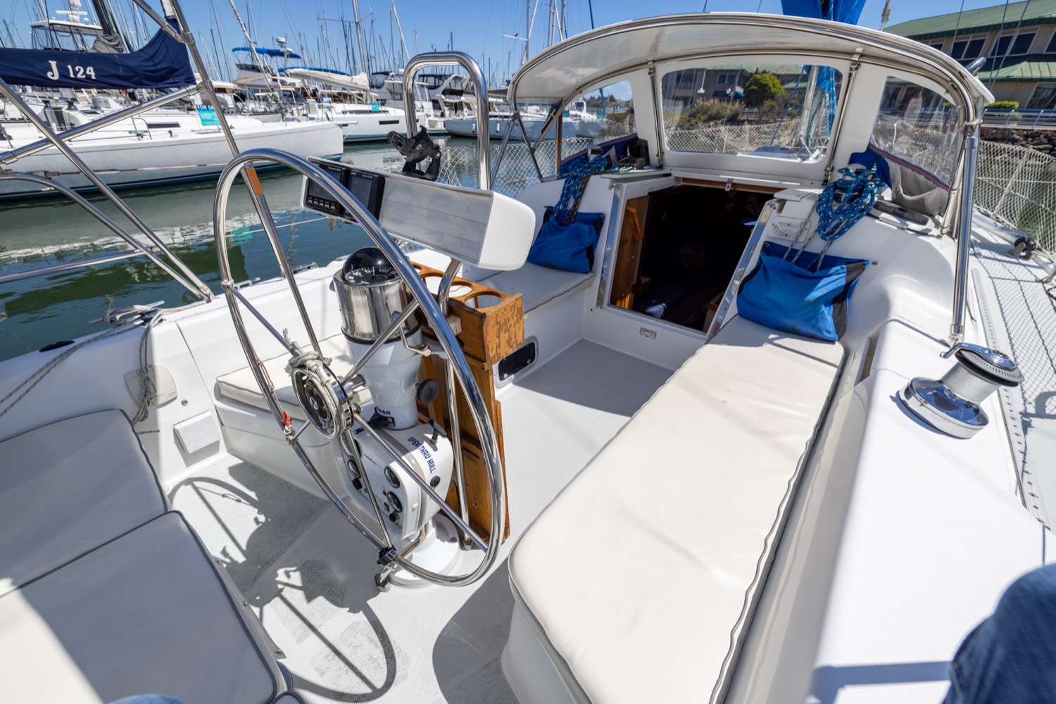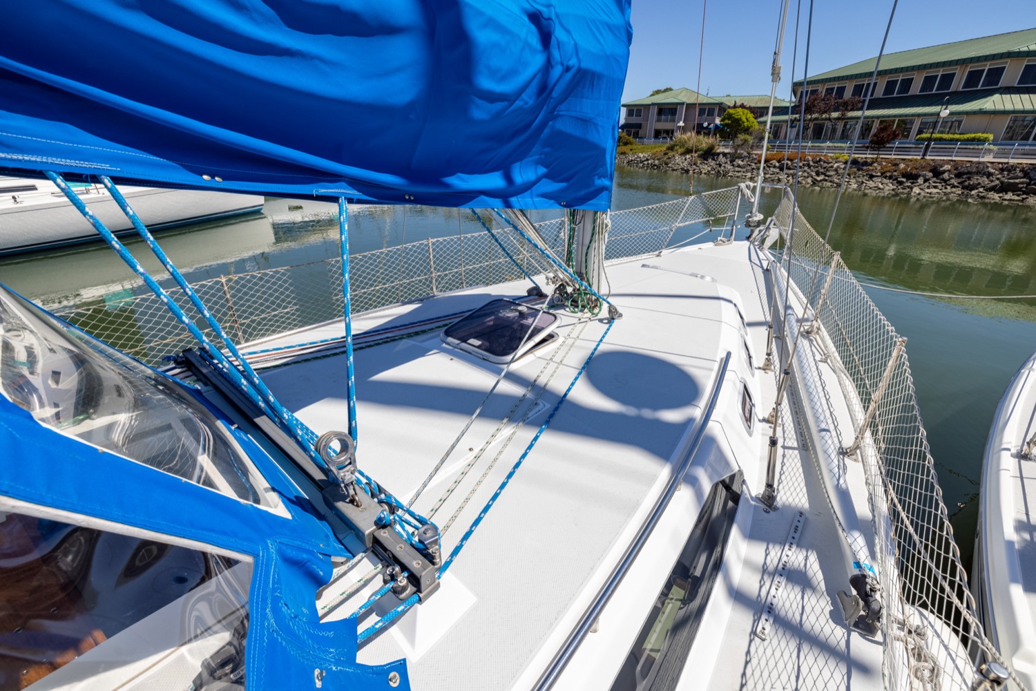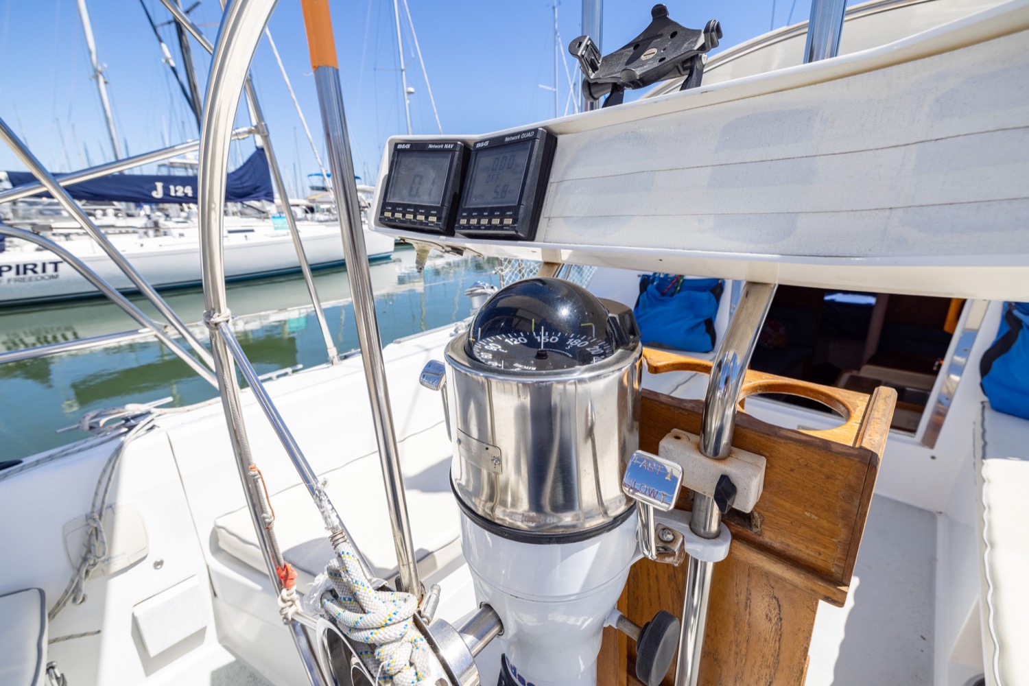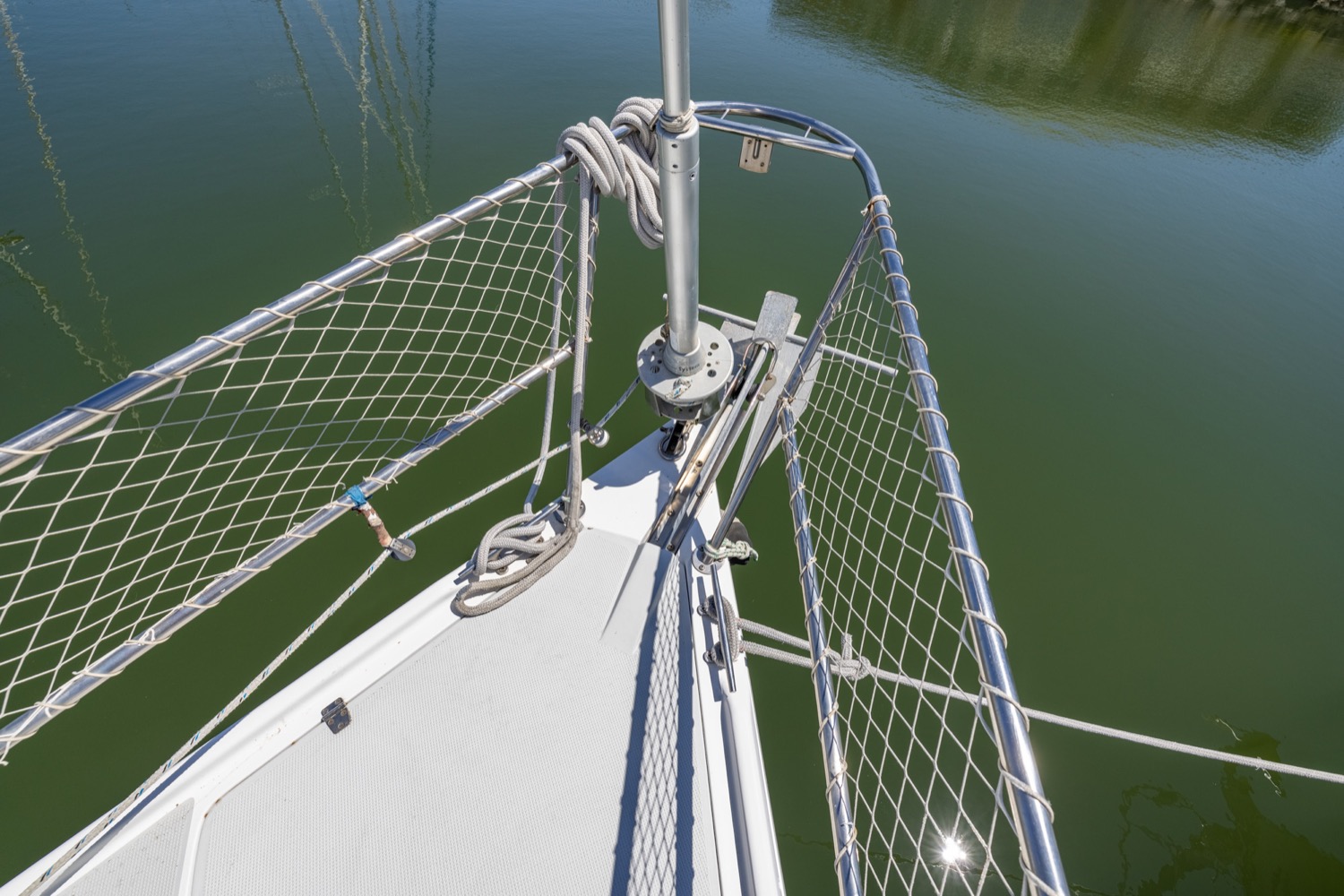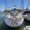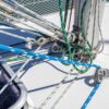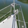 Deck stepped mast, sloop rig with lines leading aft to the cockpit. Standing rigging is 12 years old.