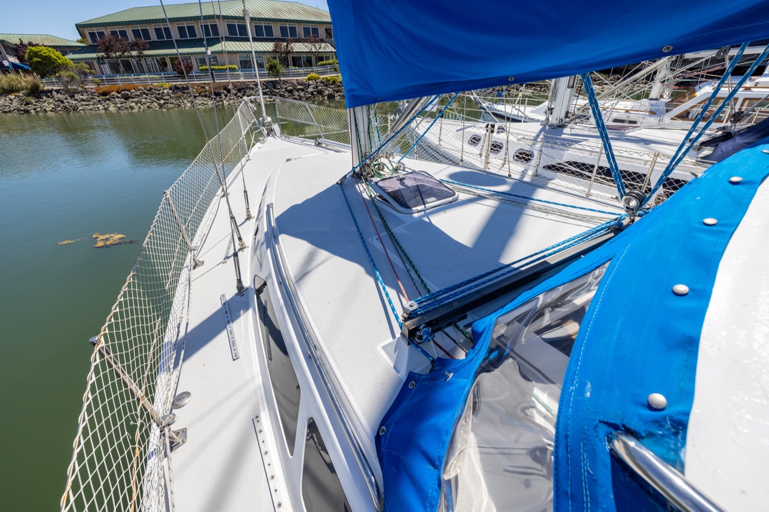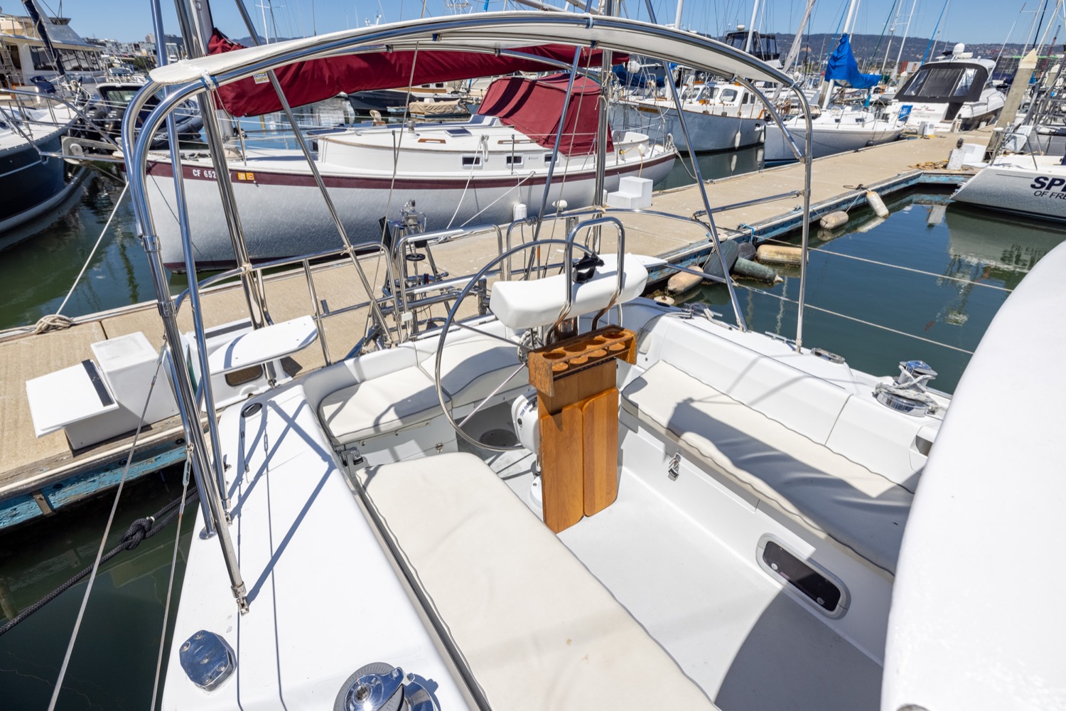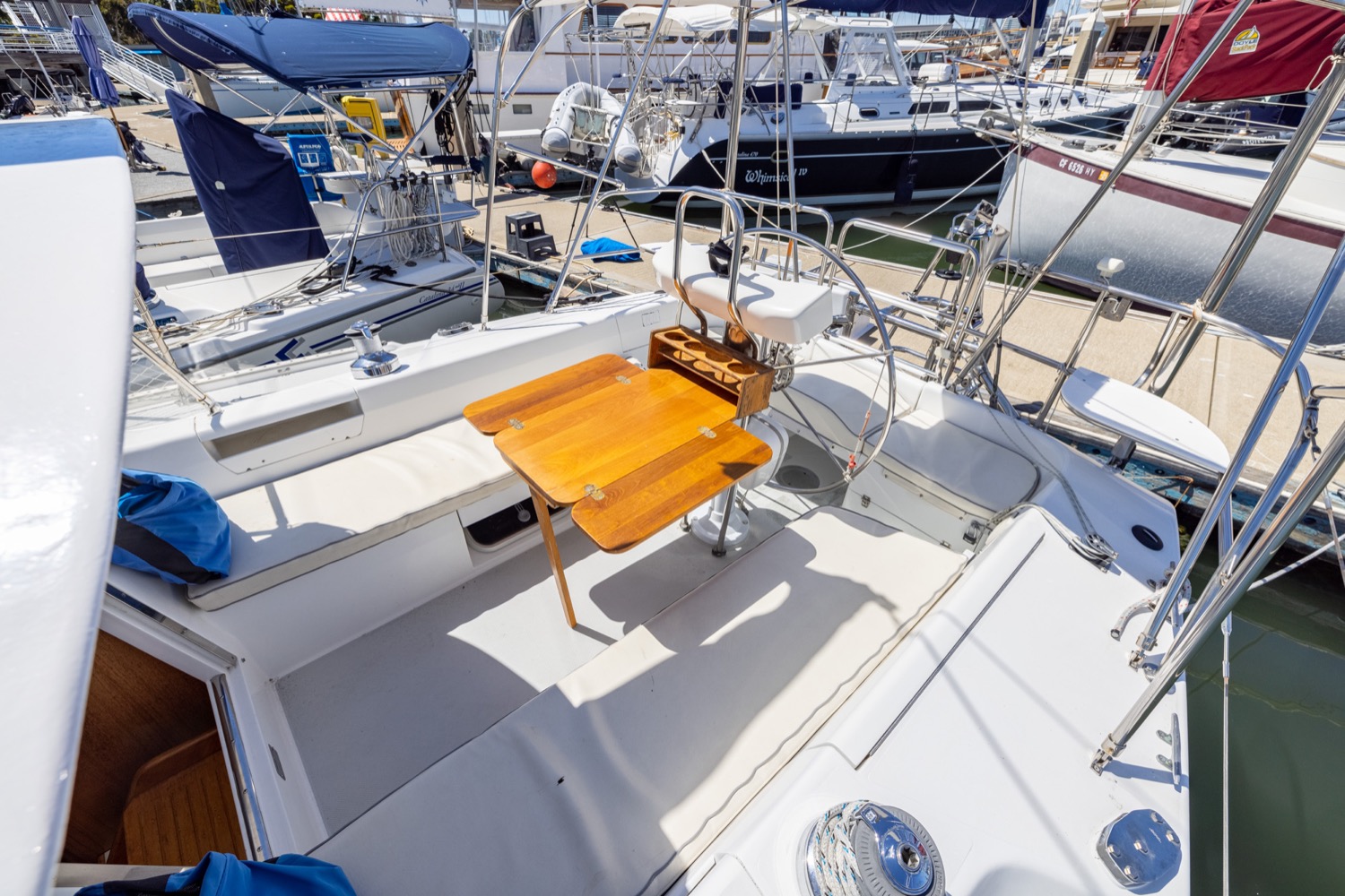 Deck stepped mast, sloop rig with lines leading aft to the cockpit. Standing rigging is 12 years old.