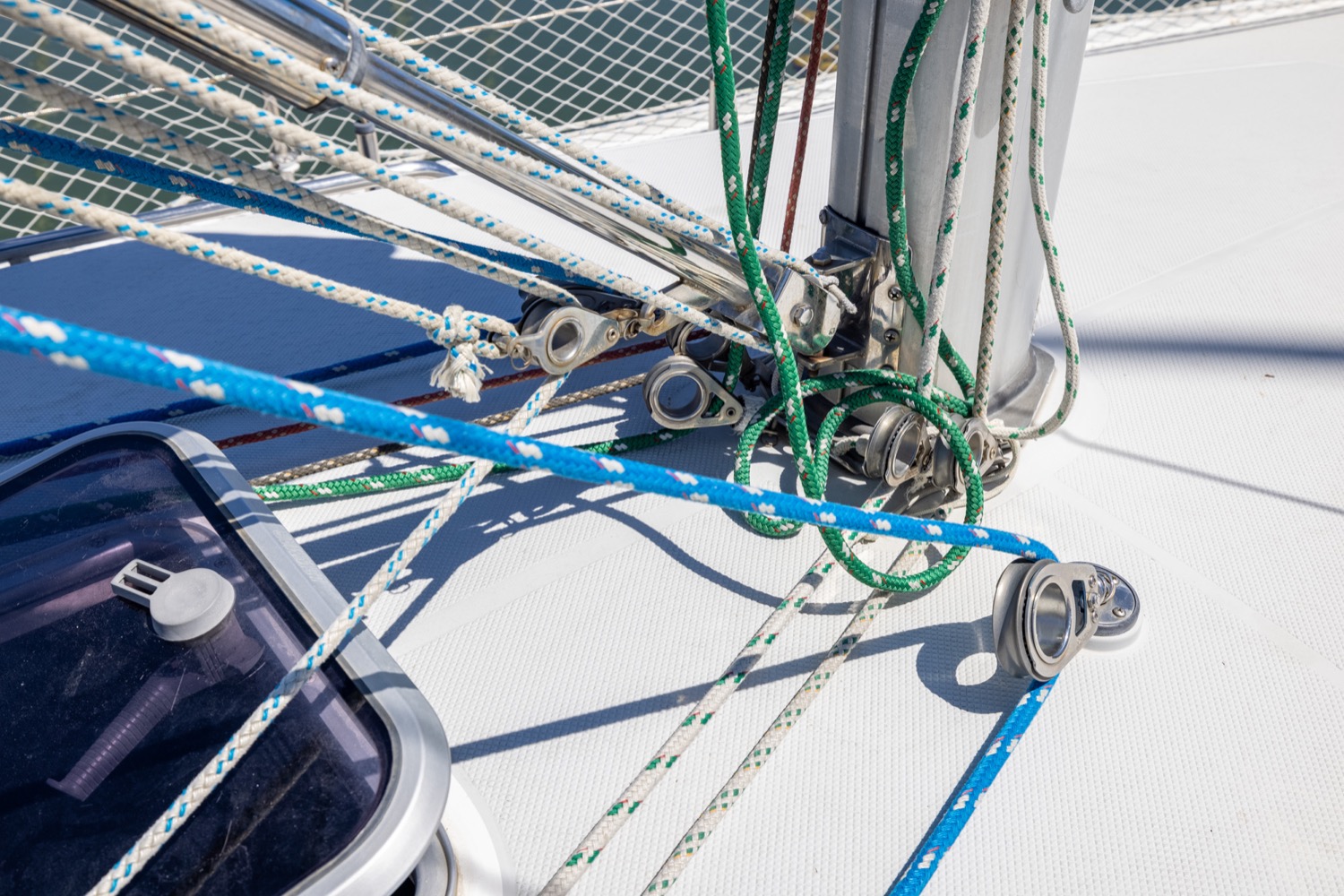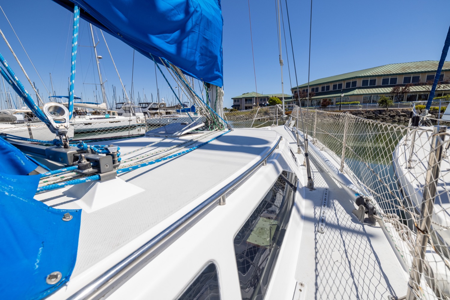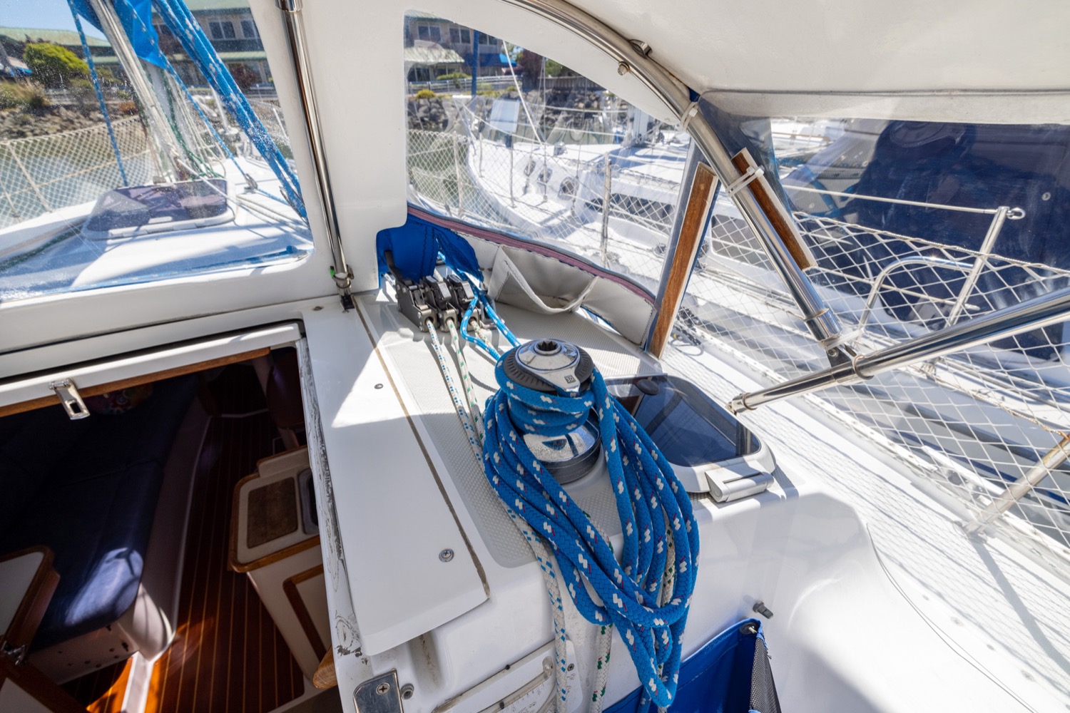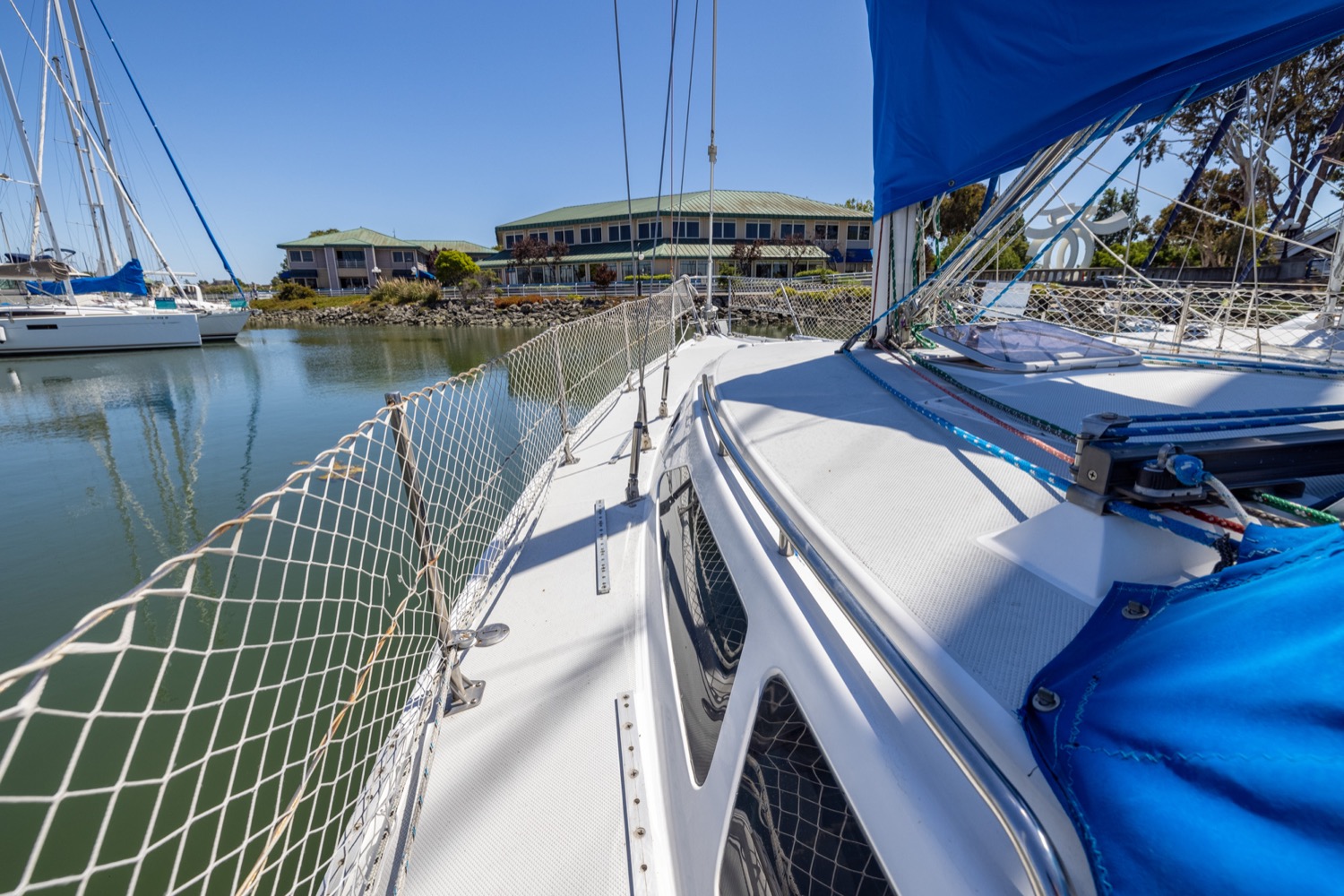 Deck stepped mast, sloop rig with lines leading aft to the cockpit. Standing rigging is 12 years old.