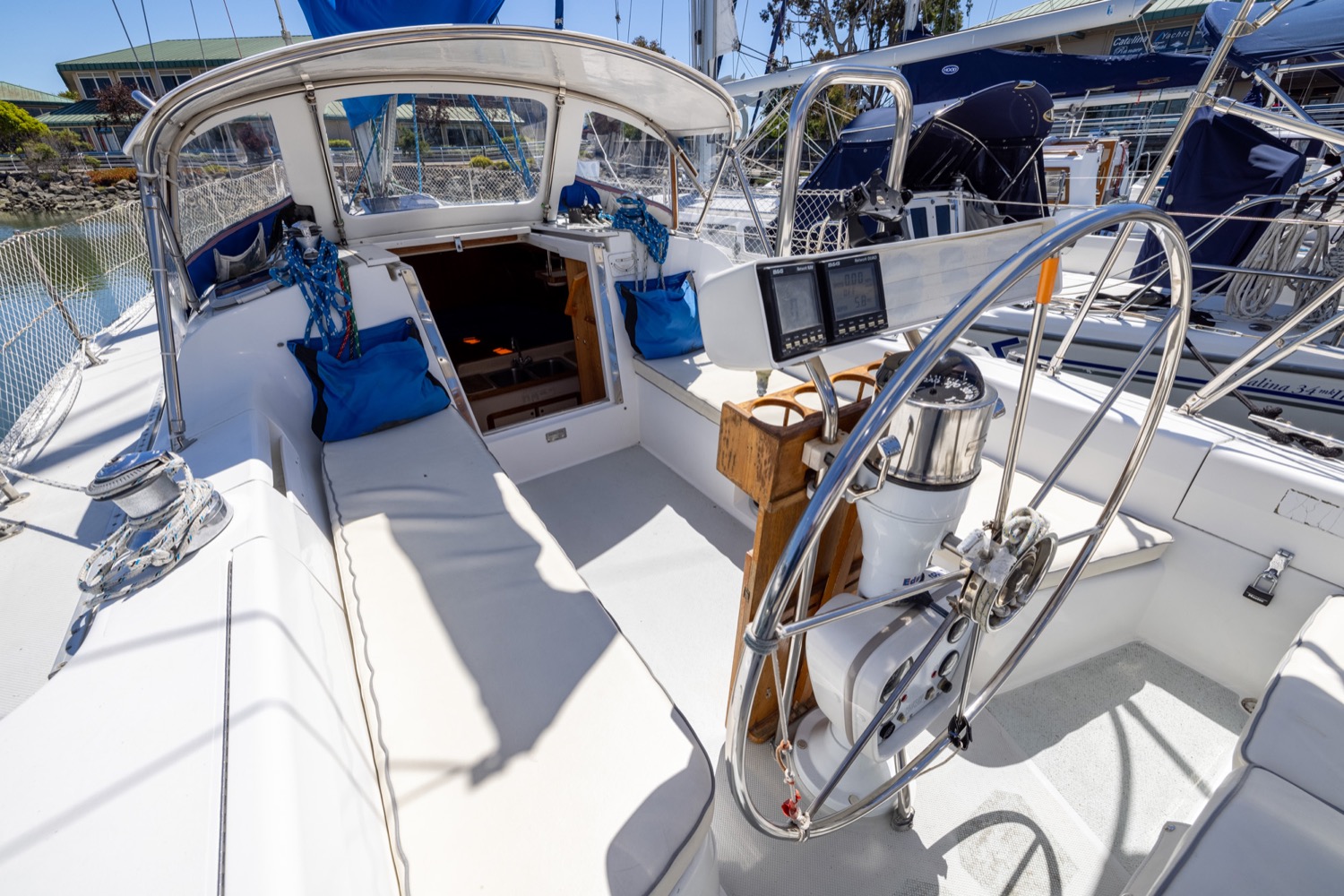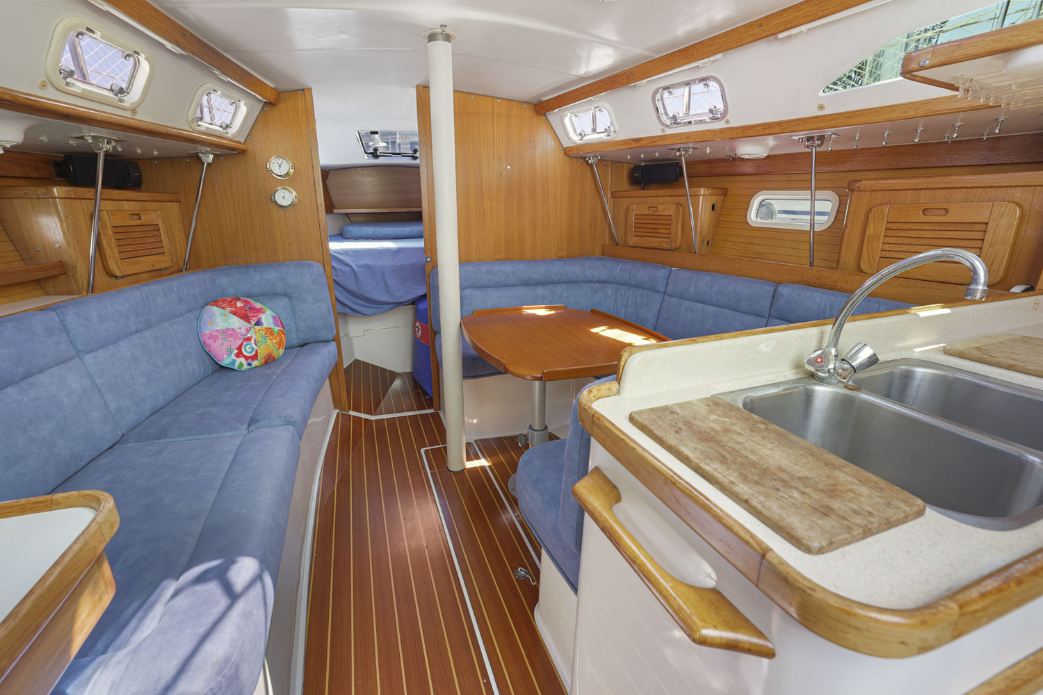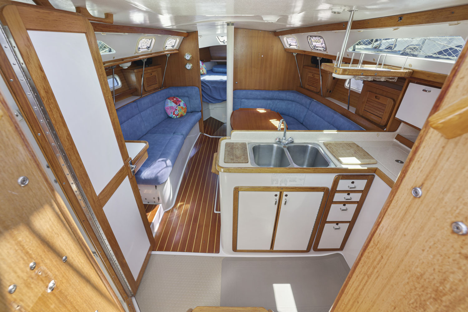 The Catalina 34MKII has the highly desirable deep-keel configuration with a spacious salon, two private cabins and one head. The convertible u-shaped settee and straight settee with lee cloth allows you to comfortably sleep 7.