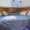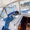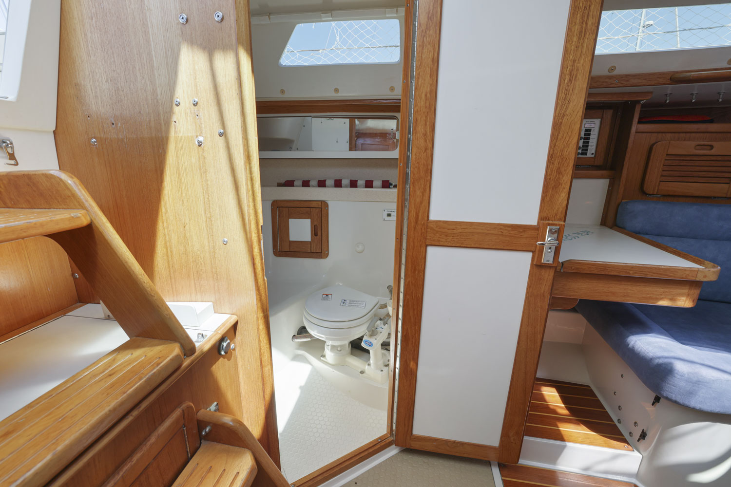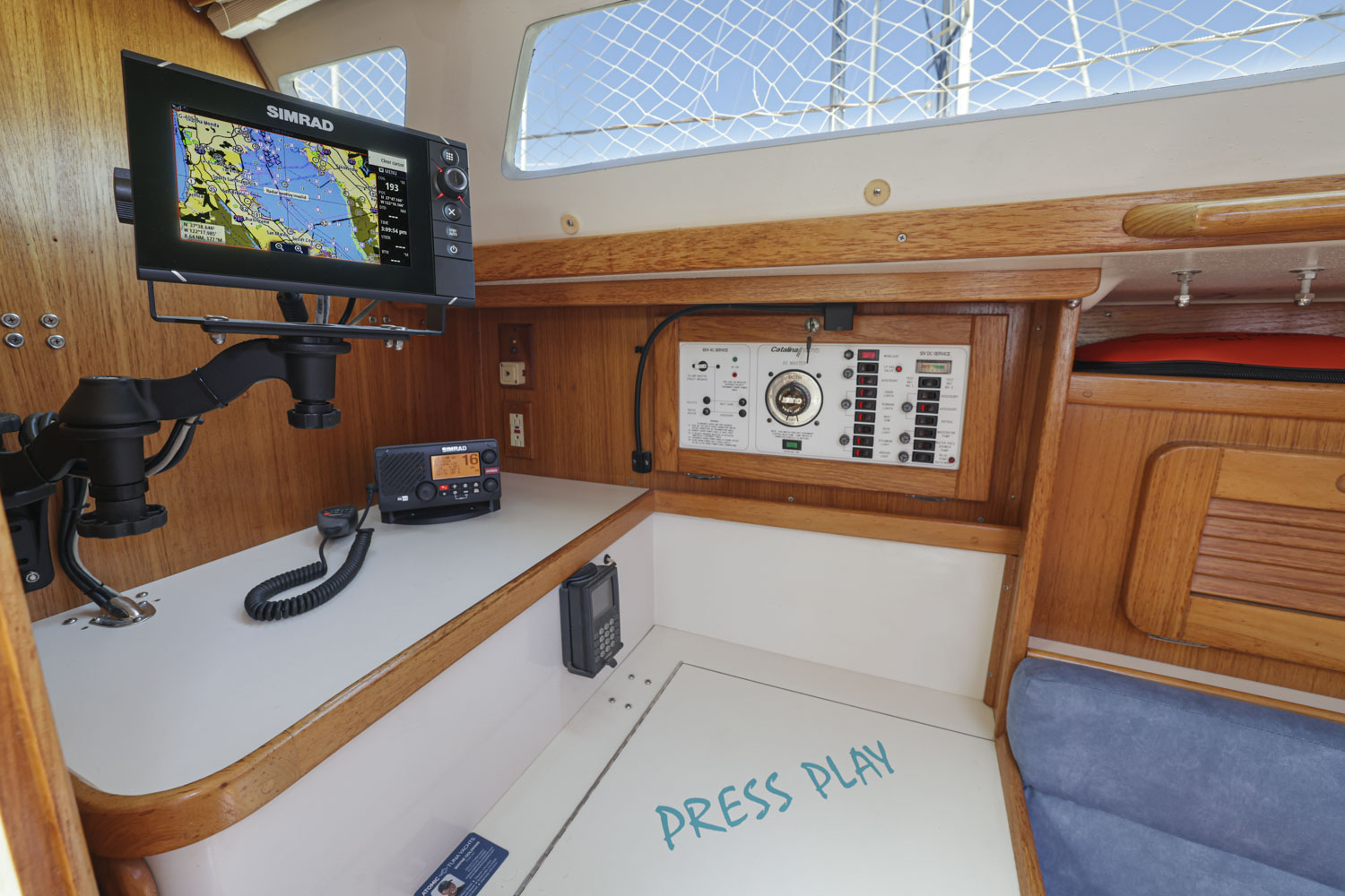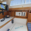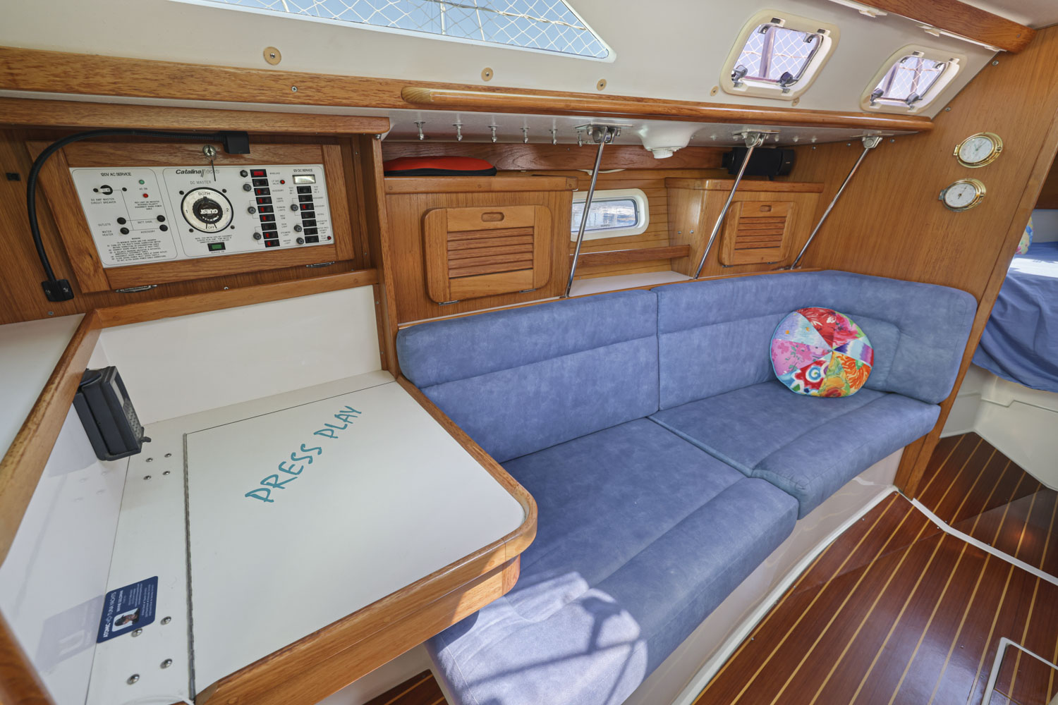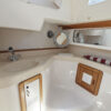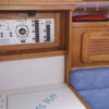 PRESS PLAY has a large v-berth forward with cedar lined cabinets on the port and starboard side. The main salon has a straight settee with lee cloth to port and a U-shaped settee to starboard with a wooden table that lowers to convert to form a double berth. The navigation station faces aft with a nice sized chart table. The head/shower is at aft of the navigation station. The L- Shaped galley is at the base of the companionway to starboard. Aft of the galley is a private double cabin with a large berth with hanging locker to starboard.