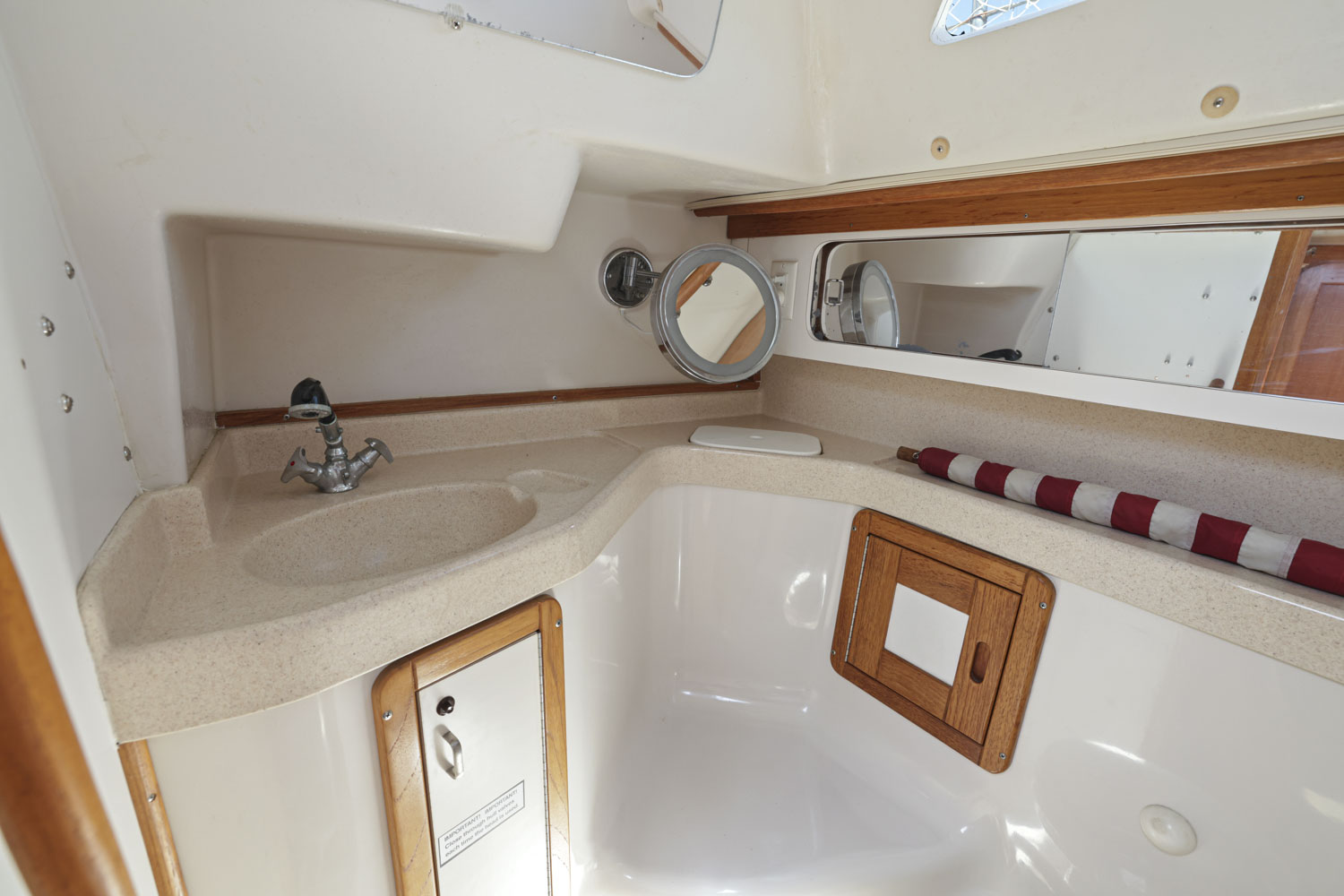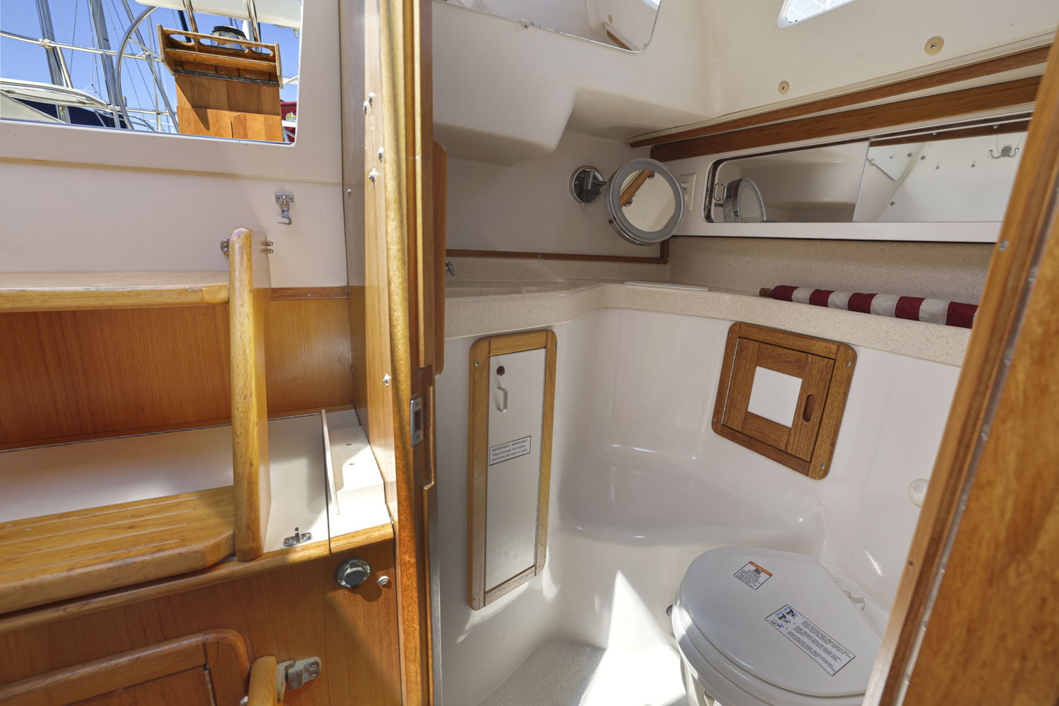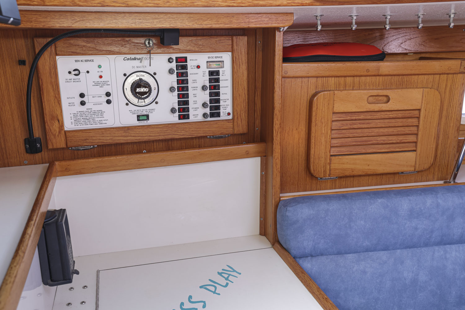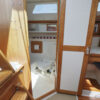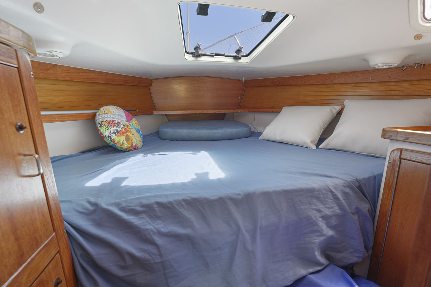 PRESS PLAY has a large v-berth forward with cedar lined cabinets on the port and starboard side. The main salon has a straight settee with lee cloth to port and a U-shaped settee to starboard with a wooden table that lowers to convert to form a double berth. The navigation station faces aft with a nice sized chart table. The head/shower is at aft of the navigation station. The L- Shaped galley is at the base of the companionway to starboard. Aft of the galley is a private double cabin with a large berth with hanging locker to starboard.