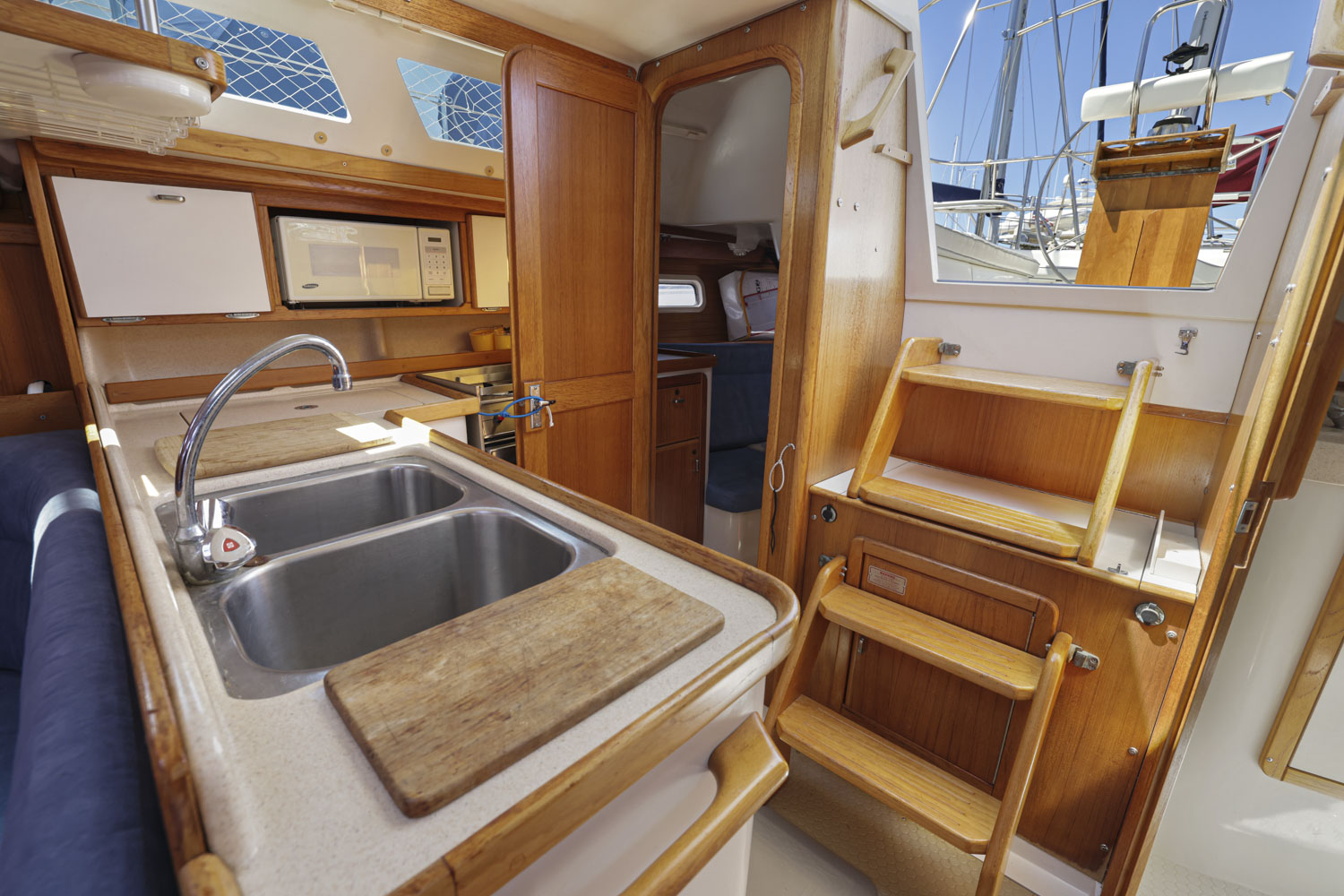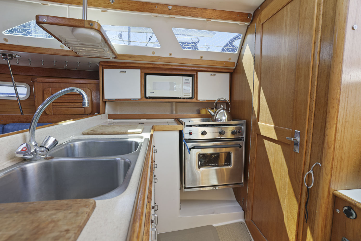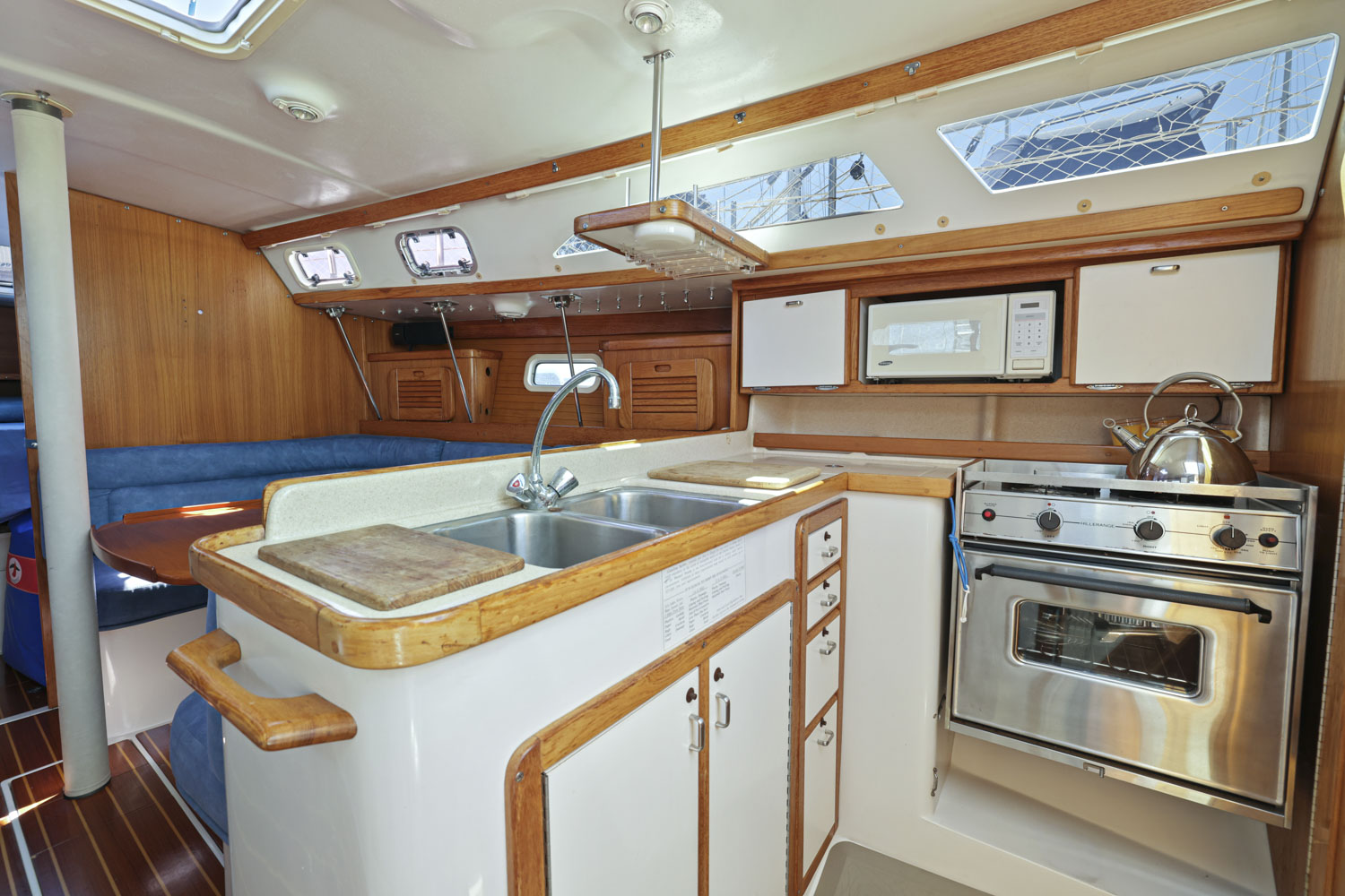 L-shaped galley which makes it safe and comfortable to work in while underway.