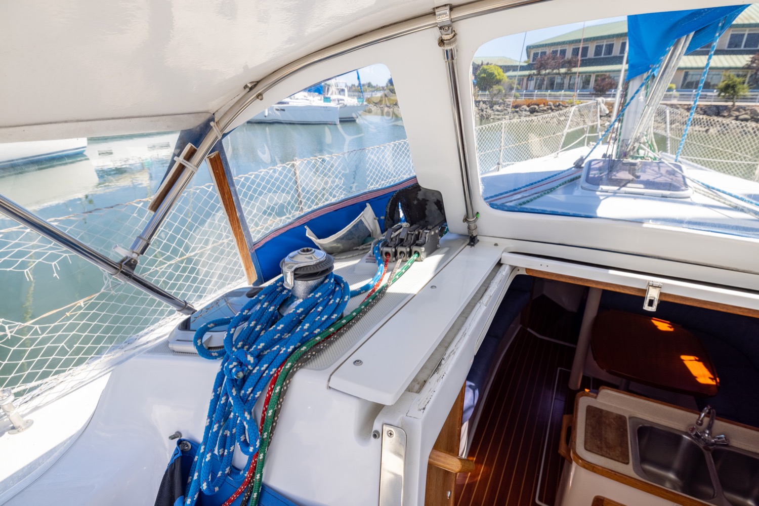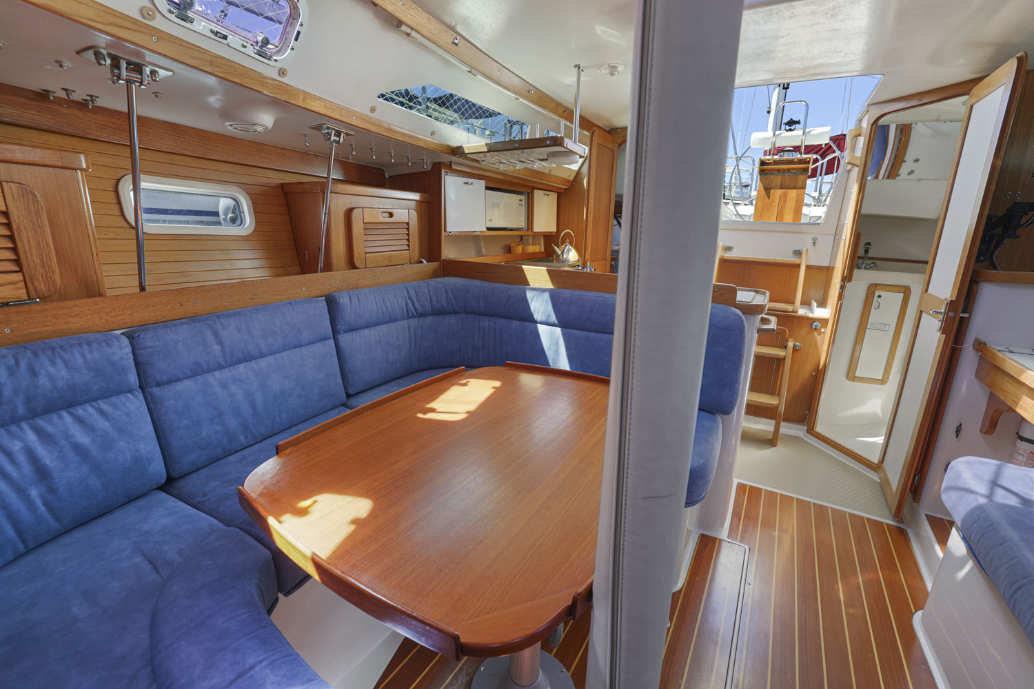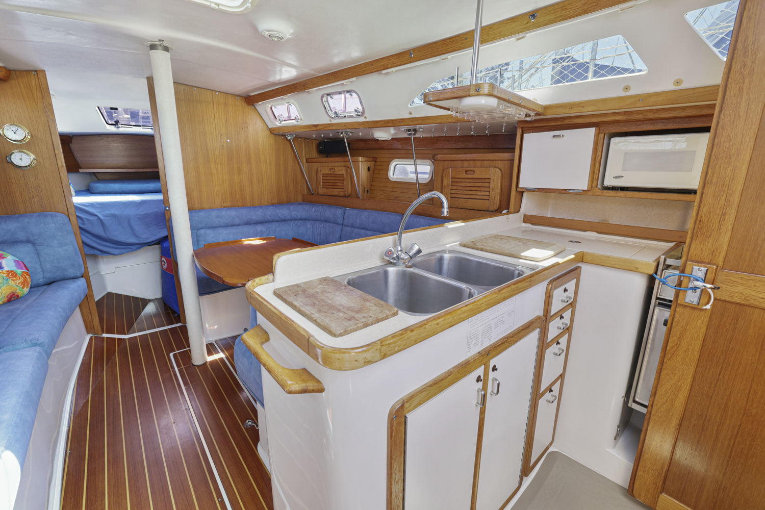 L-shaped galley which makes it safe and comfortable to work in while underway.