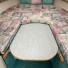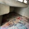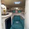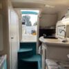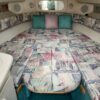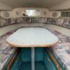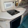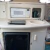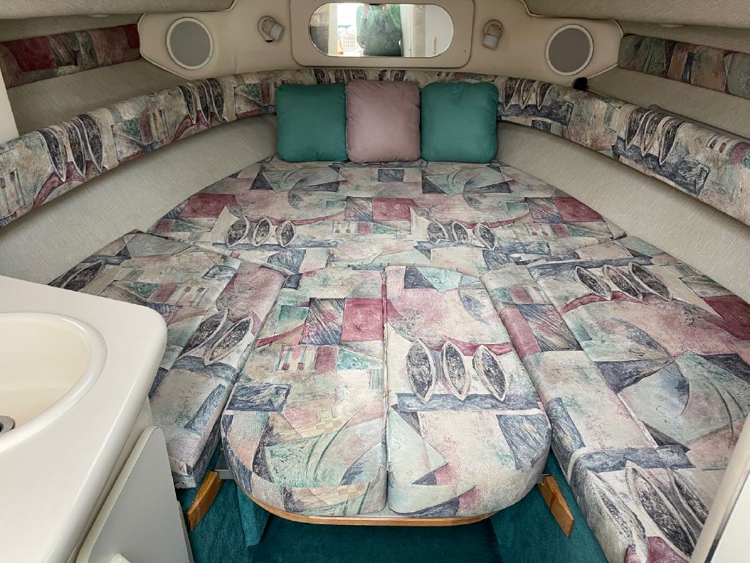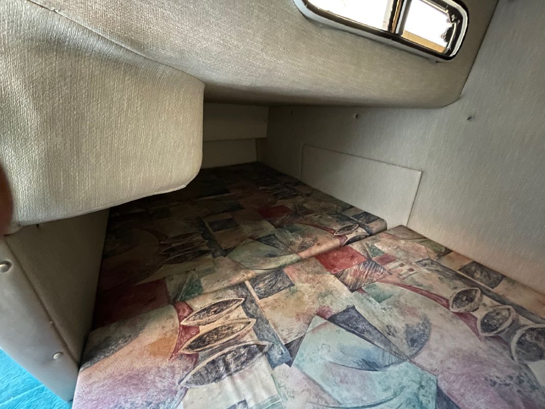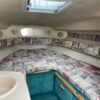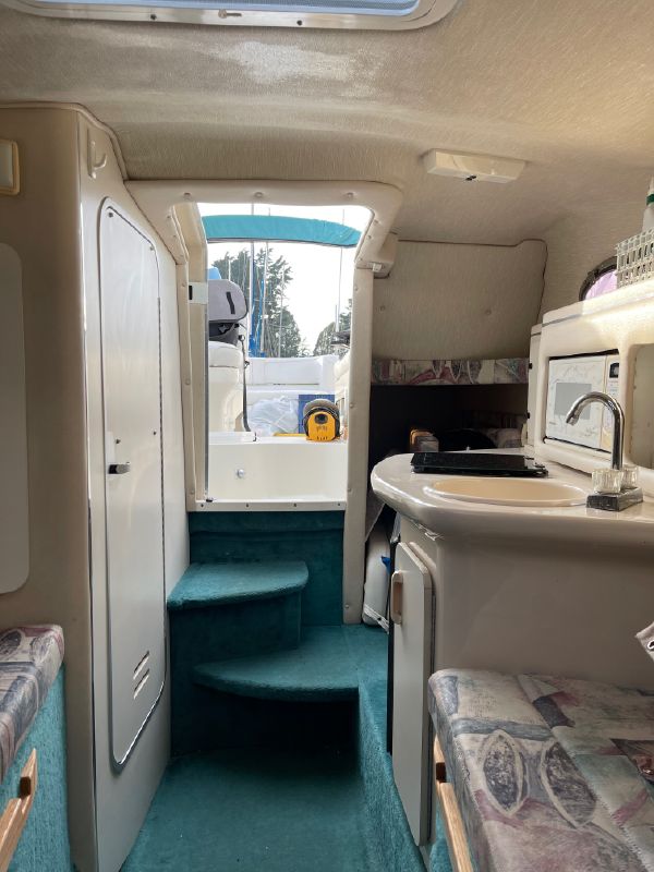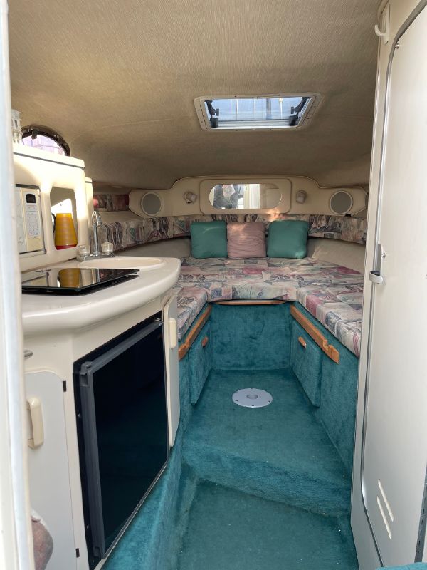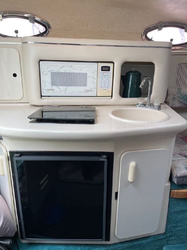 The companionway leads to the nicely appointed cabin. In the bow is a large v-berth with a removable table which converts with the addition of the insert to make the bed even larger.To port is the galley with a one burner electric/alcohol stove, microwave, refrigerator, and sink with hot/cold pressurized water.