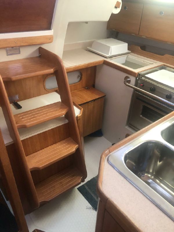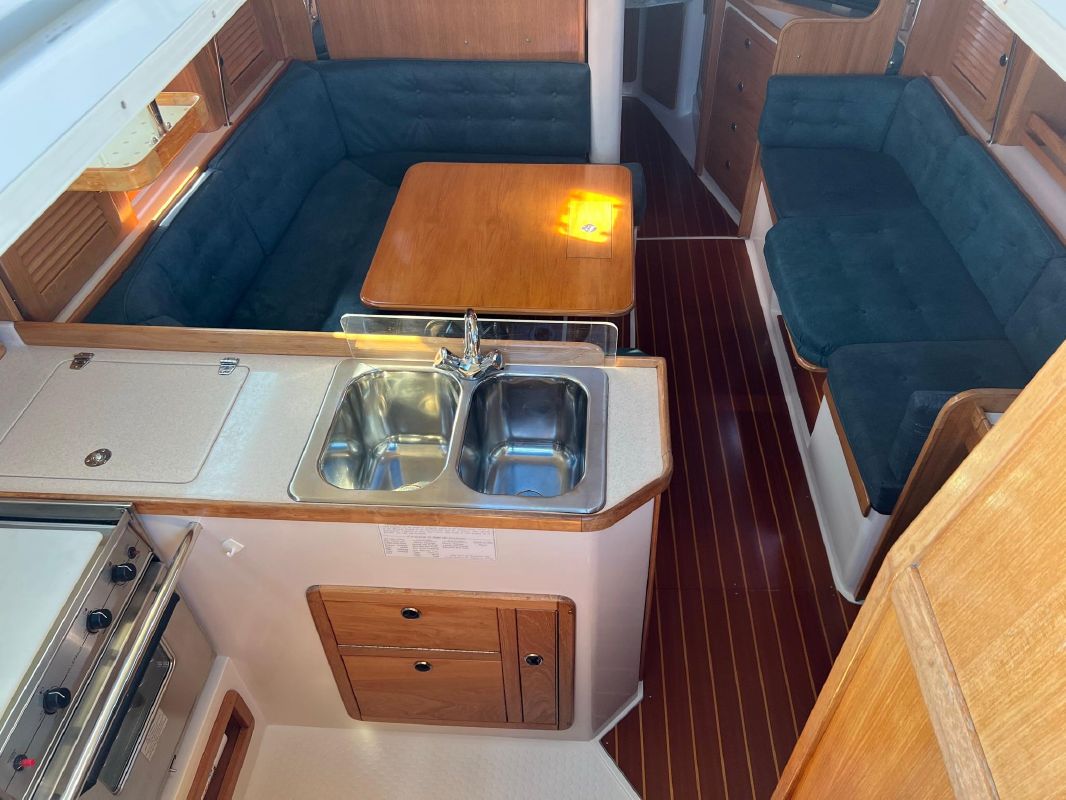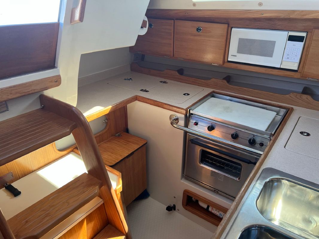 The galley is to port of the companionway, with a large amount of storage and good sized working area that make it a dream to create your favorite dish, in port, underway or on the hook.