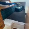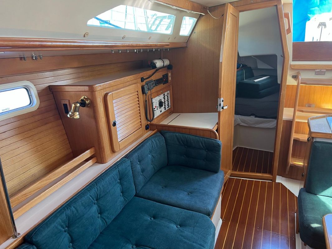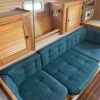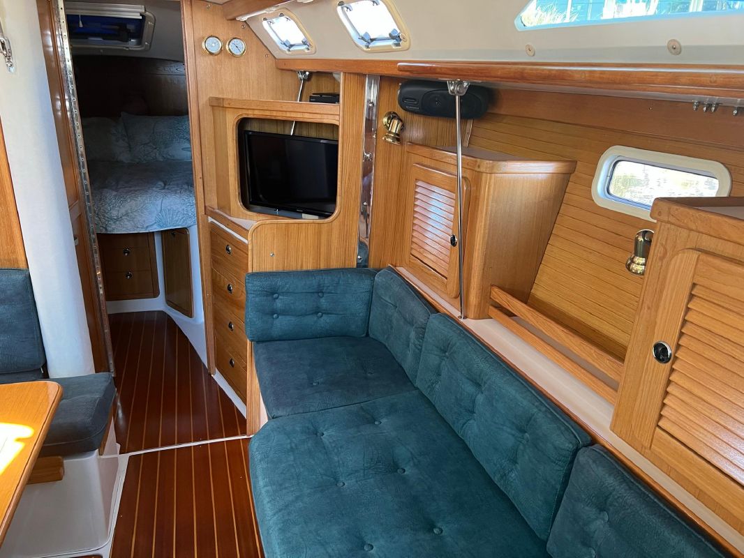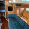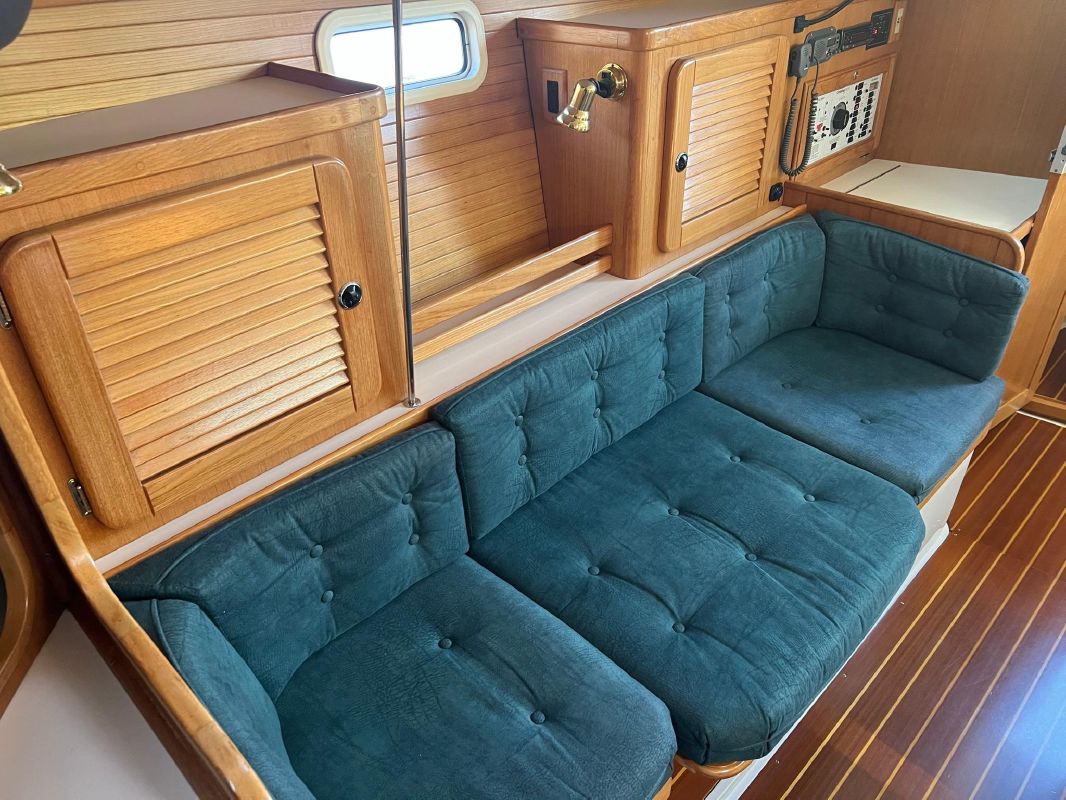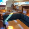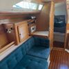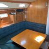 Forward of the aft stateroom is the nav station with a swing out chair. The salon is spacious and very ventilated with opening hatches and windows. The dinette is mid-ship on the port side, with a large seating area, that lowers down and converts to a double berth. Adjacent to the dinette is a long sofa, that can be converted to two chairs and a center table.