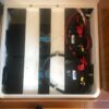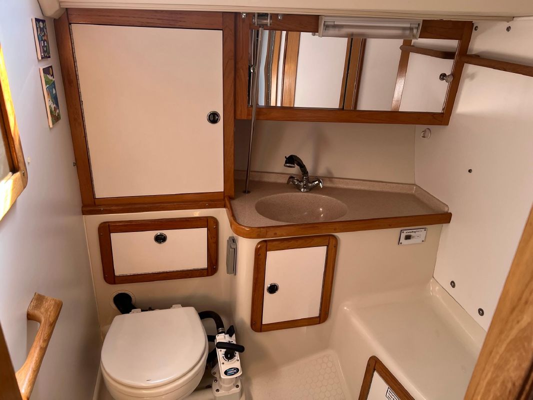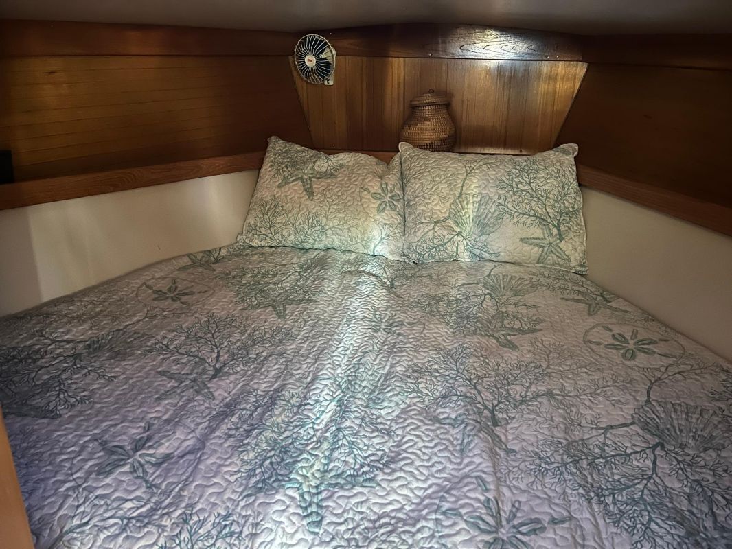 Storage is one thing Catalina is known for and the 36 Mark II is not lacking – with ample cabinets, drawers, closets, and lockers behind and below cushions. Moving forward through the galley ,to starboard, there is cabinetry with drawers and a large area that houses the TV, which could also easily be converted to a coffee station, cocktail bar or even an electric fireplace. The large “wet” head is to port, with a new Jabsco pump and head hoses (replaced in 2019) that have only seen freshwater use. Forward is a large stateroom and V-berth, with drawers and hanging locker. Highlights include:
