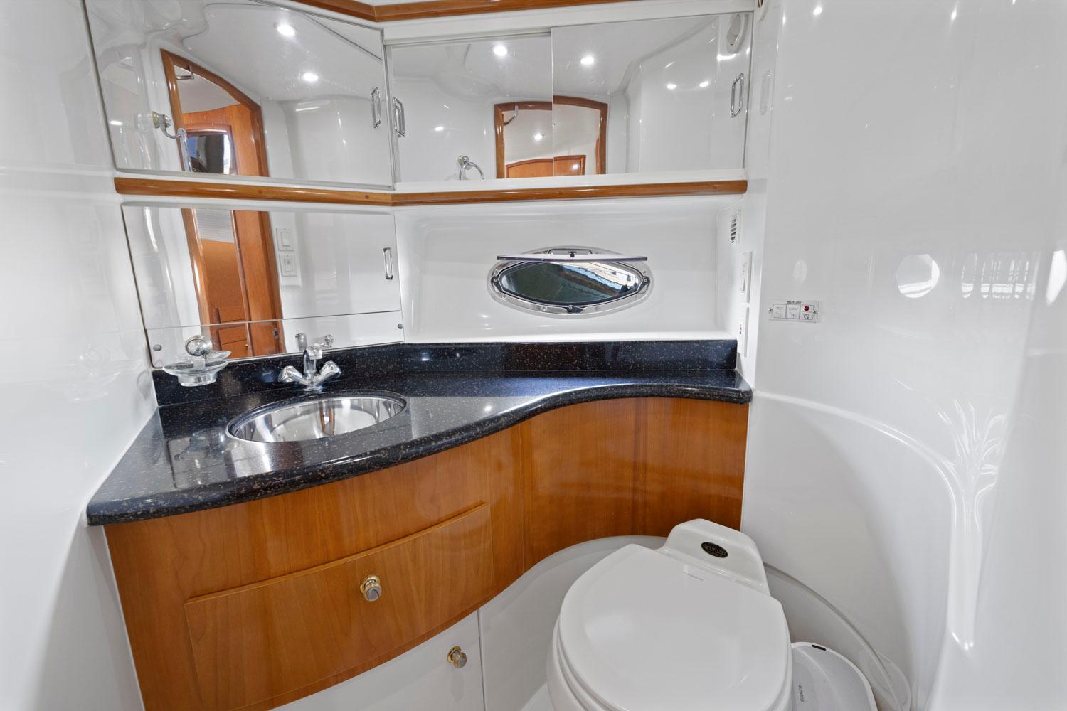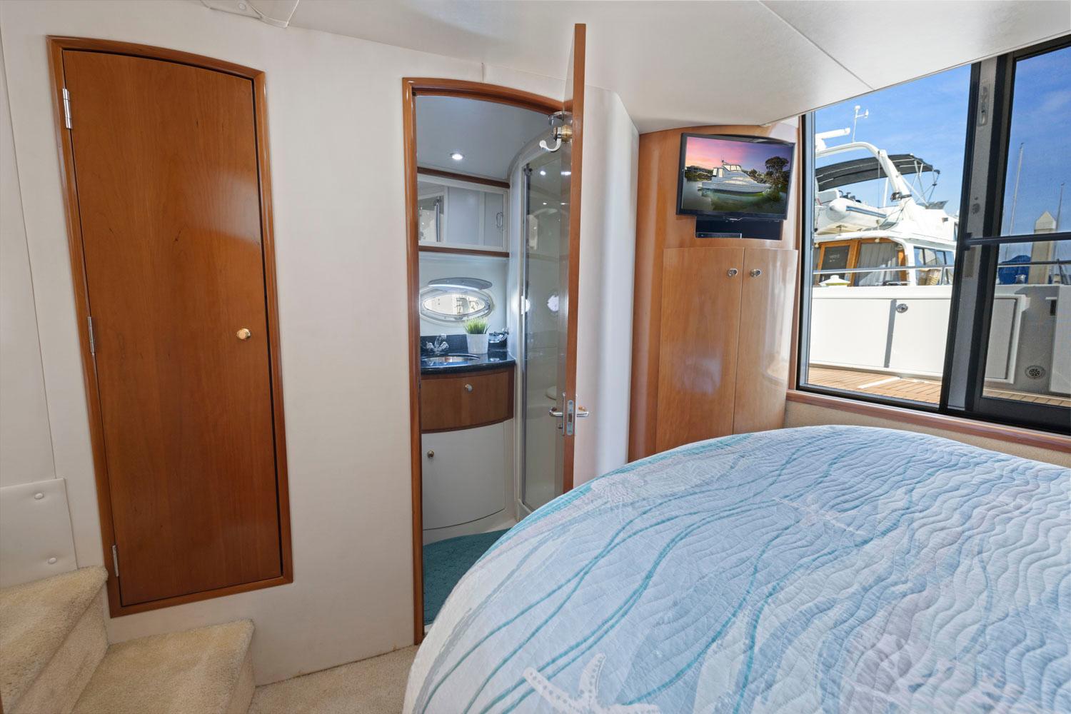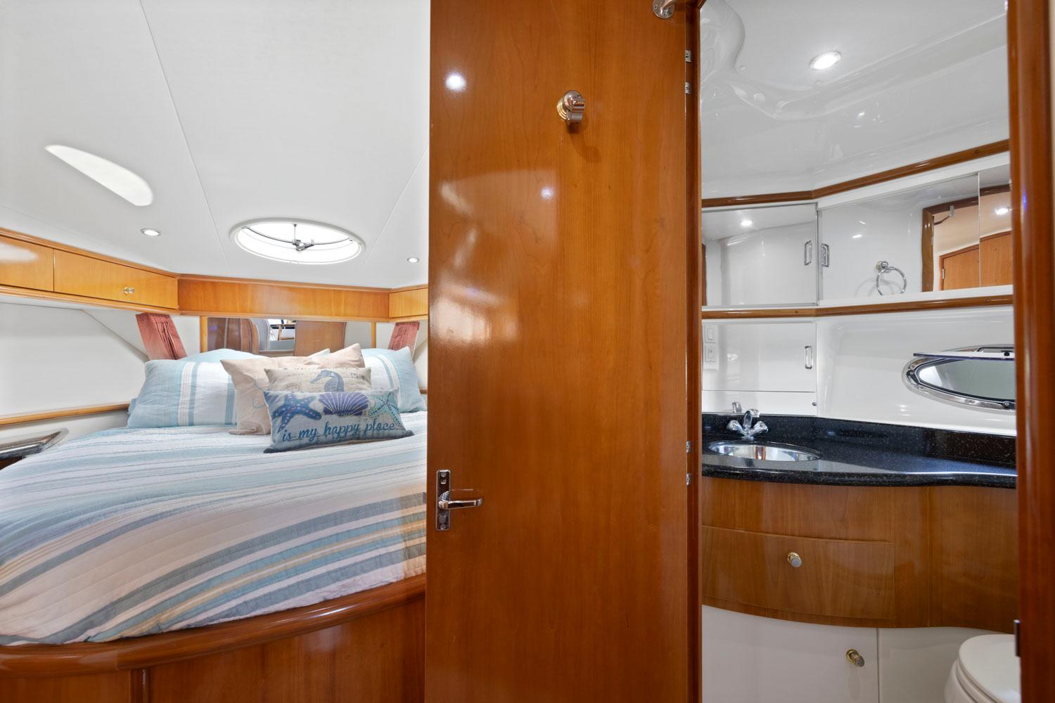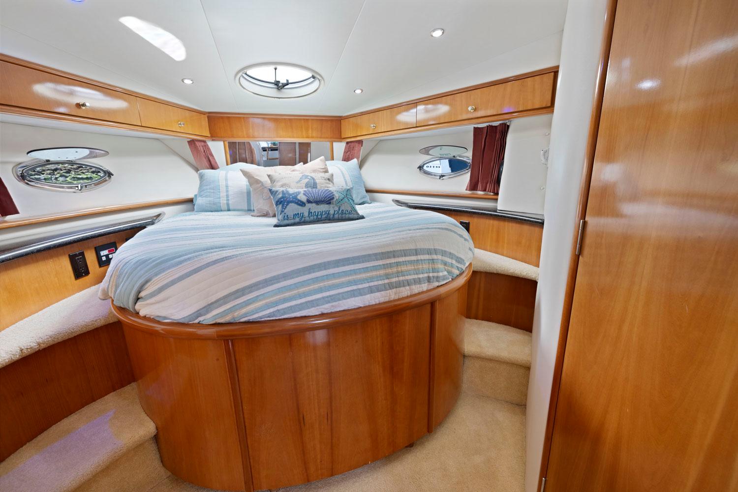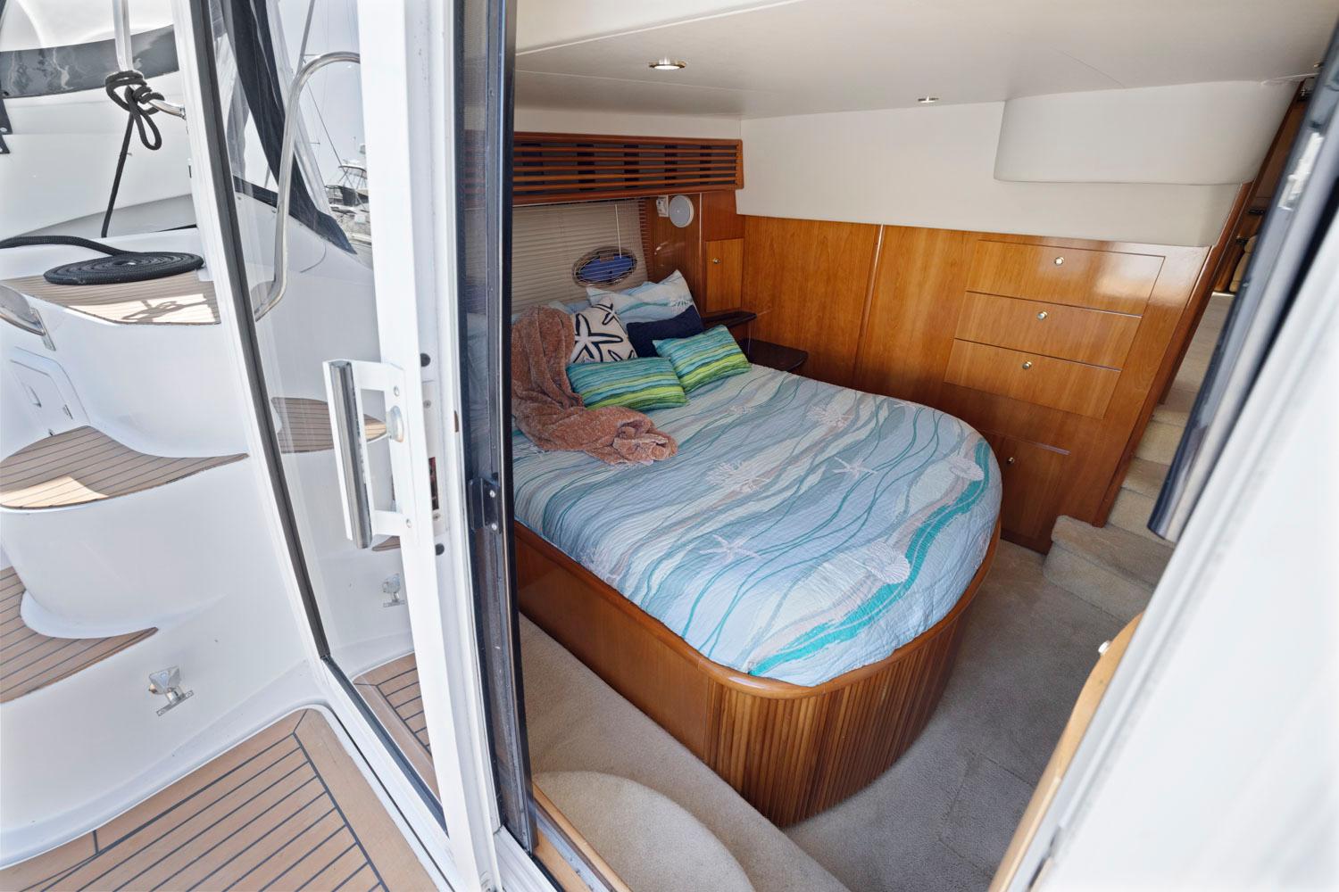 The master stateroom is located aft, with an ensuite head, and private access to the cockpit.