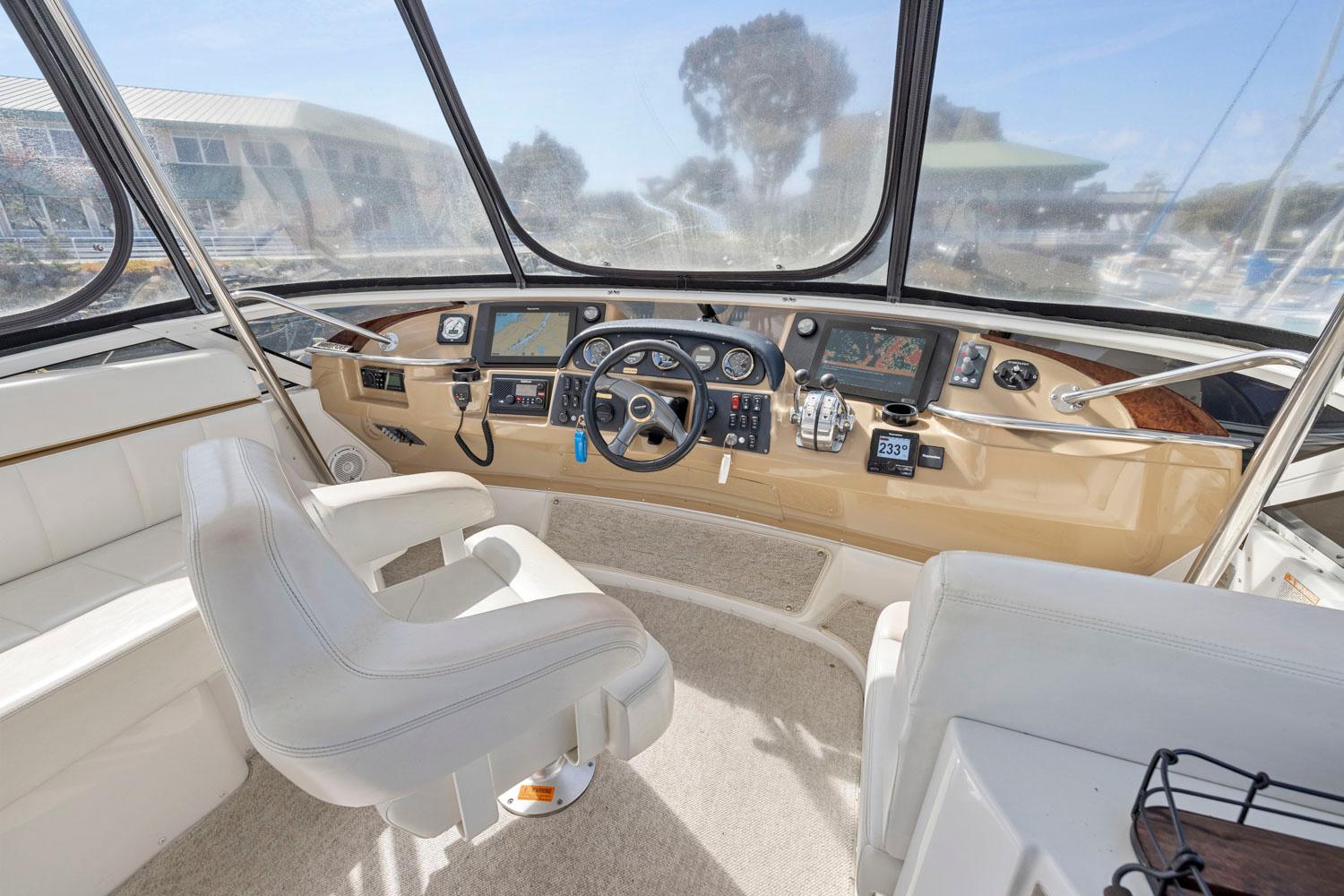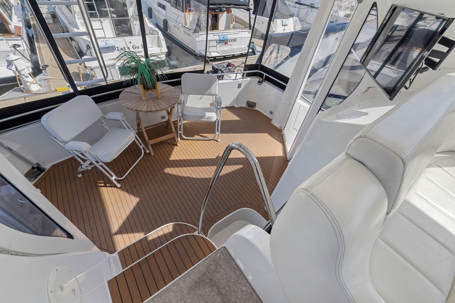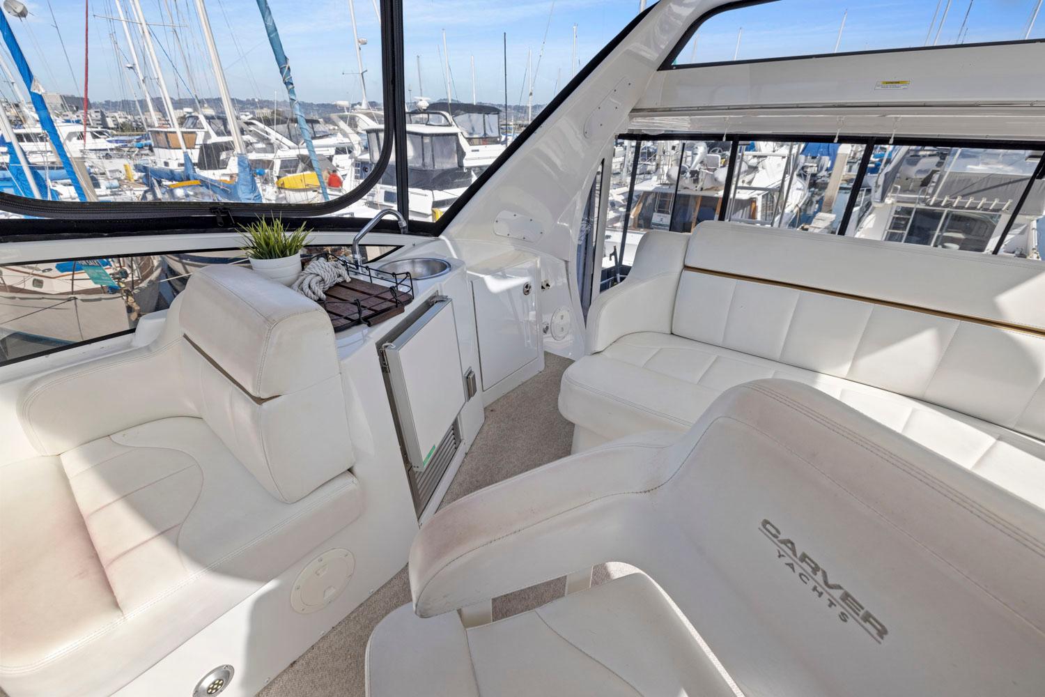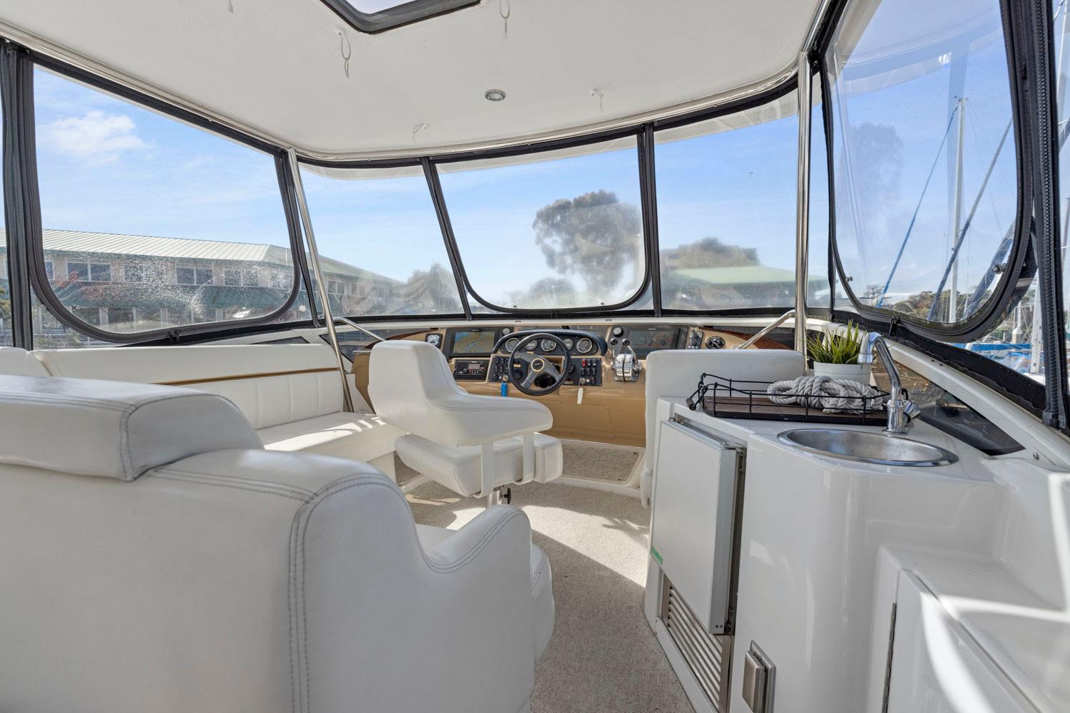 The flybridge is a standout feature of the Carver 444, offering panoramic views and plenty of seating for guests. With its fully equipped, updated, helm station and ample space for lounging, the flybridge is the perfect spot to enjoy the open water.