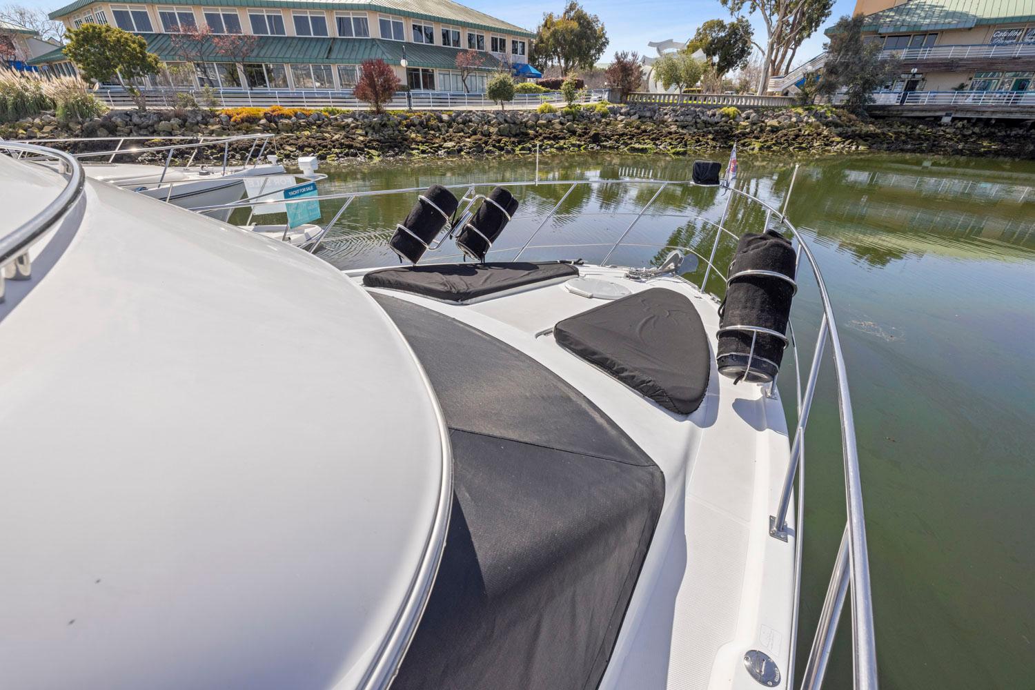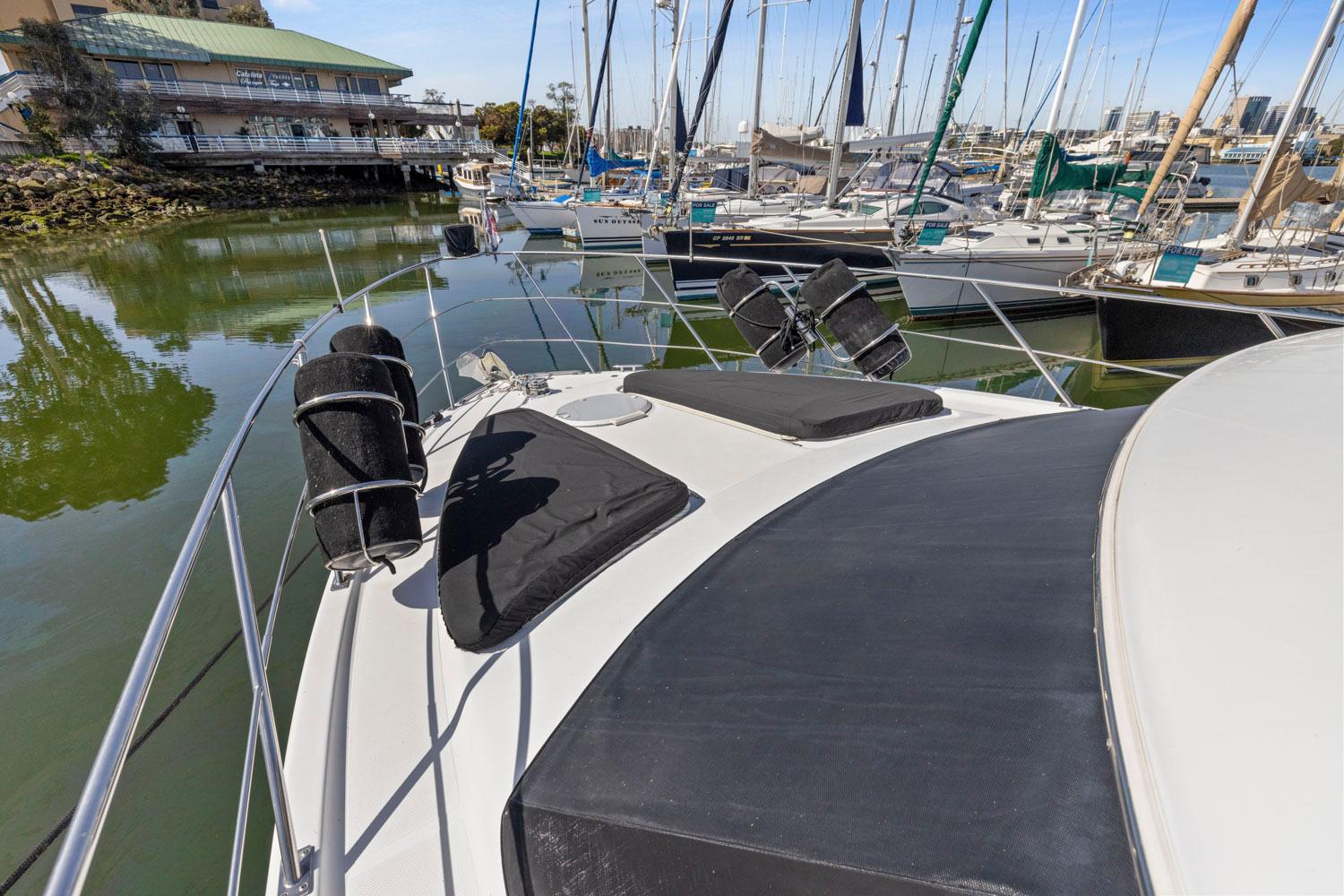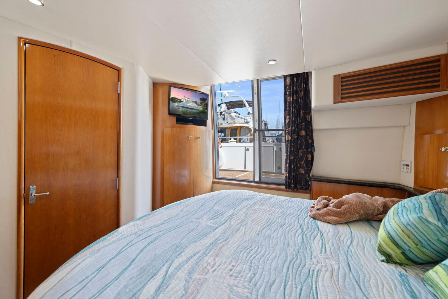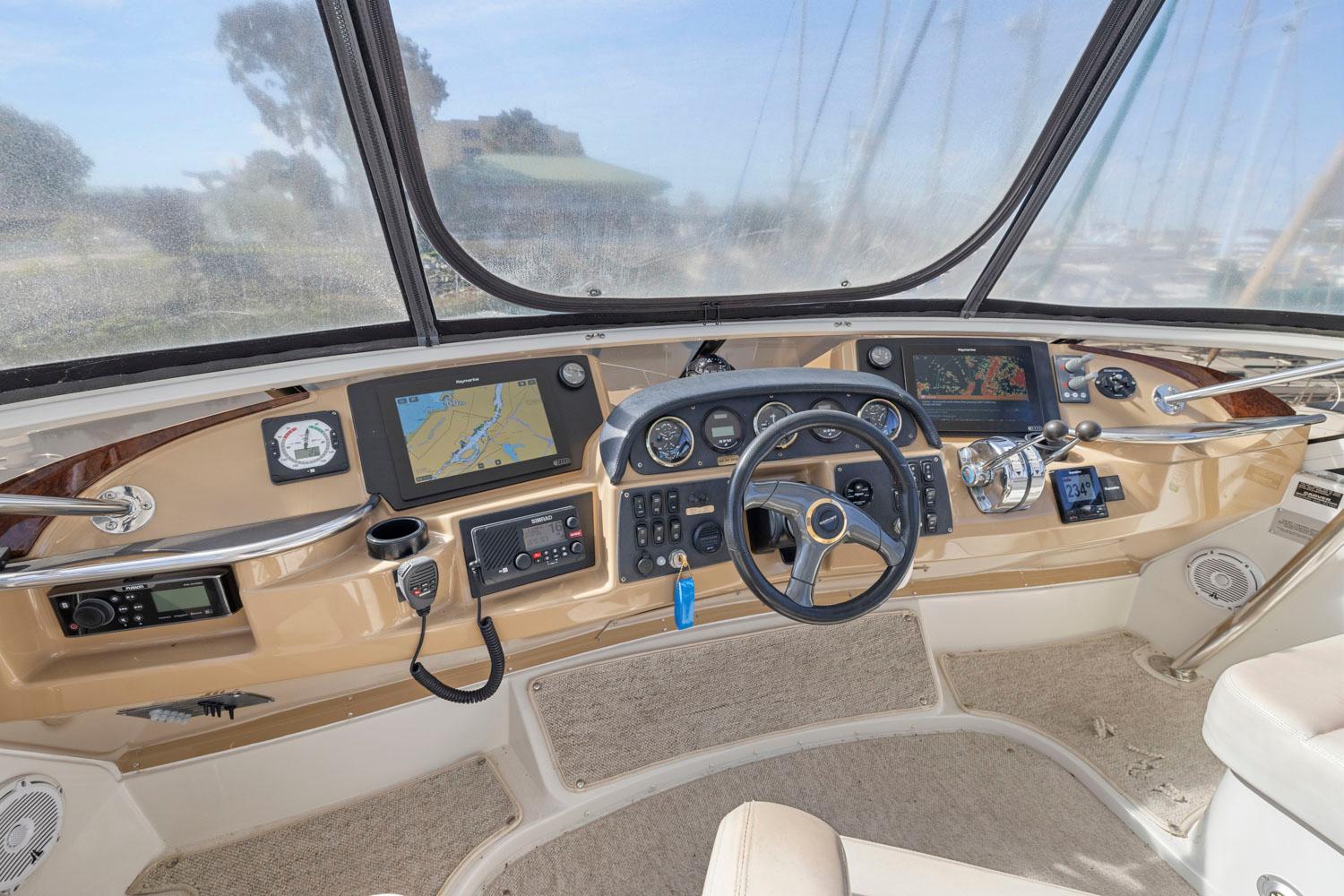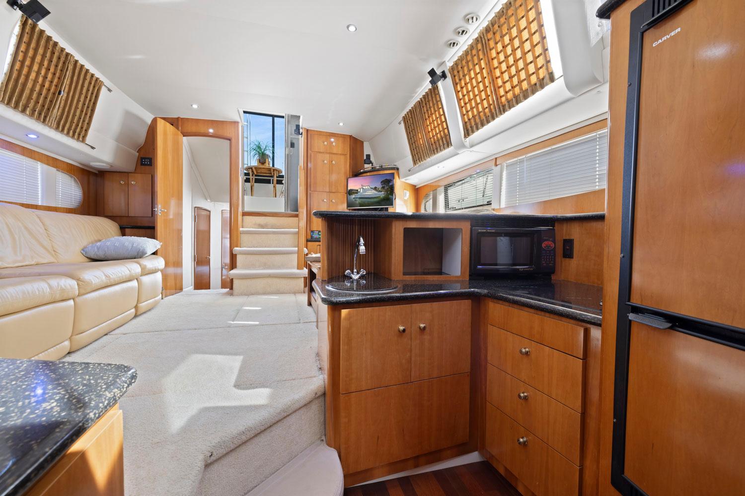 The flybridge is a standout feature of the Carver 444, offering panoramic views and plenty of seating for guests. With its fully equipped, updated, helm station and ample space for lounging, the flybridge is the perfect spot to enjoy the open water.