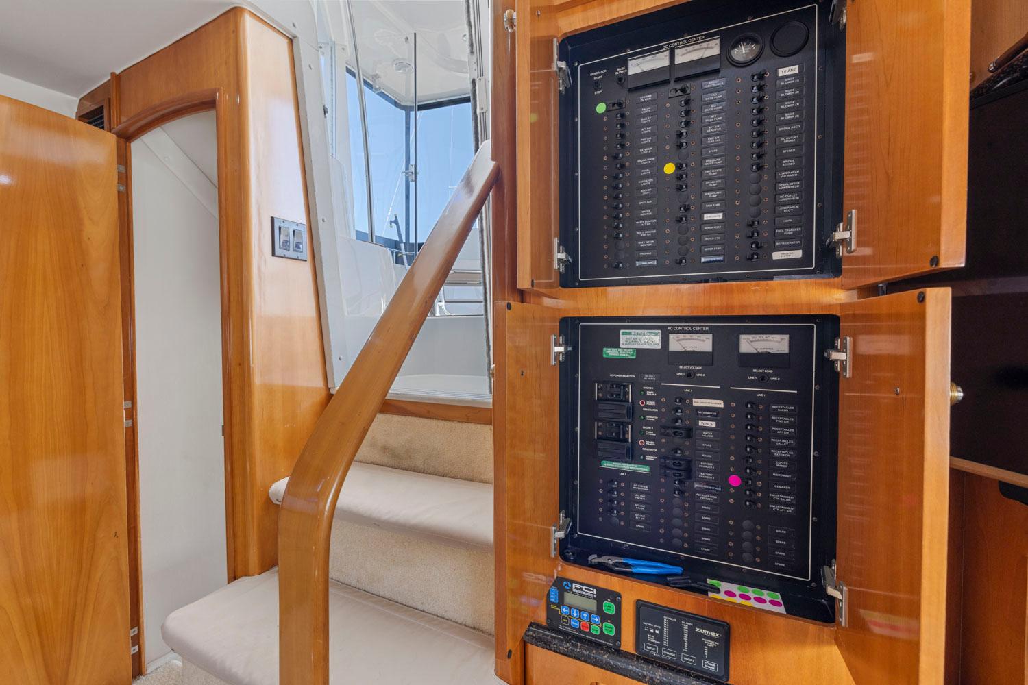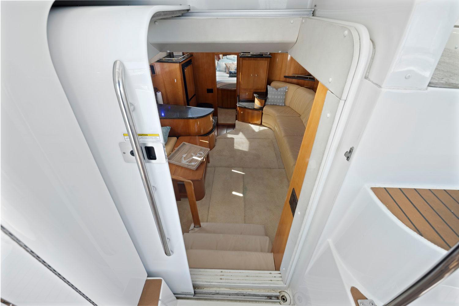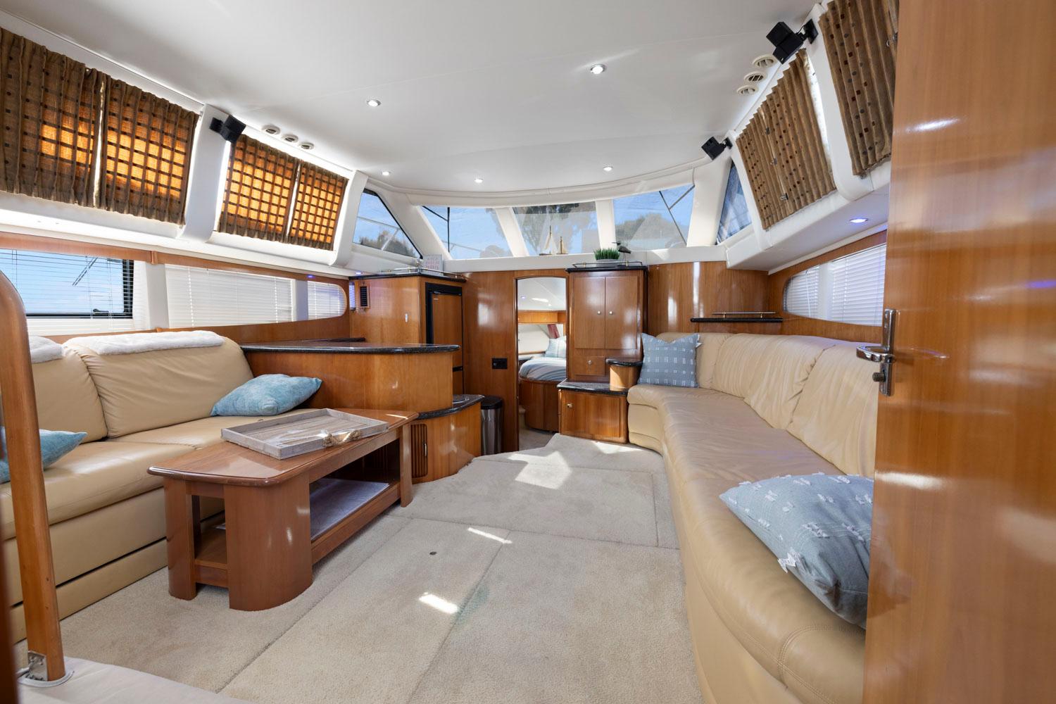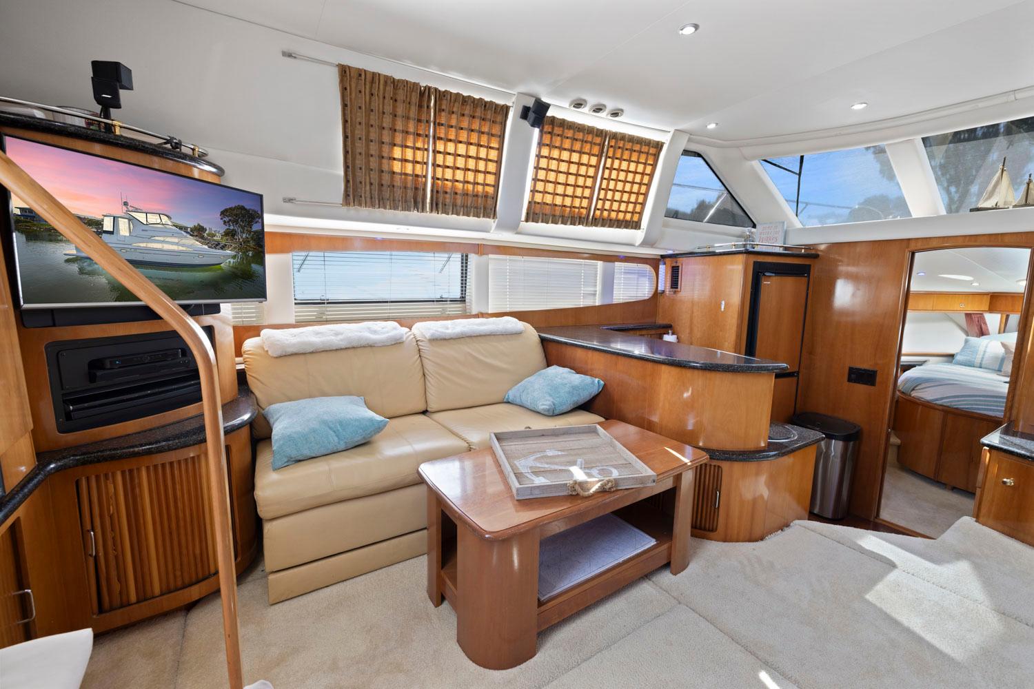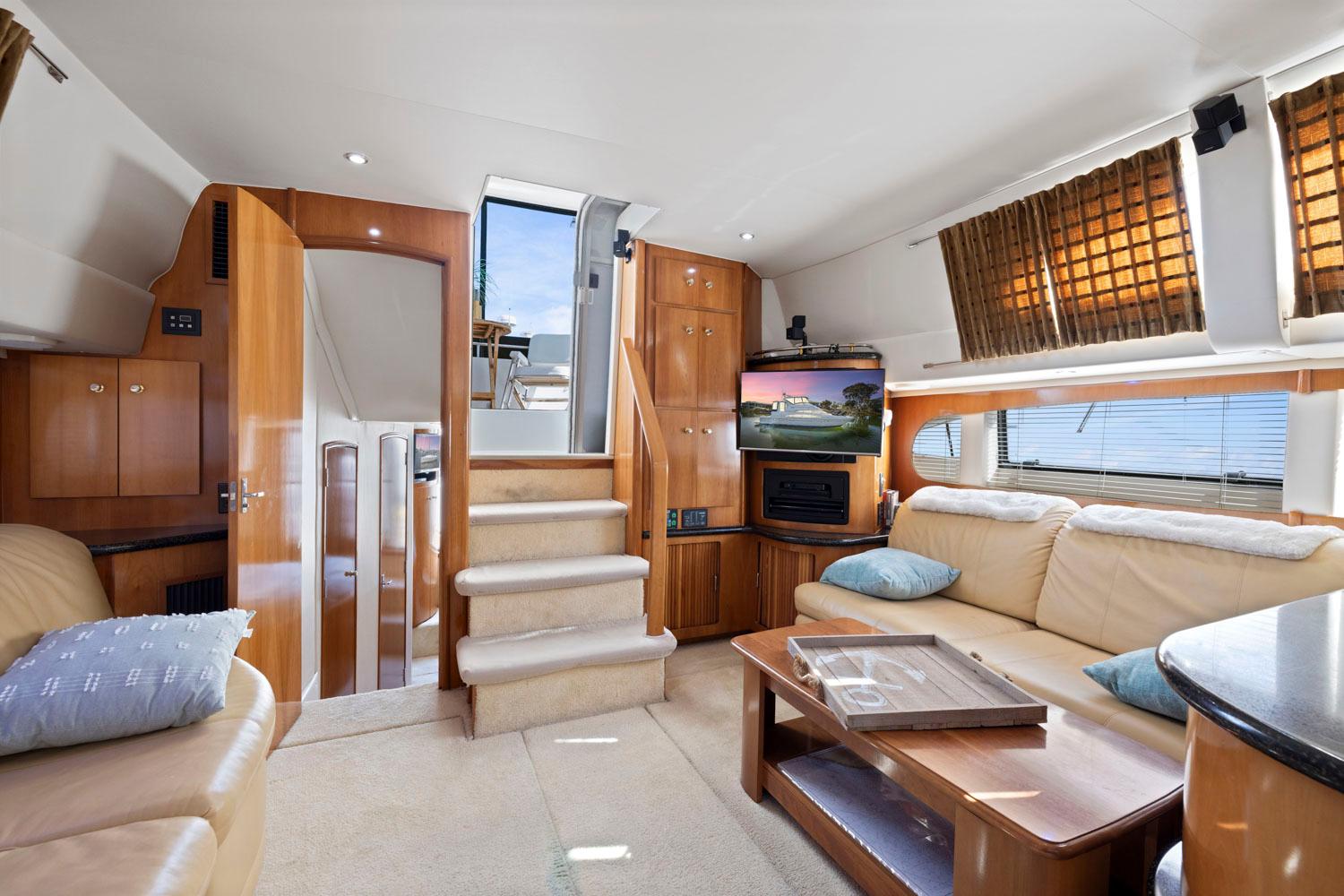 The salon of the 444 is one of the nicest in her class, and “Gone Fishin” is no exception. Two tiered windows and a larger forward windshield provide lots of natural lighting, and allow for great views from wherever you are.