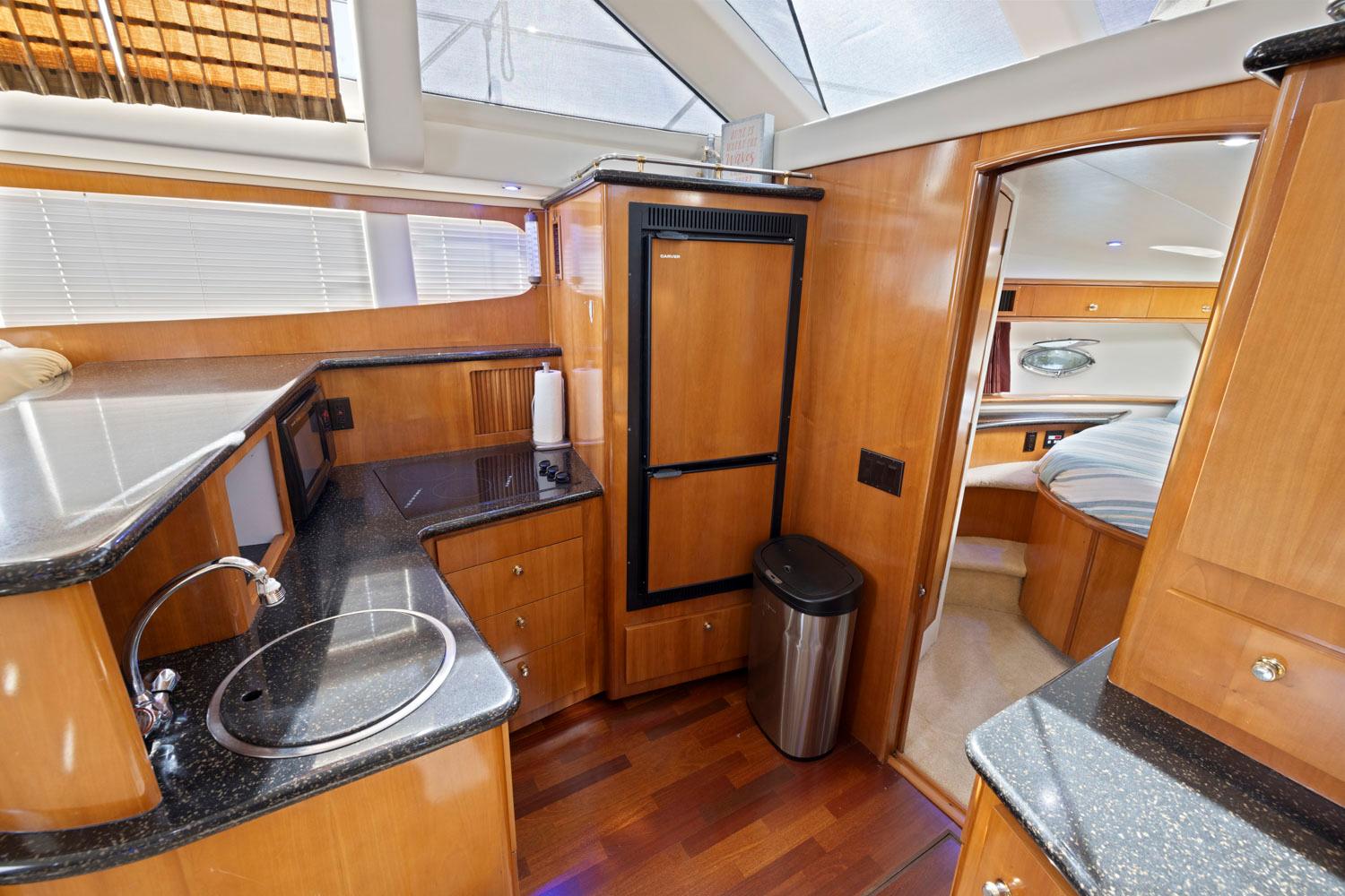 The L shaped galley is only one step down from the salon level with a bar separating the two. This allows for easy entertaining and keeps the chef fully involved in the social scene.