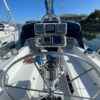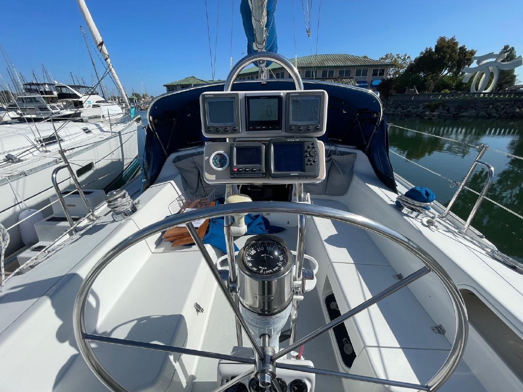 Just forward of the companionway is the adjustable traveler. A blue canvas dodger with a sun shield and stainless grab rails to port, starboard and aft protects the spacious cockpit. Long cockpit seats create an excellent spot for a nap at a quiet anchorage.