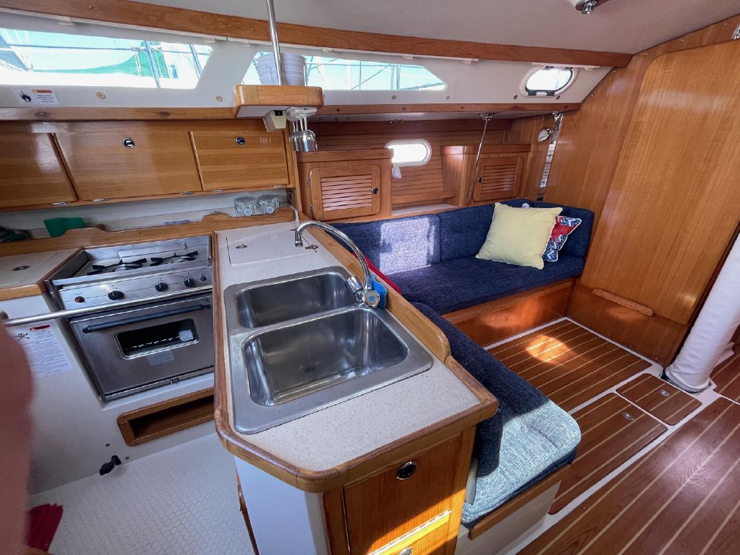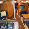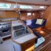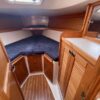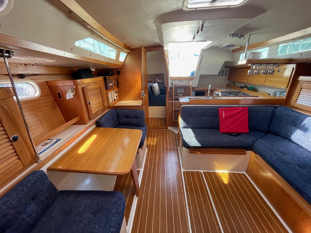 The main salon’s features spacious and comfortable accommodations with seating on both sides. The starboard side of the salon has two seats separated by a breakfast/cocktail table that can be lowered to form a full settee and sleeping area. Forward of the seating are drawers, topped by a counter with an upper storage compartment. The port traditional “L” shaped dinette has storage behind and outboard and can serve as a double berth. The dinette table folds up against the forward bulkhead, opening up the salon. Good light and ventilation are provided by multiple opening ports w/screens, dorade vents, deck hatches. and the companionway. The interior grab rails make movement below decks safe and secure in a seaway.