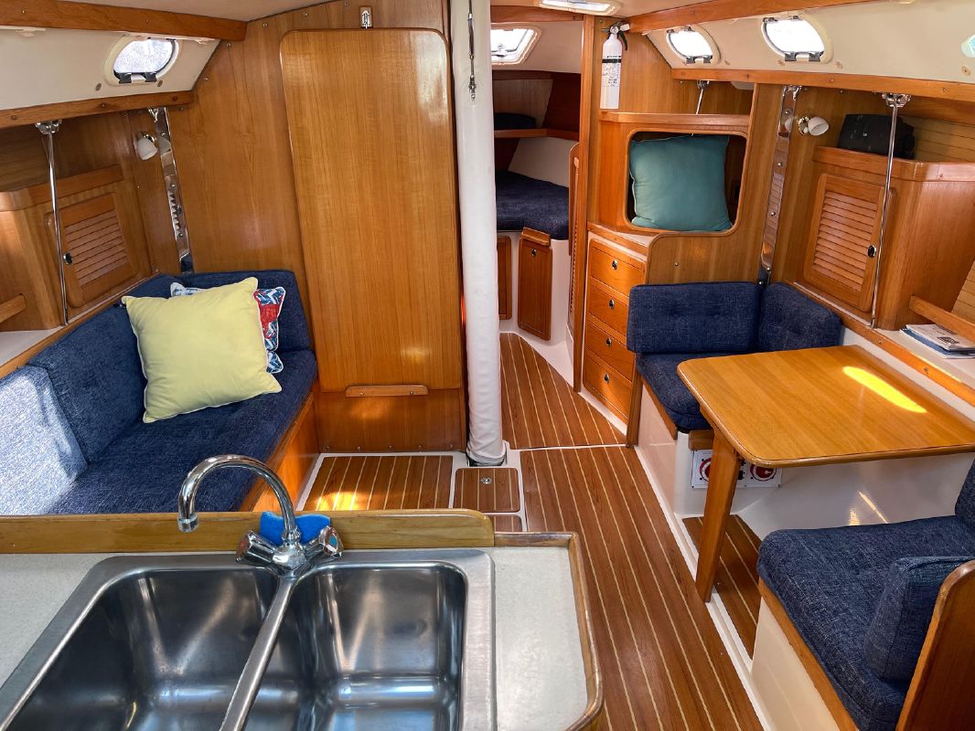 Catalina sailboats are known for their comfortable living spaces. The interior of the Catalina MkII is light and spacious with a comfortable layout. Her interior is varnished teak with teak uppers and trim, multiple opening ports and a durable synthetic teak & holly cabin sole. New interior upholstery 2019.