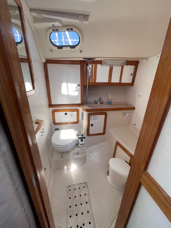 The head is to port with two door, one from the salon and a separate door forward cabin. It has a manual head & holding tank, pressure water, molded countertop and sink, large mirror, handheld shower, shower grate and independent shower sump pump, cabinet, and storage shelves, opening port and deck hatch.