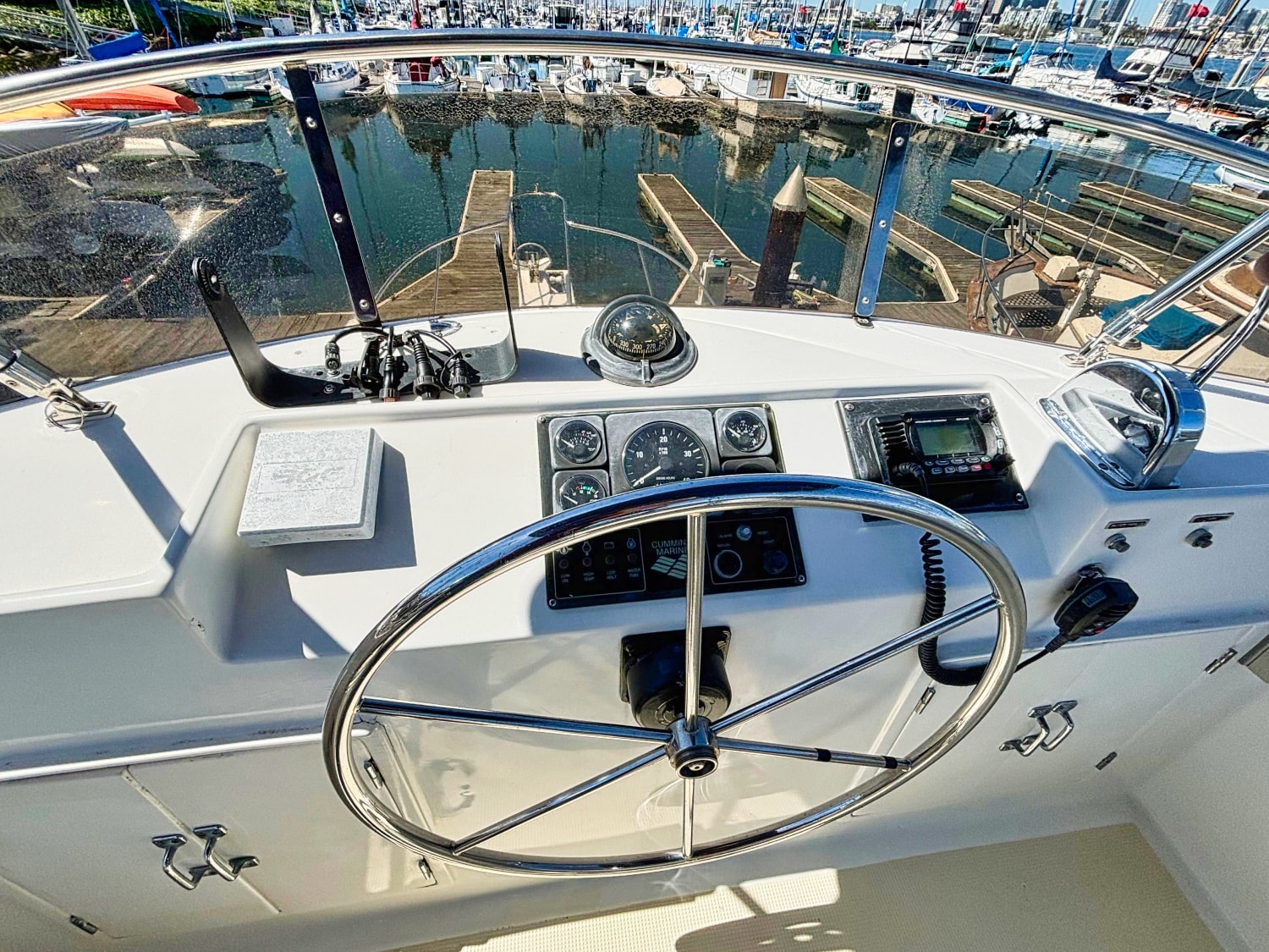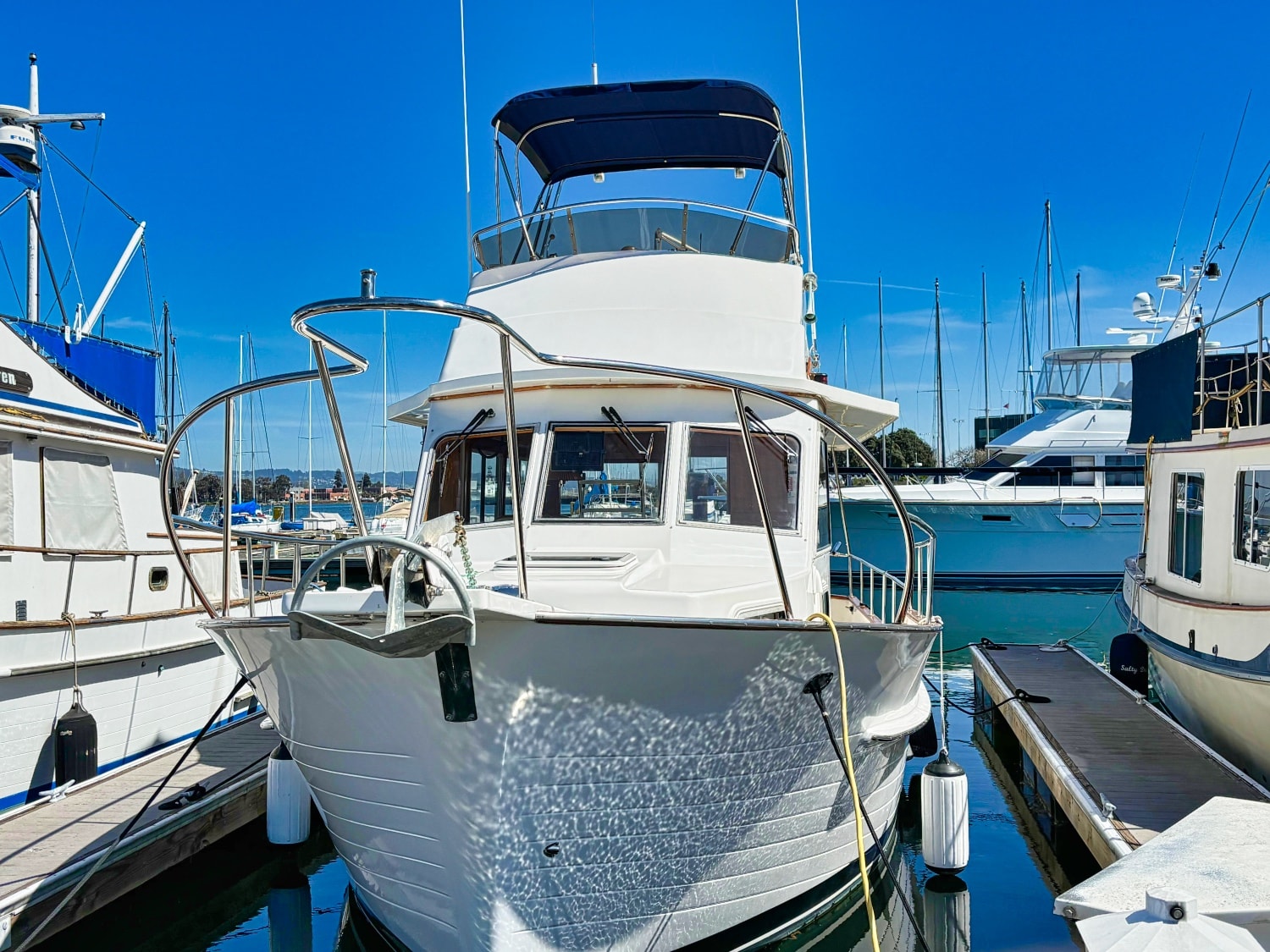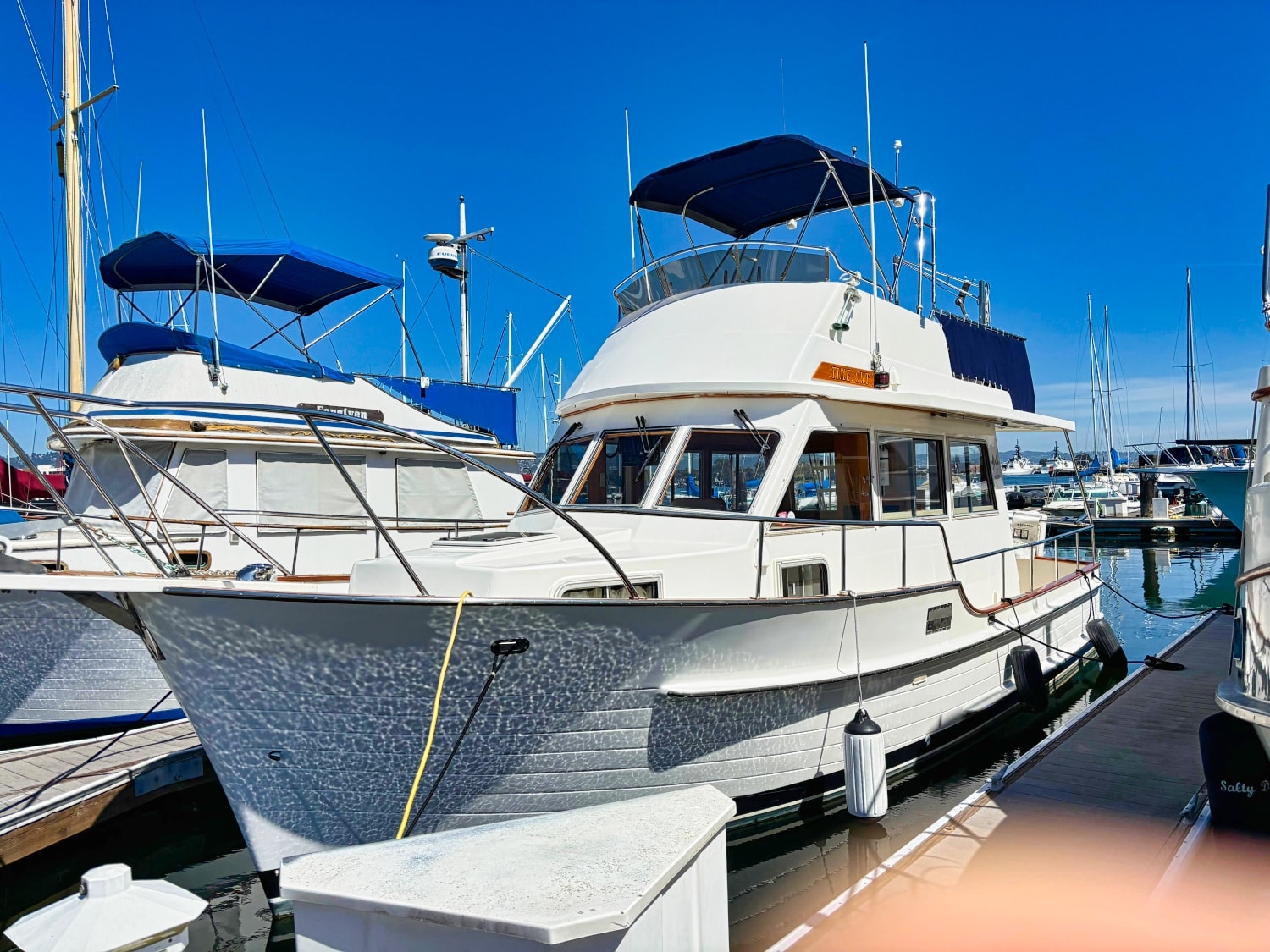 She has a recently serviced Cummins 6BT5.9-M inboard diesel engine with interior helm and flybridge helm stations. The flybridge canvas was replaced in 2023.