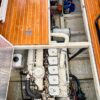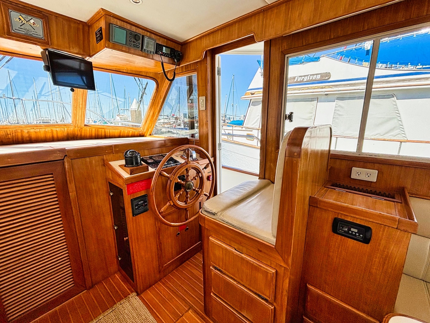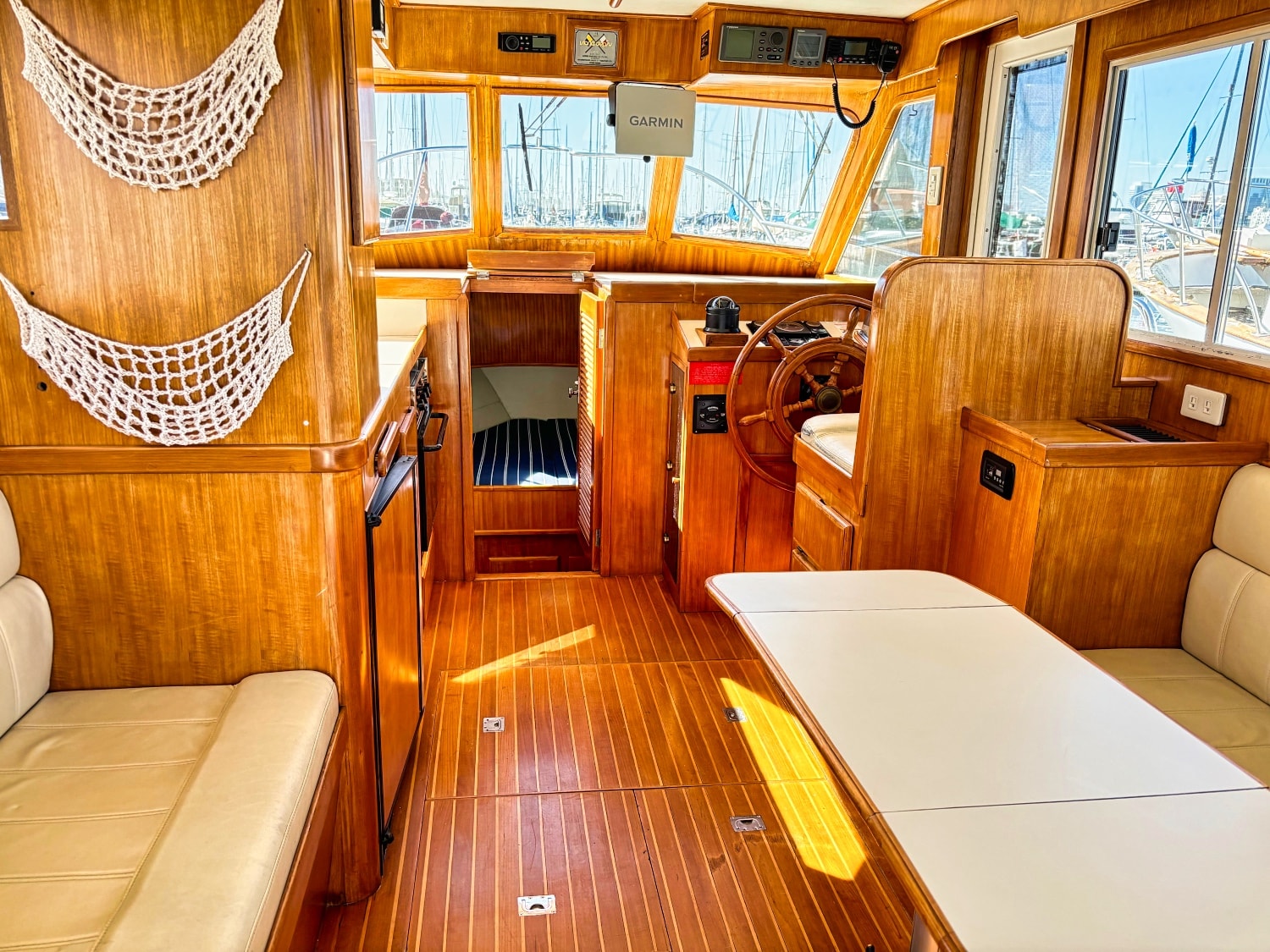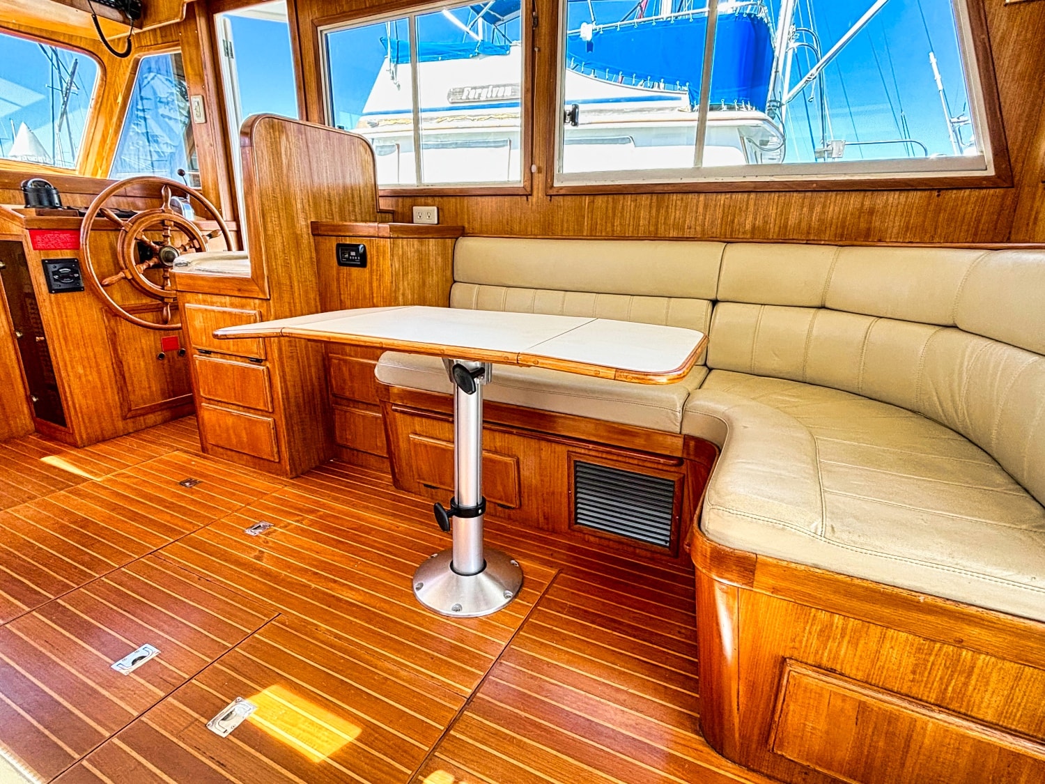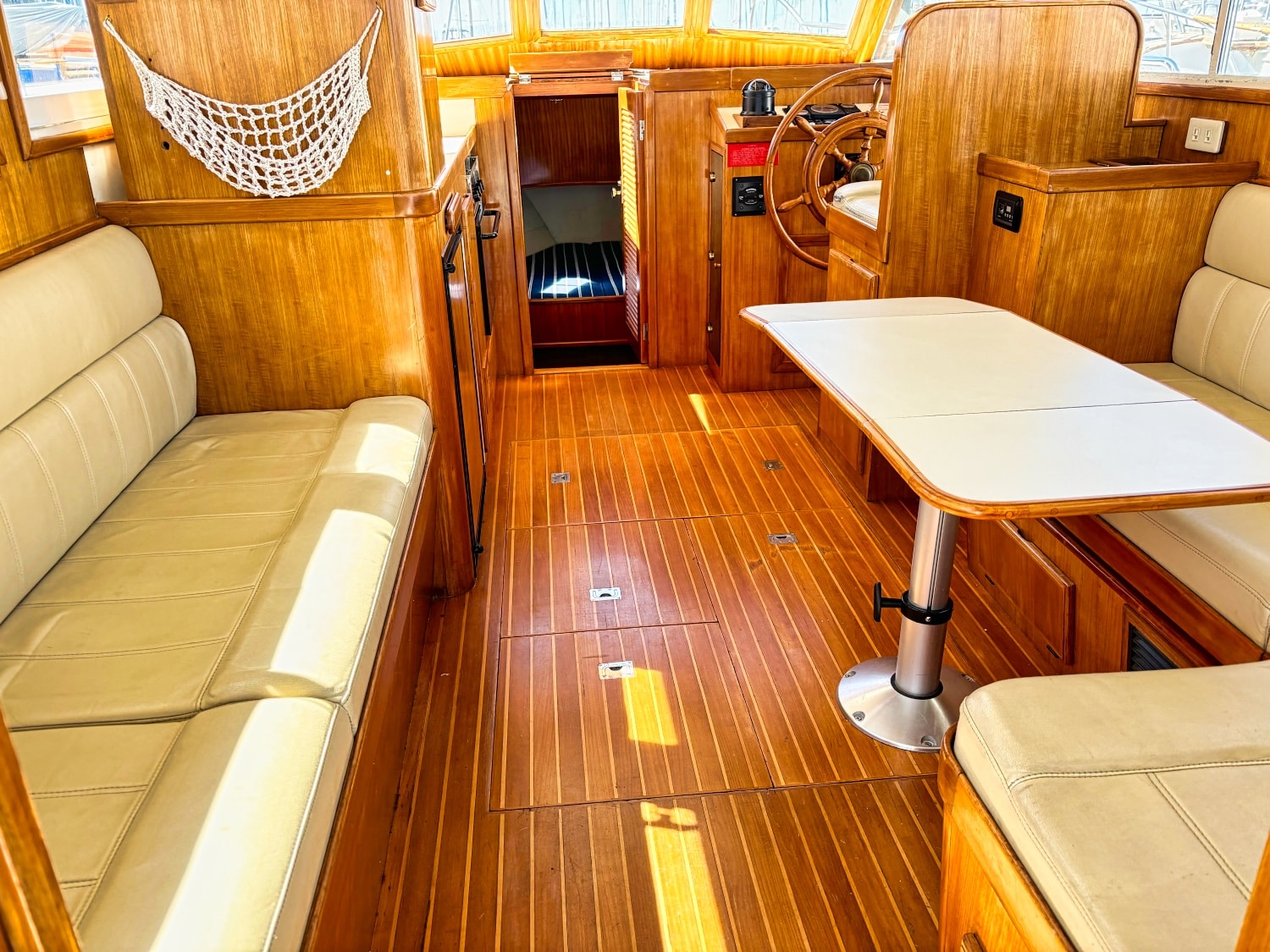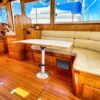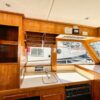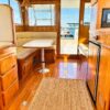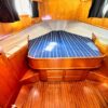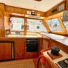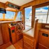 Helm station on starboard side with 24″ teak spoke steering wheel and engine instrumentation, chart locker and helm seat. Includes folding footrest. Hinging helm door adjacent to lower steering station with keyed lock. Easily accessible control panel to left of helm. Bar with bottle and glass storage cabinet located starboard behind the helm seat.