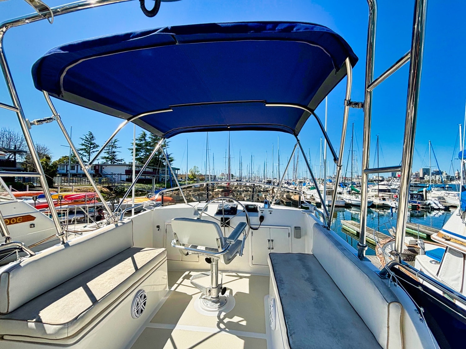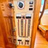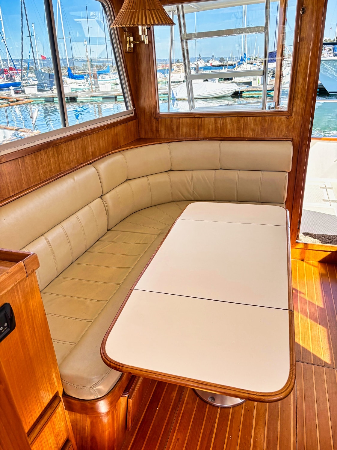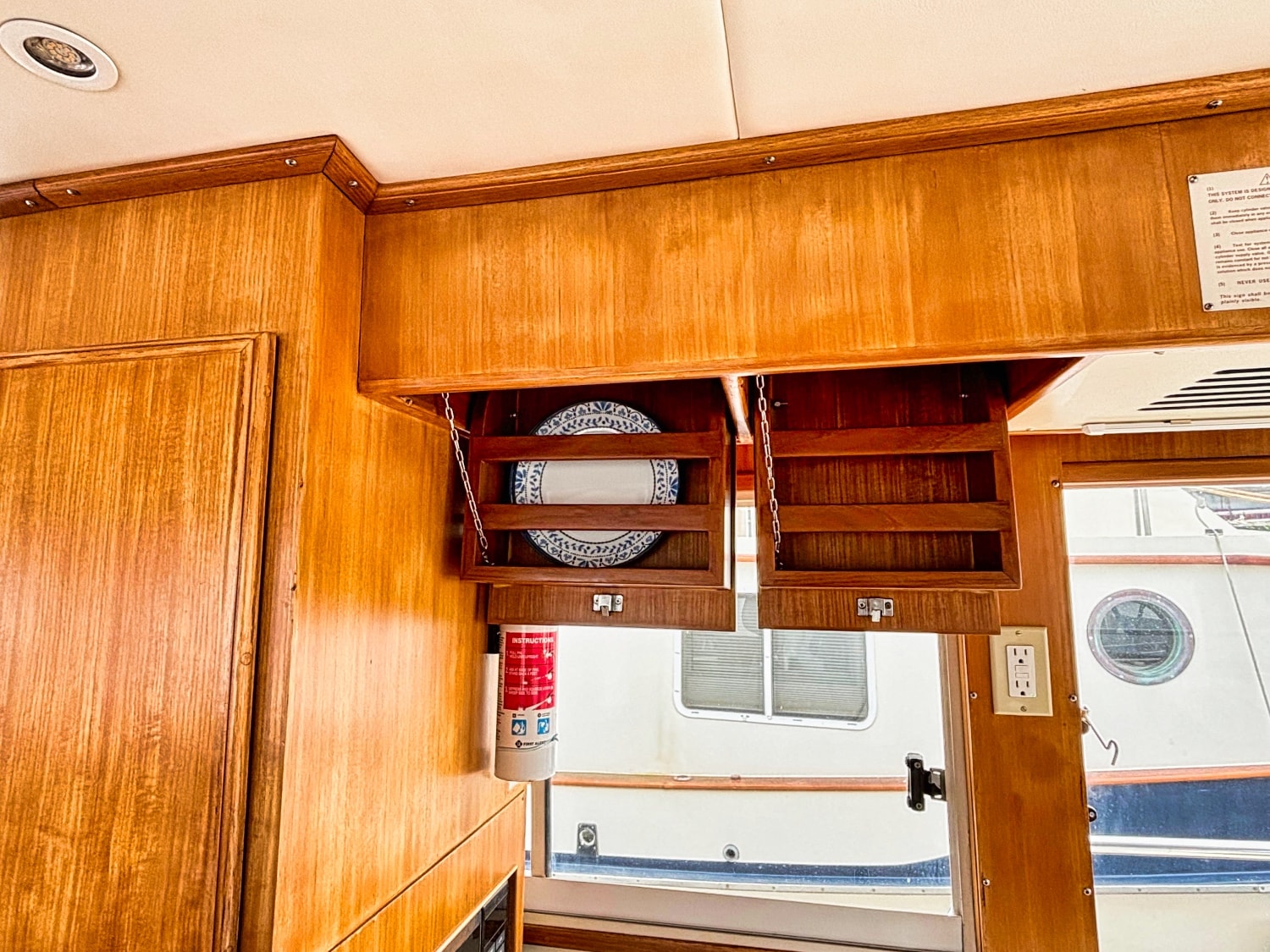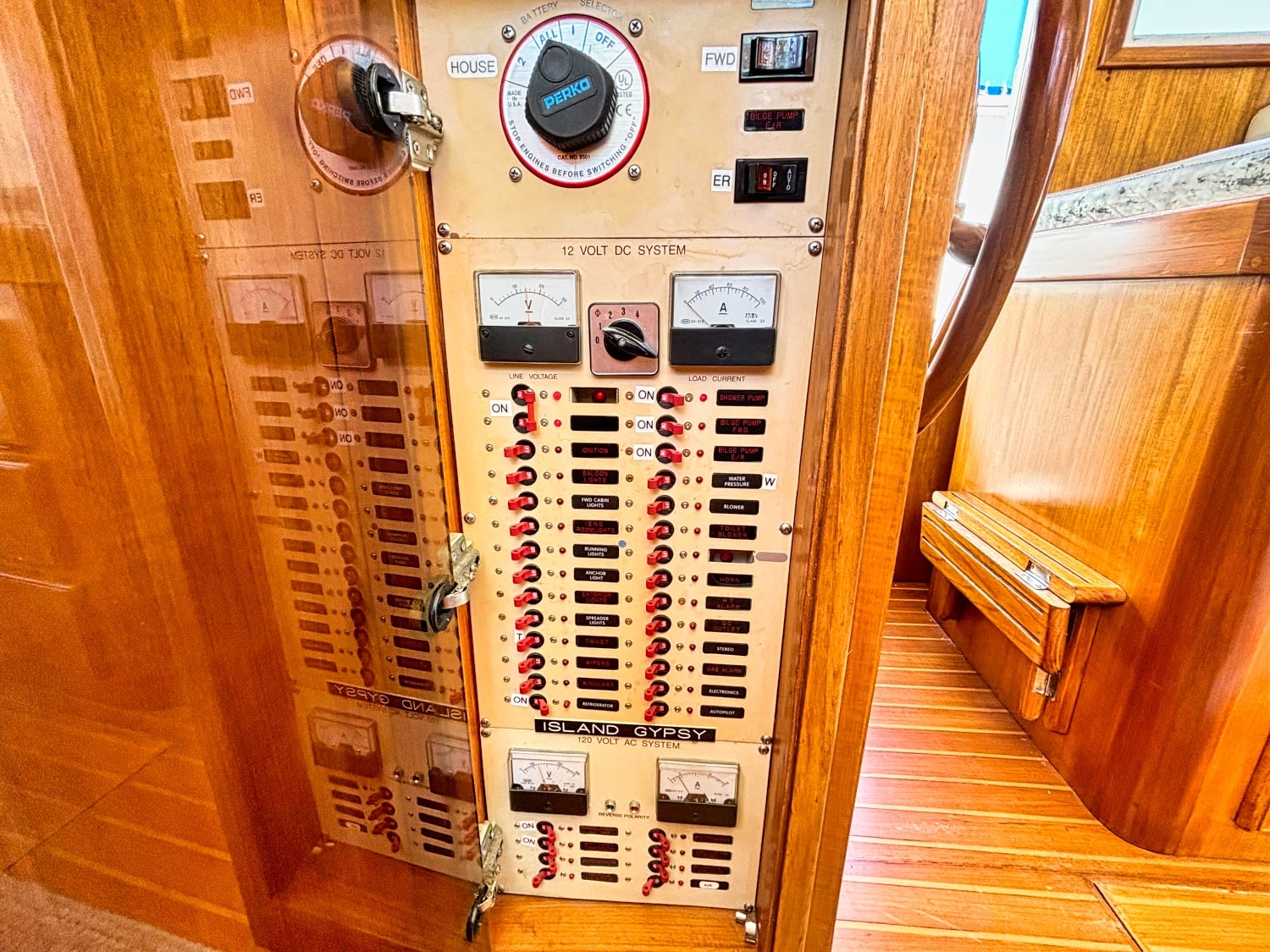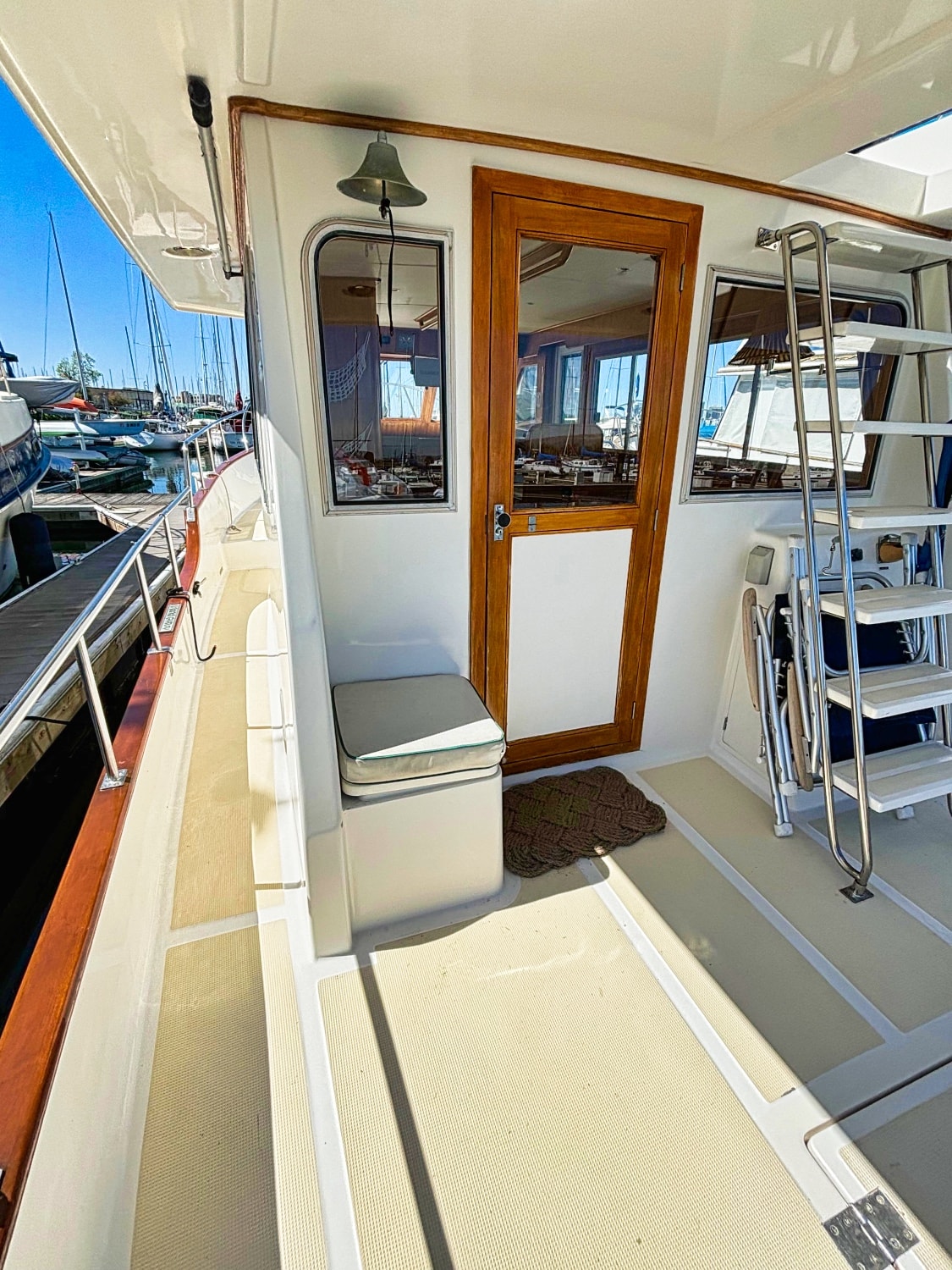Helm station on starboard side with 24″ teak spoke steering wheel and engine instrumentation, chart locker and helm seat. Includes folding footrest. Hinging helm door adjacent to lower steering station with keyed lock. Easily accessible control panel to left of helm. Bar with bottle and glass storage cabinet located starboard behind the helm seat.