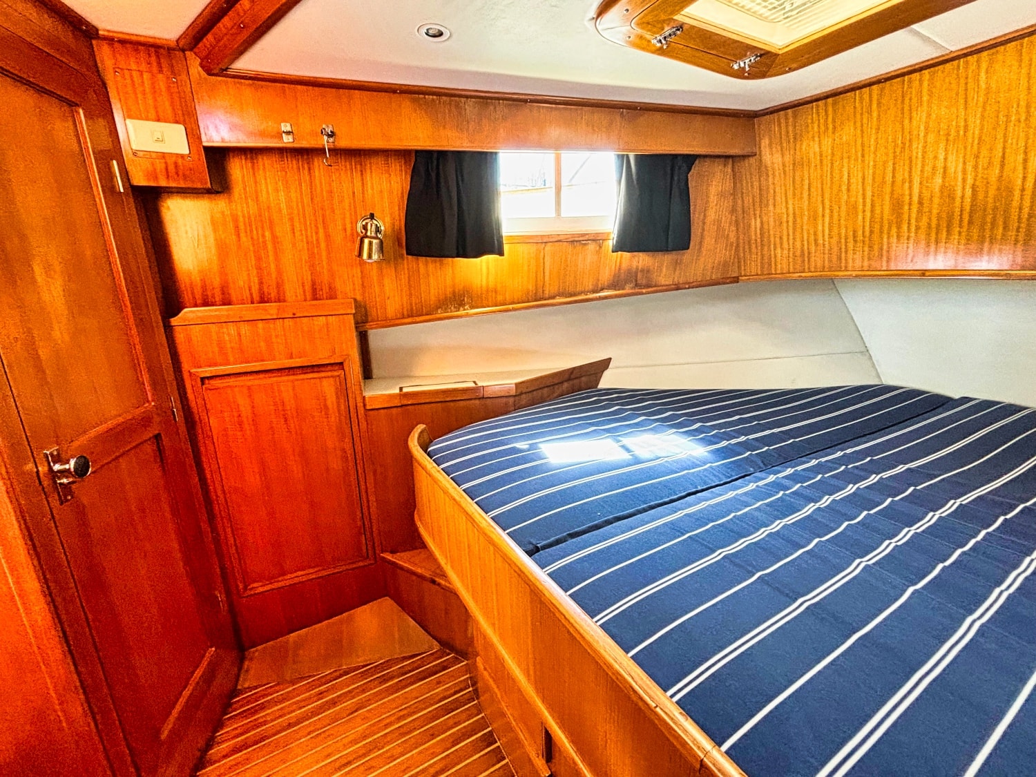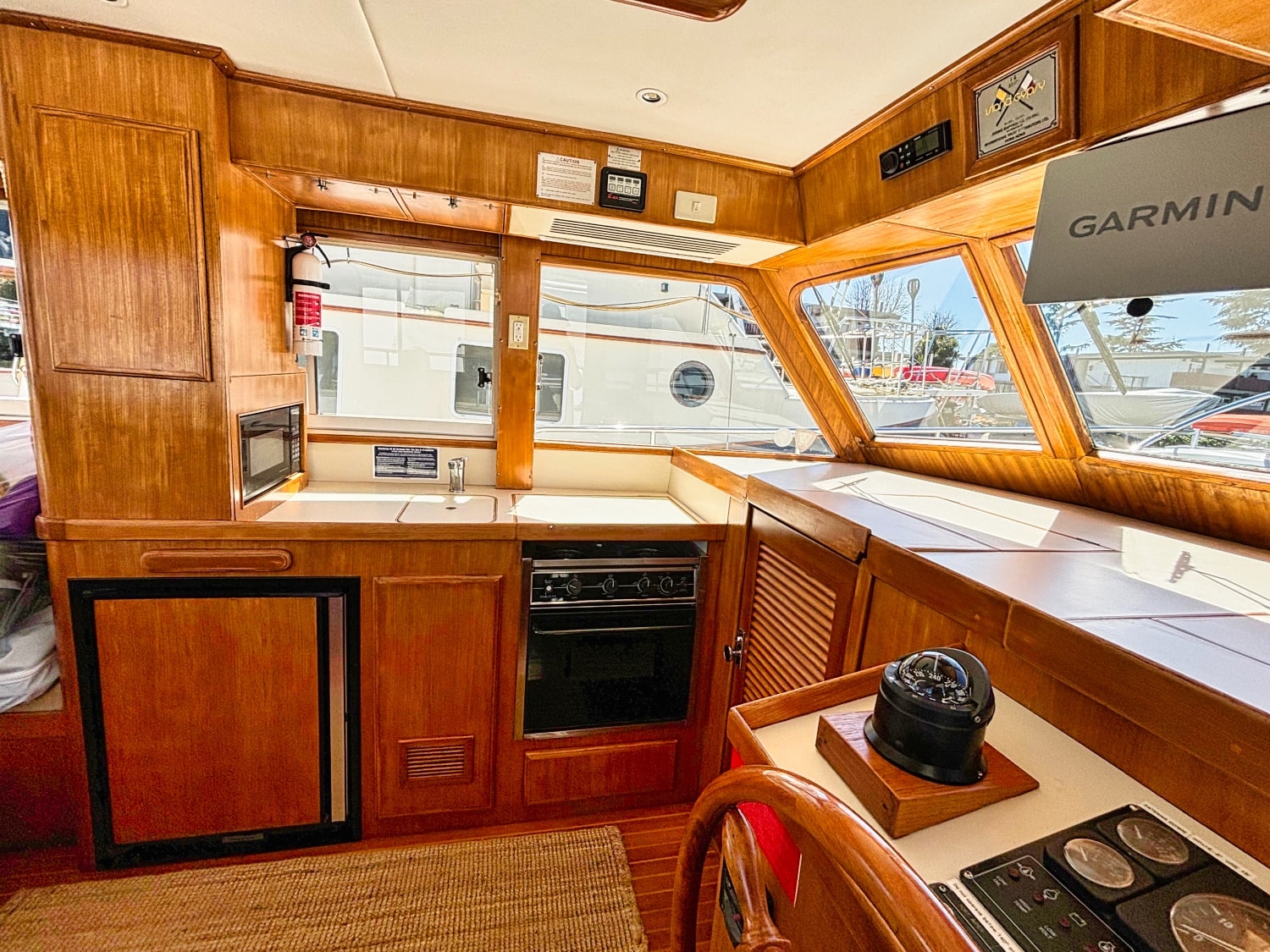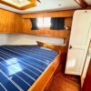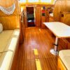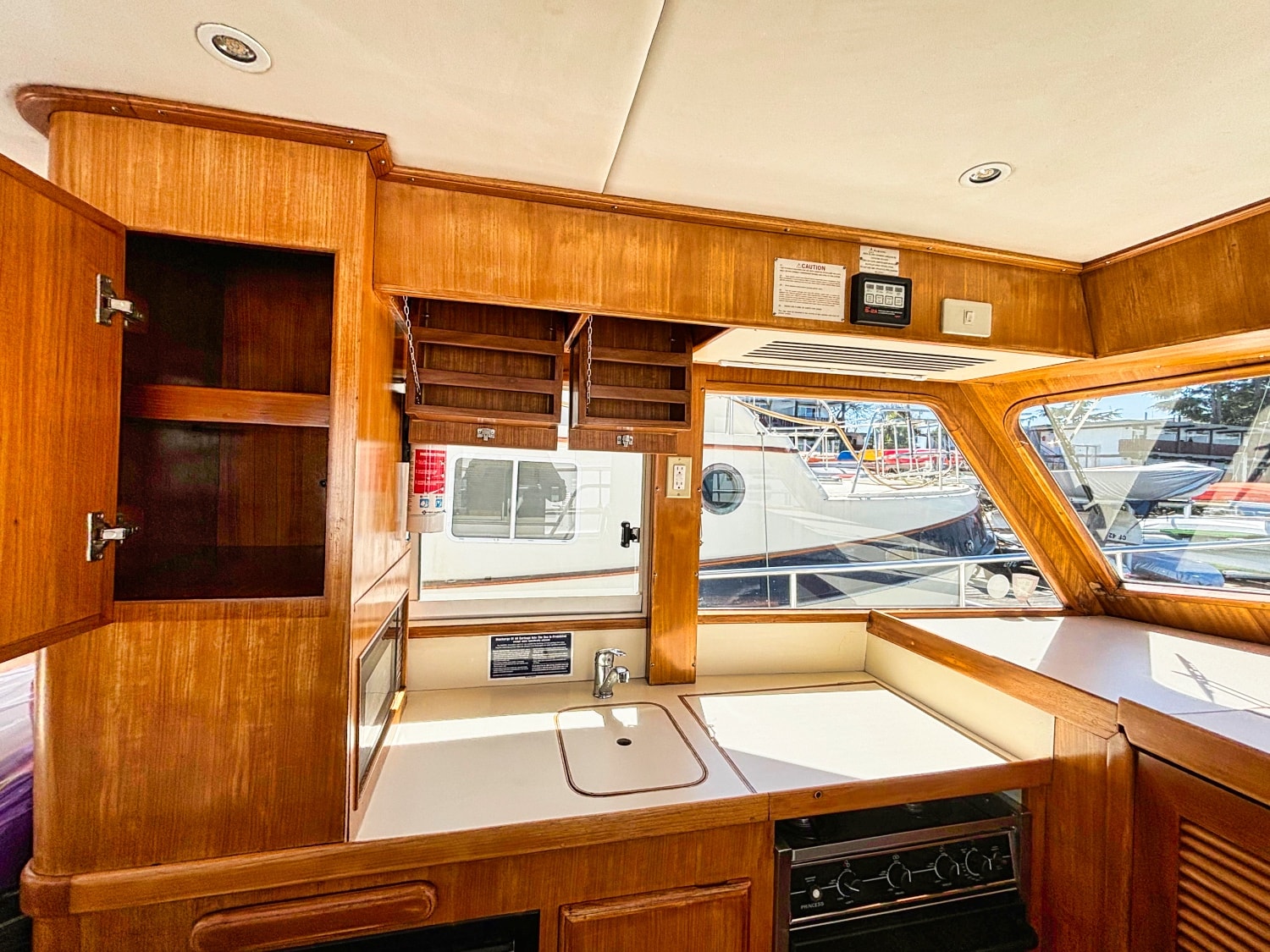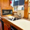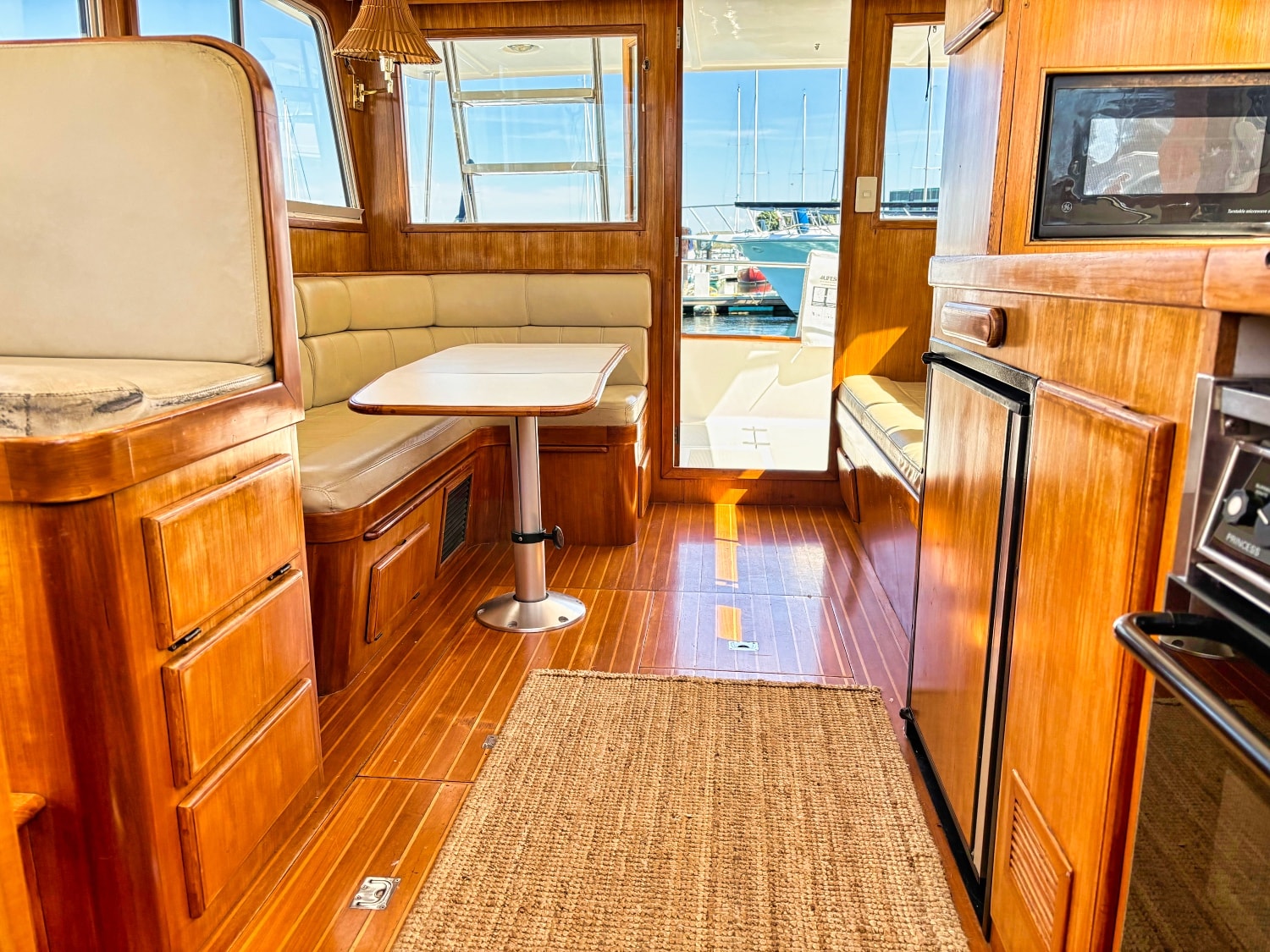 Easy boarding from the swim platform through the hinged transom door onto the large hard covered aft deck. Enter the salon through the full size door. Cabin sole is teak and holly. Salon has a built in “L” settee to starboard with drawer and storage under, plus bench seat to port with ice box & storage under. Hi-lo teak dinette table. Folds down to form occasional double bed. All furniture & bulkheads are golden Burmese teak in satin finish. The interior helm station is on the starboard side with a full galley on port. Norcold AC/DC refrigerator, 3 burner Princess propane stove with oven. Stainless steel sink with cover & single lever swivel type faucet. Overhang locker with microwave cabinet and AC outlet next to sink.