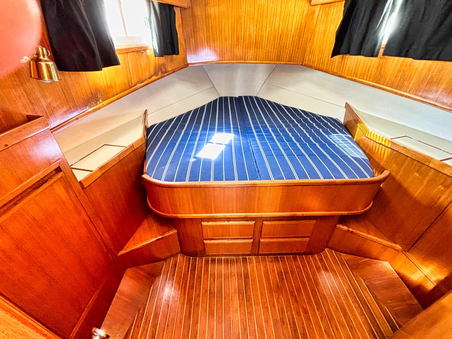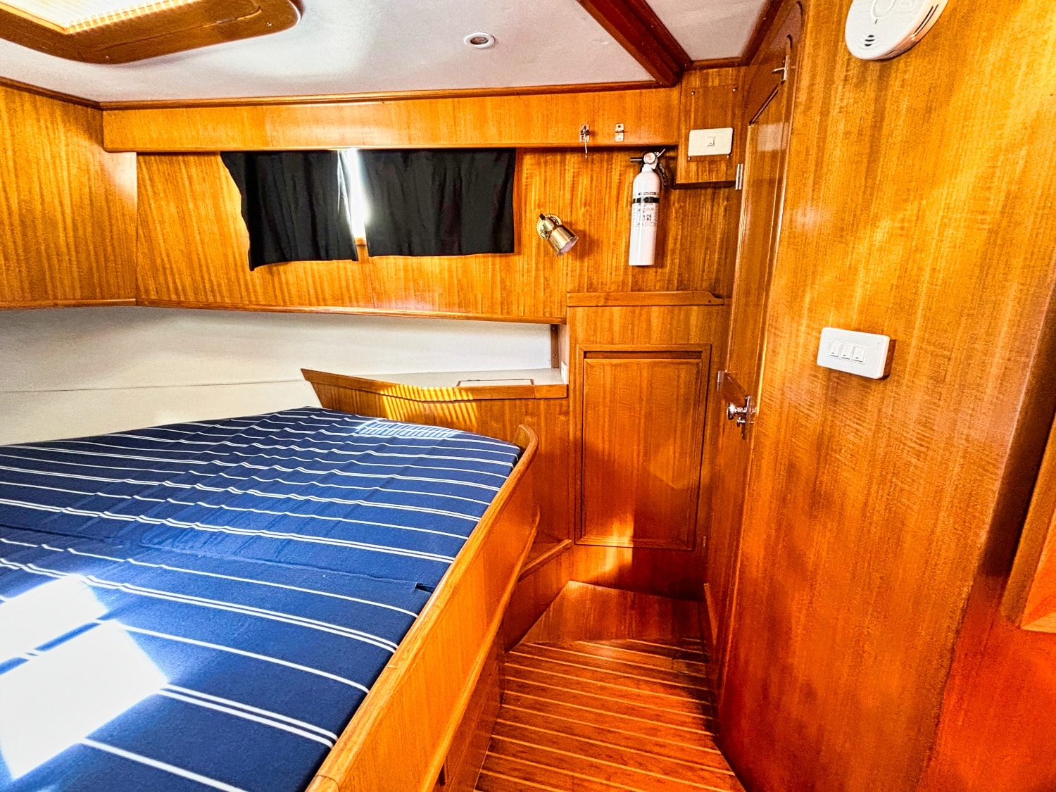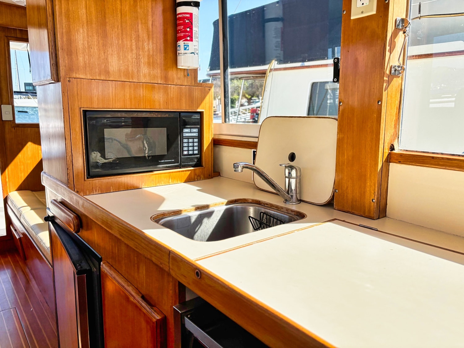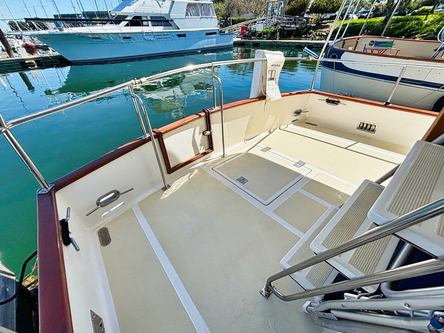 Easy boarding from the swim platform through the hinged transom door onto the large hard covered aft deck. Enter the salon through the full size door. Cabin sole is teak and holly. Salon has a built in “L” settee to starboard with drawer and storage under, plus bench seat to port with ice box & storage under. Hi-lo teak dinette table. Folds down to form occasional double bed. All furniture & bulkheads are golden Burmese teak in satin finish. The interior helm station is on the starboard side with a full galley on port. Norcold AC/DC refrigerator, 3 burner Princess propane stove with oven. Stainless steel sink with cover & single lever swivel type faucet. Overhang locker with microwave cabinet and AC outlet next to sink.