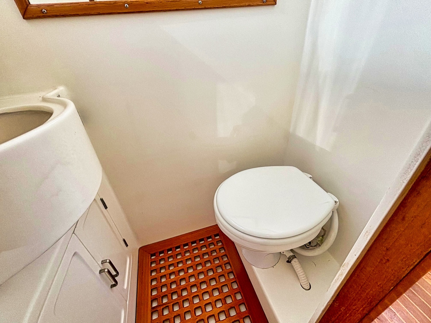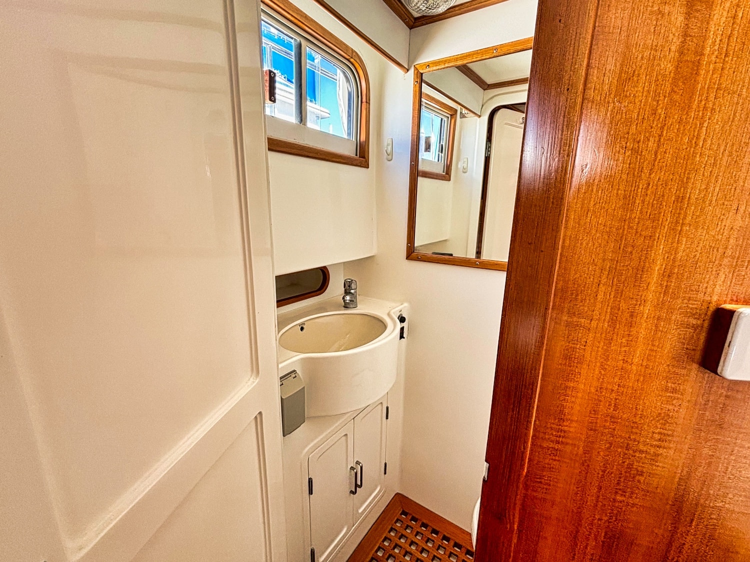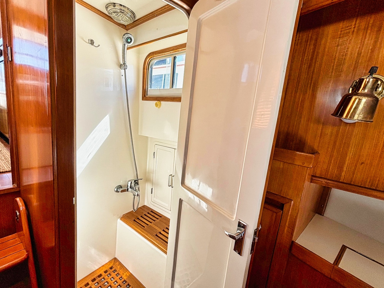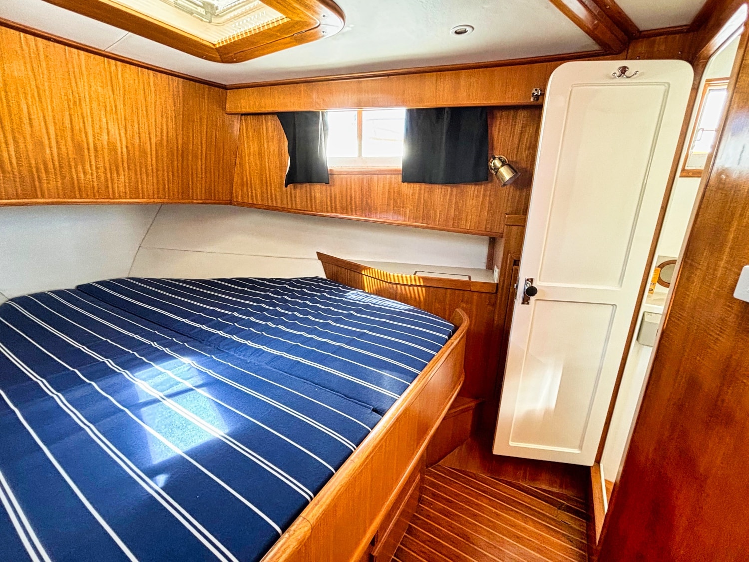 Three stairs down is the head located on port which includes a vanity unit fitted with CORIAN wash basin moulded-in counter top with back splash and single lever faucet. Shower located to starboard with moulded fiberglass and removable teak grating panel.